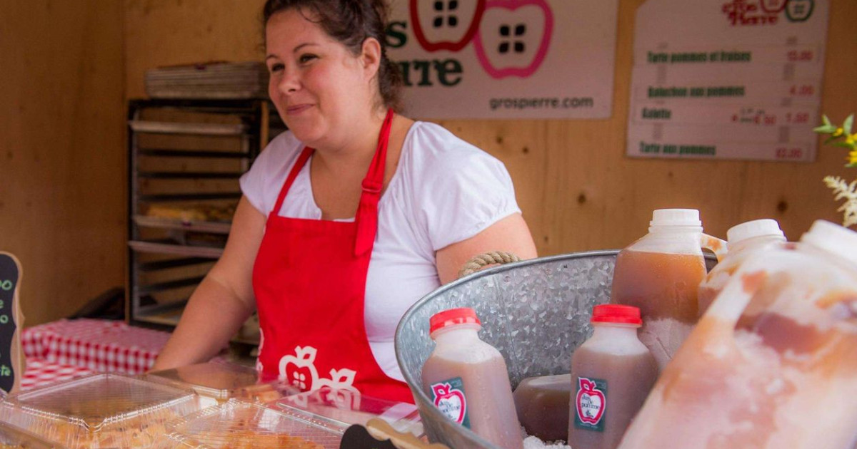 Tartes aux pommes, baluchons, galettes, croustilles, jus, pâtisseries et gelée.