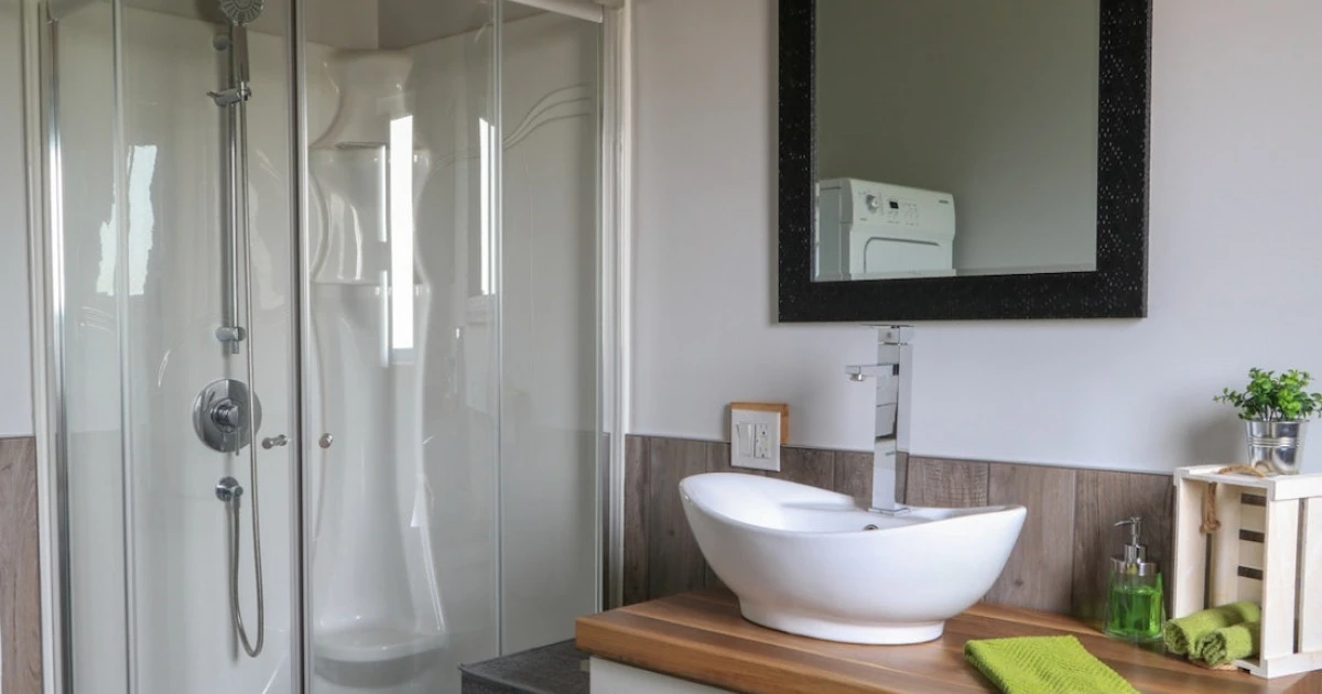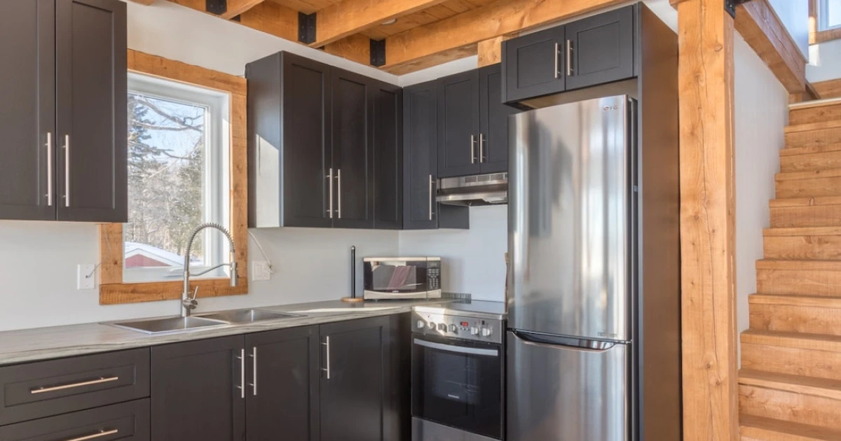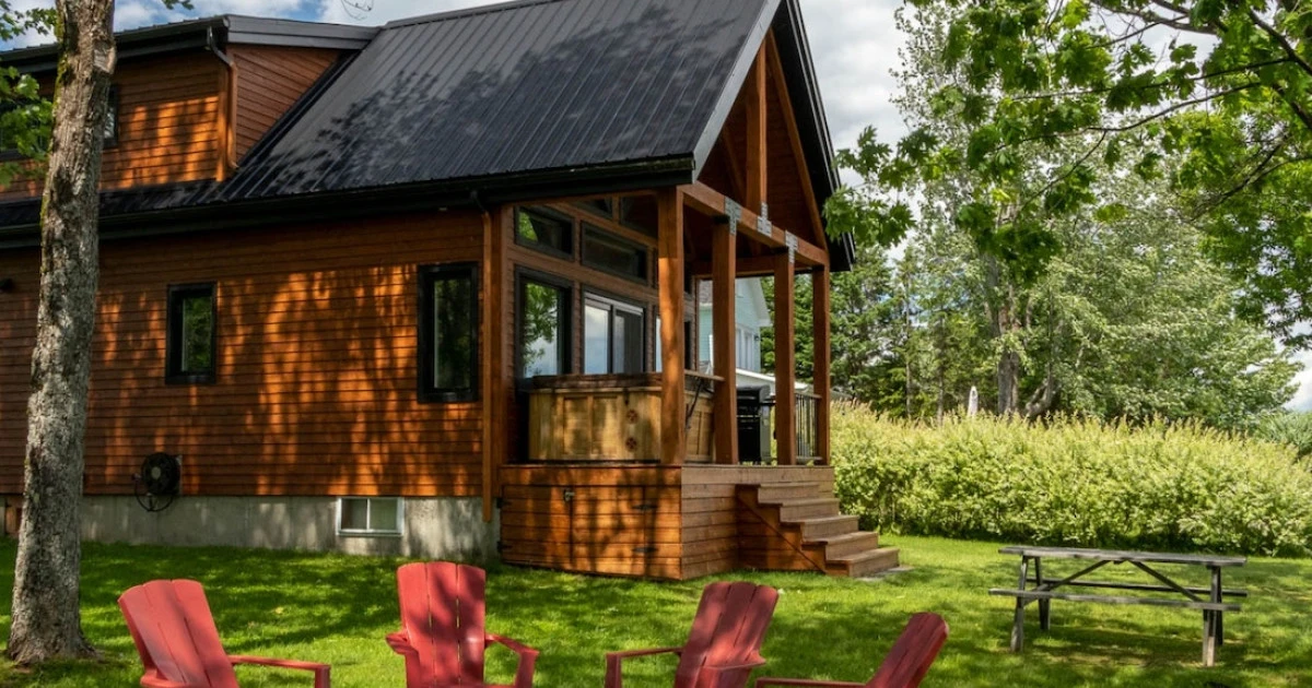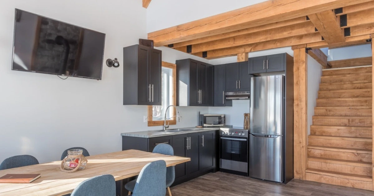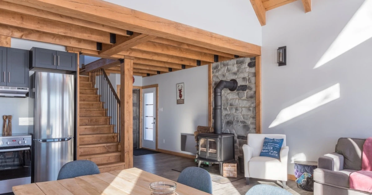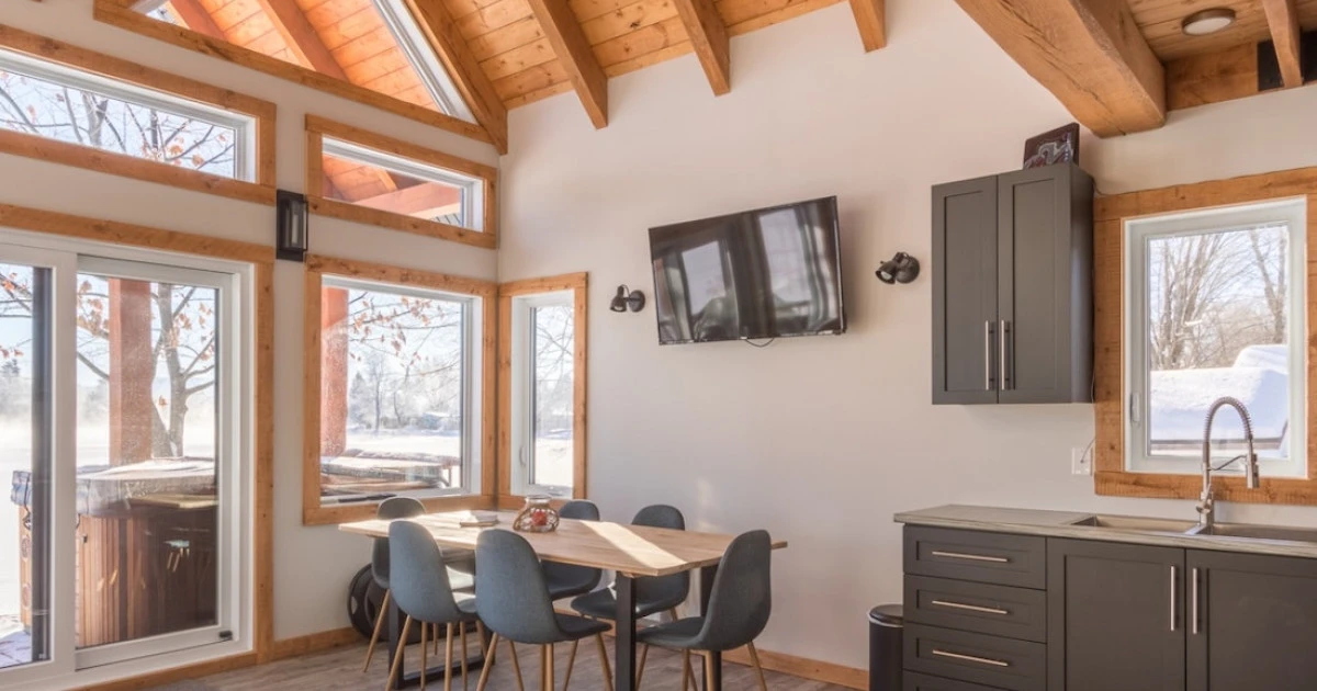 Rez-de-chaussée : aire ouverte avec cuisine, salle à manger et salon vitré, foyer (bois fourni) + salle de bain avec douche