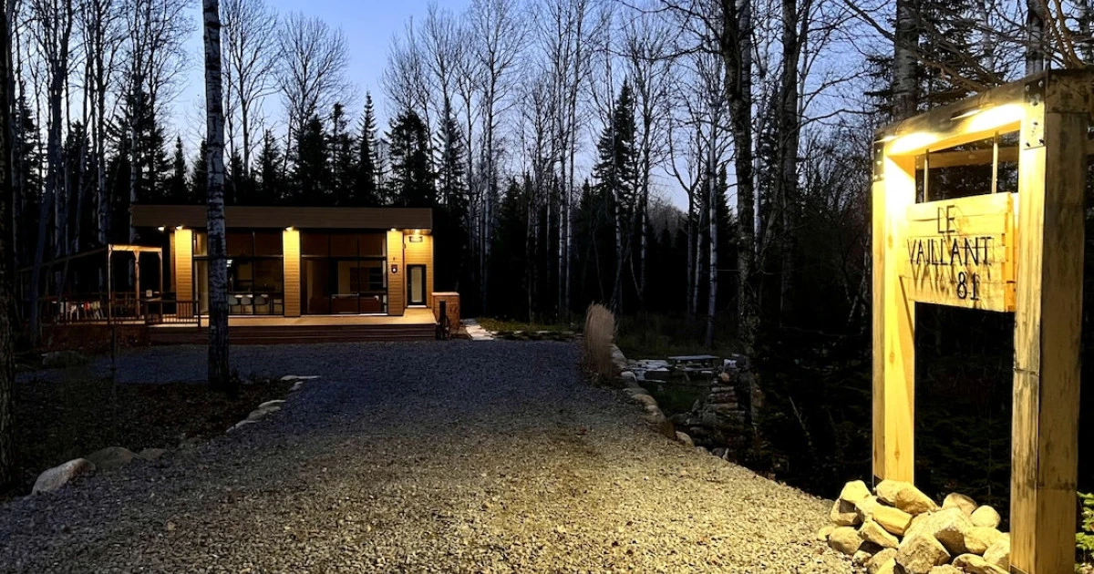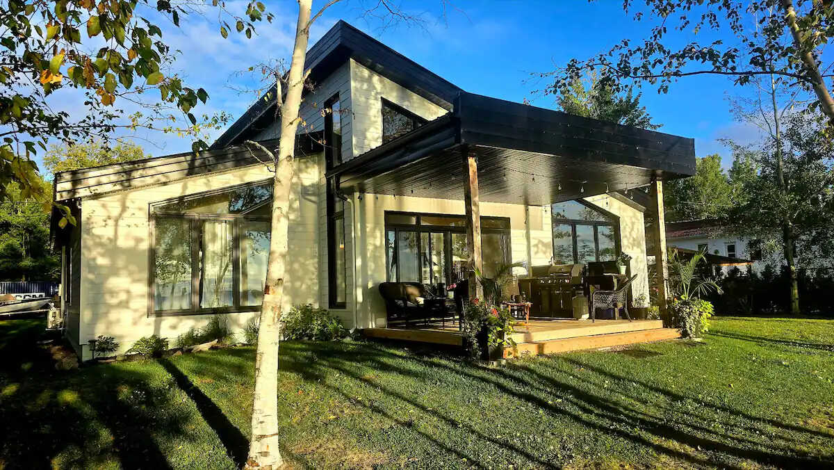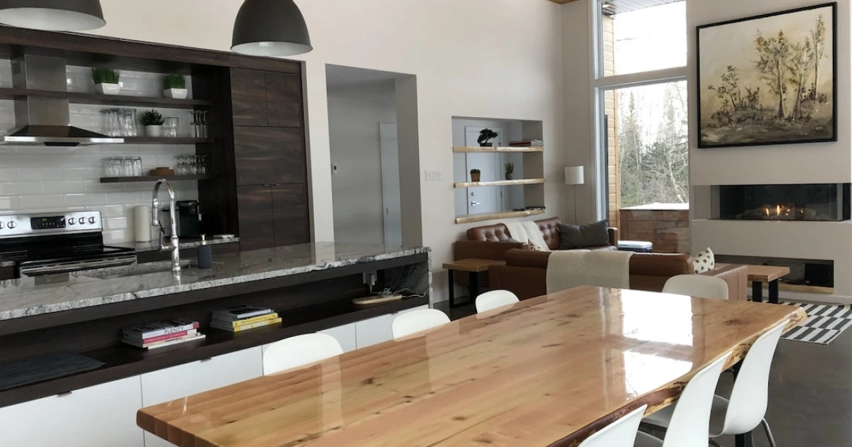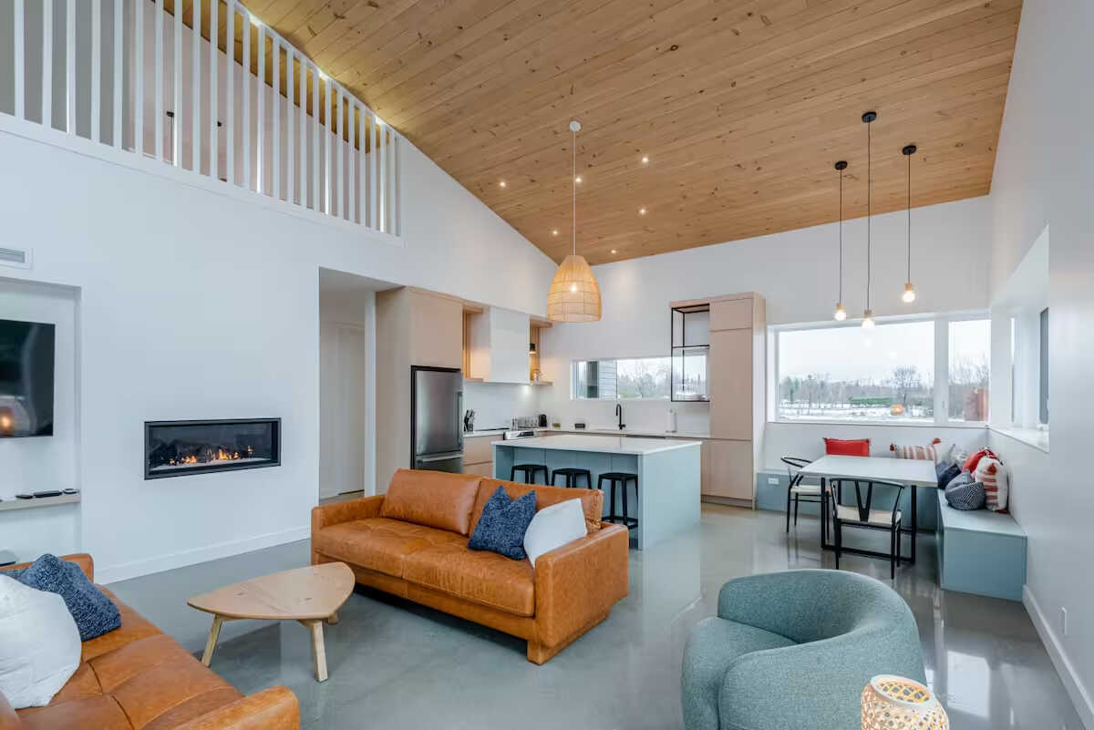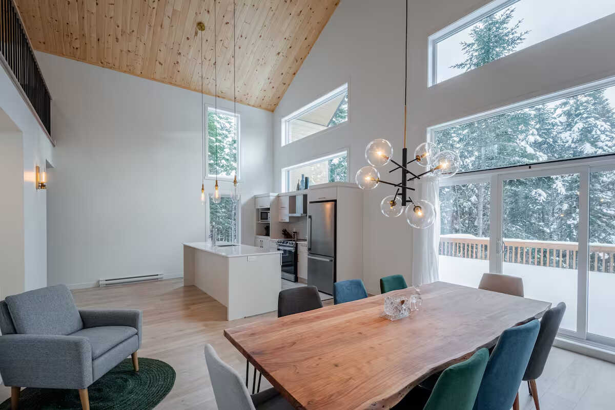 Venez vous ressourcer dans la nature et profitez de cette somptueuse résidence. Elle dispose de trois chambres, de six lits et peut accueillir jusqu'à huit voyageurs. La cuisine très moderne est à la fois fonctionnelle et esthétique. Avec ses armoires foncées, elle contraste parfaitement avec le plafond en lattes de bois clair. Le salon est chaleureux et invitant avec son foyer au gaz et ses deux immenses fenêtres qui innondent la pièce de lumière naturelle.