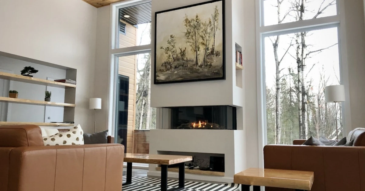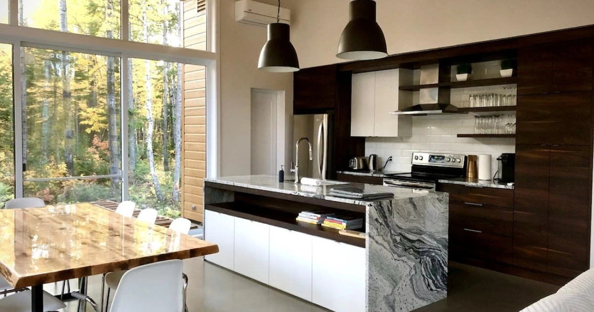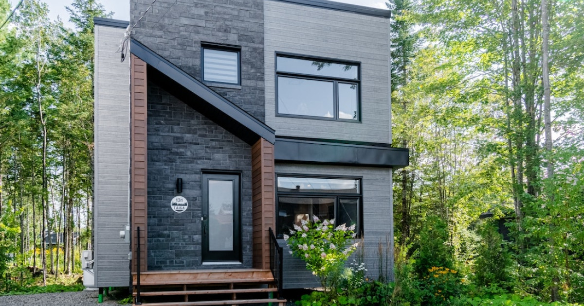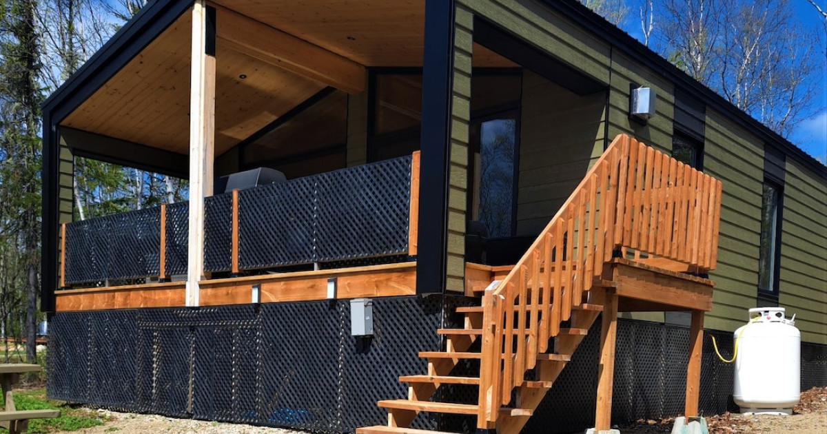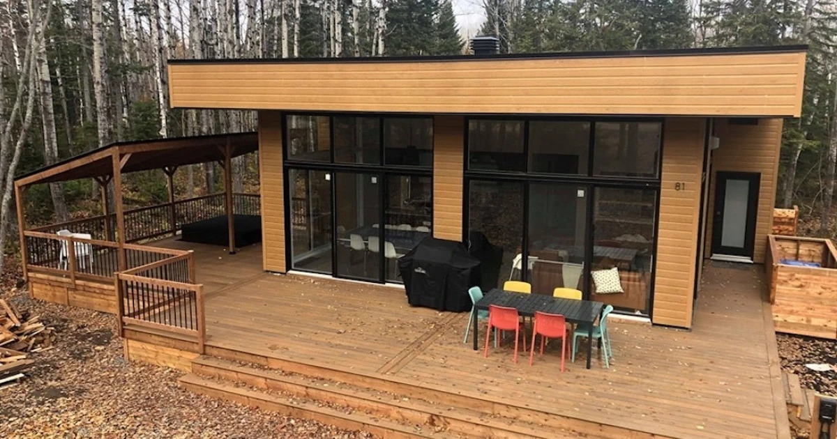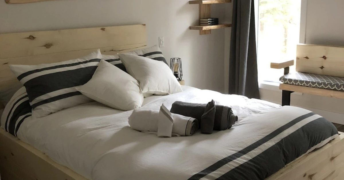 Venez vous ressourcer dans la nature et profitez de cette somptueuse résidence. Elle dispose de trois chambres, de six lits et peut accueillir jusqu'à huit voyageurs. La cuisine très moderne est à la fois fonctionnelle et esthétique. Avec ses armoires foncées, elle contraste parfaitement avec le plafond en lattes de bois clair. Le salon est chaleureux et invitant avec son foyer au gaz et ses deux immenses fenêtres qui innondent la pièce de lumière naturelle.