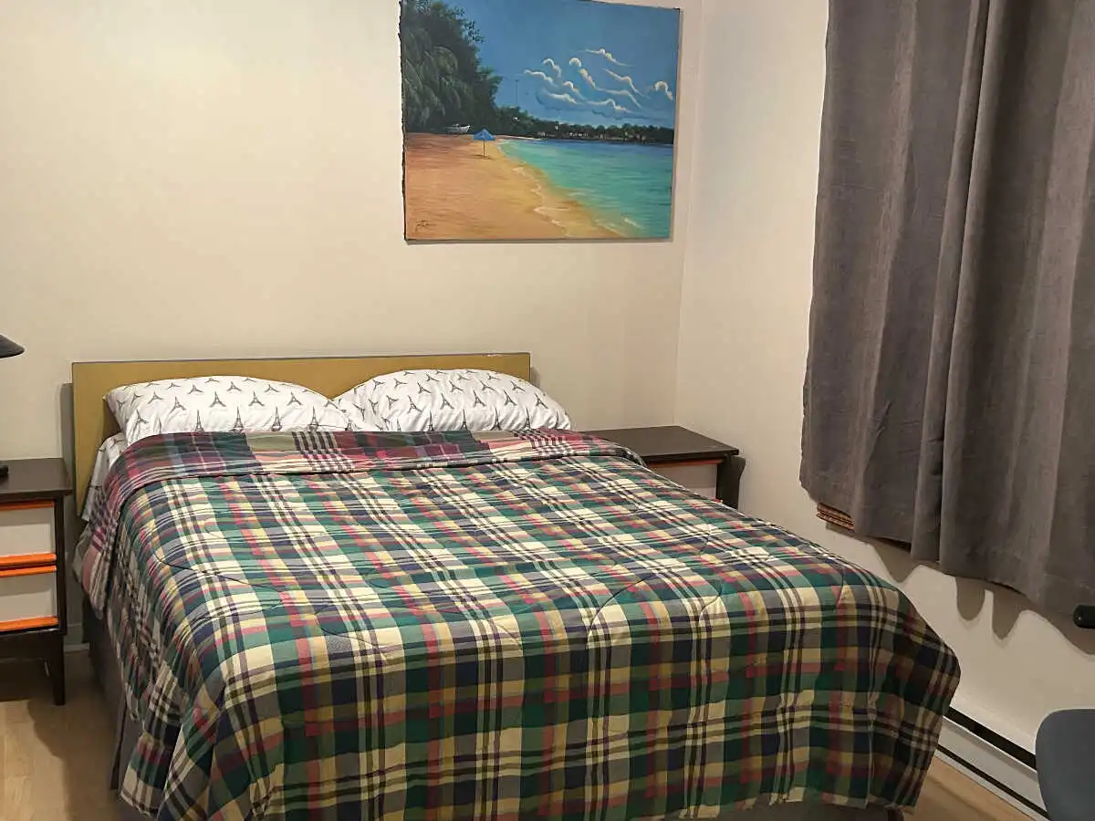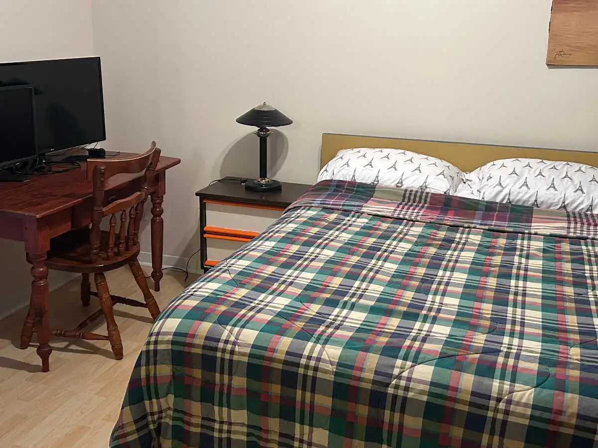 Parfait pour le télétravail avec l'internet Fibe de Bell 100 Giga Illimité et un bureau aménagé avec écran 32 pouces.