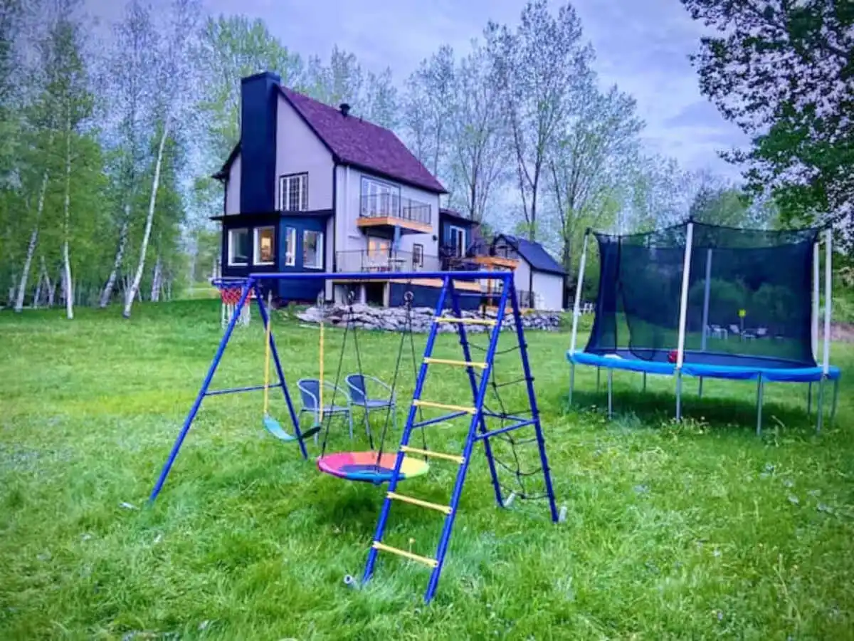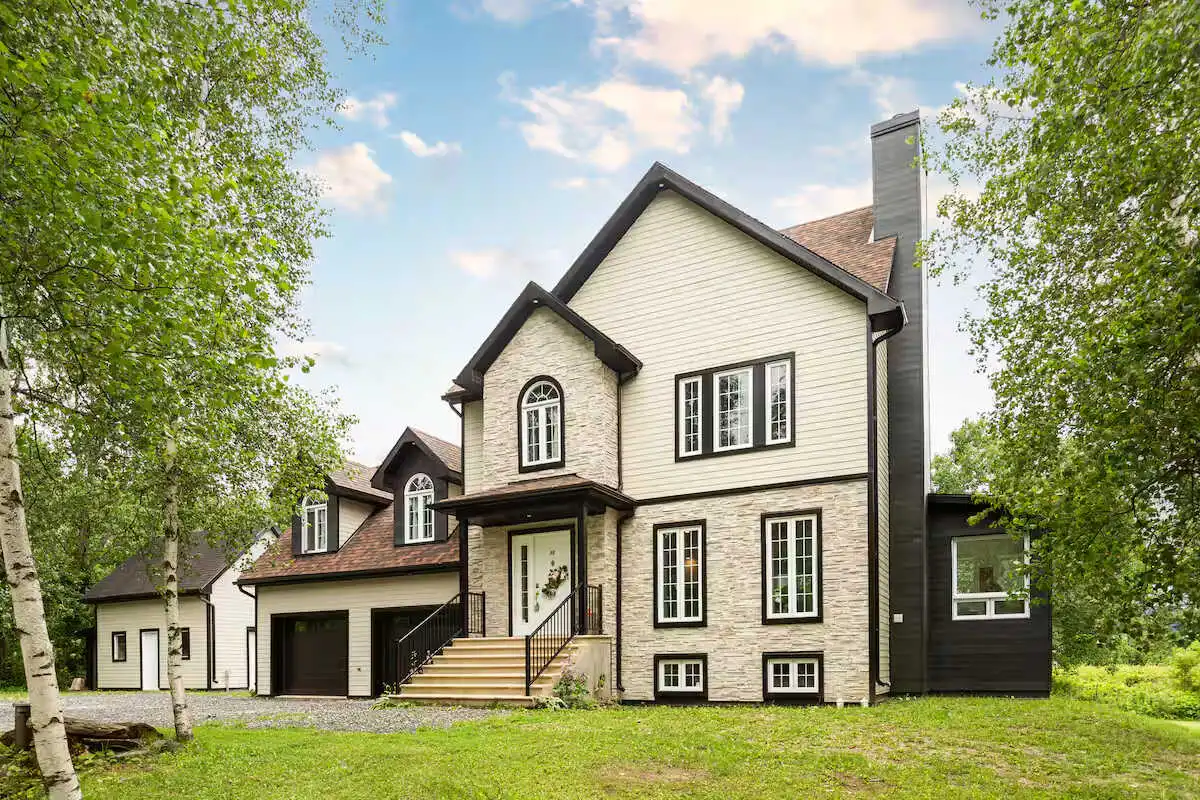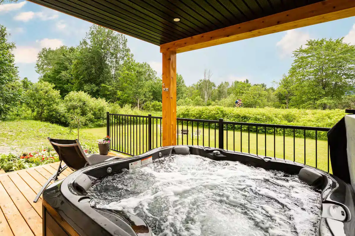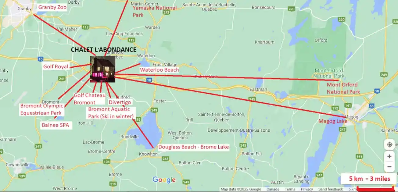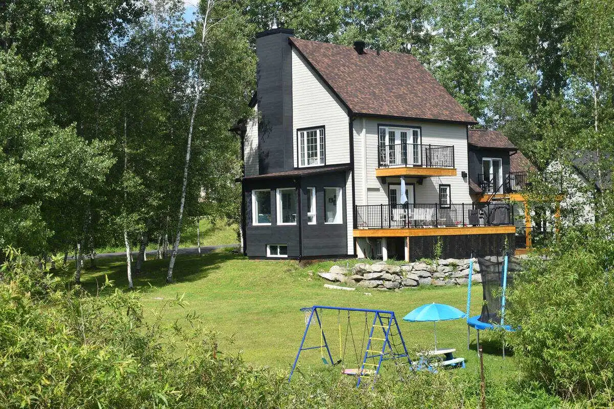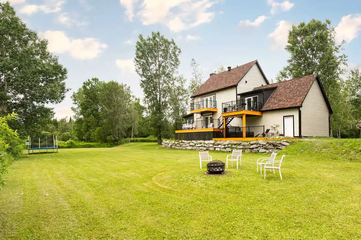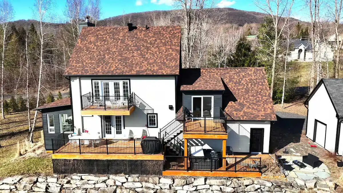 Notre calme villa, en face de la piste cyclable l'Estriade et du Mont Bromont est à 10 min des terrains de golf, du Parc Équestre, de la station de Ski de Bromont et de la plage de Waterloo. Détendez-vous dans le boudoir vitré, le Jacuzzi (SPA) ou sur l'une des 4 terrasses de la propriété avec des vues sur le mont Bromont! Le Chalet l'Abondance de 3 chambres, 3 salons, 3. 5 salles de bains et 3 bureaux de travail, vous offre des conditions idéales de télétravail et une expérience ino... Lire la suite