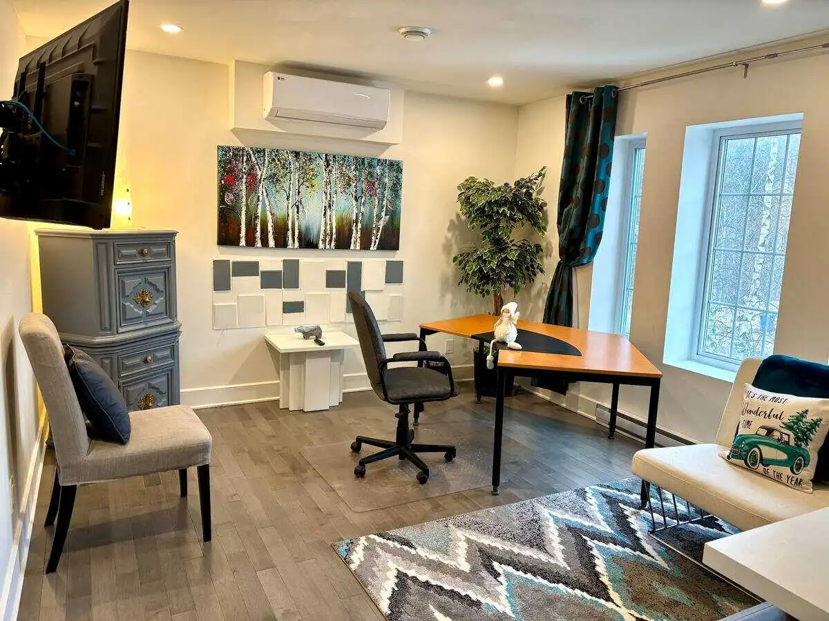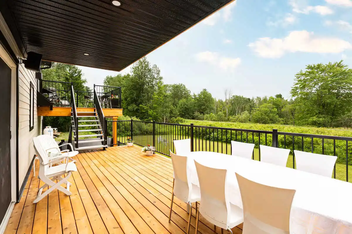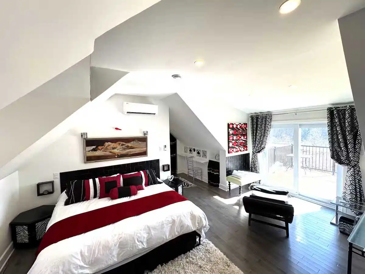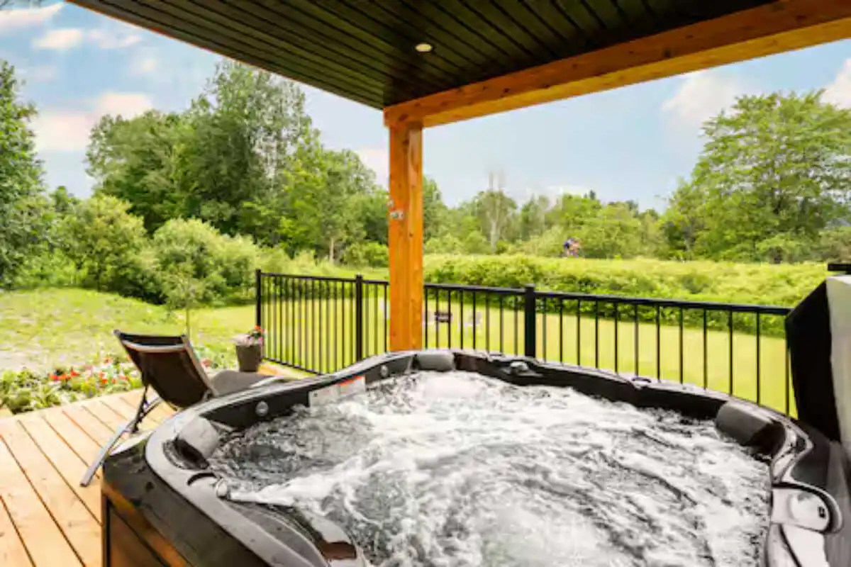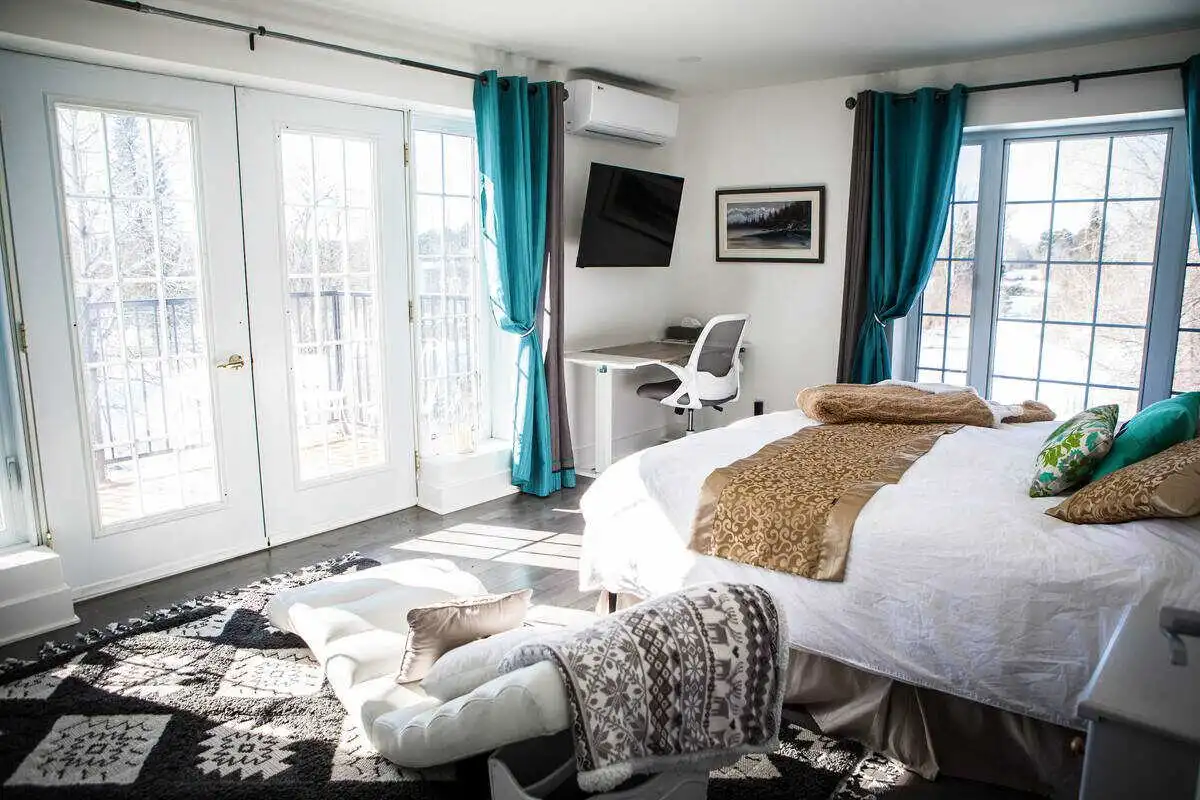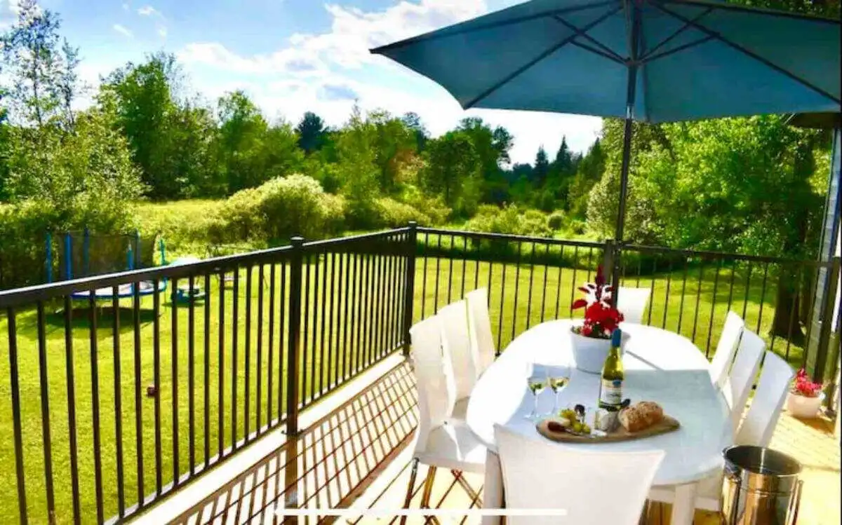 Notre calme villa, en face de la piste cyclable l'Estriade et du Mont Bromont est à 10 min des terrains de golf, du Parc Équestre, de la station de Ski de Bromont et de la plage de Waterloo. Détendez-vous dans le boudoir vitré, le Jacuzzi (SPA) ou sur l'une des 4 terrasses de la propriété avec des vues sur le mont Bromont! Le Chalet l'Abondance de 3 chambres, 3 salons, 3. 5 salles de bains et 3 bureaux de travail, vous offre des conditions idéales de télétravail et une expérience ino... Lire la suite