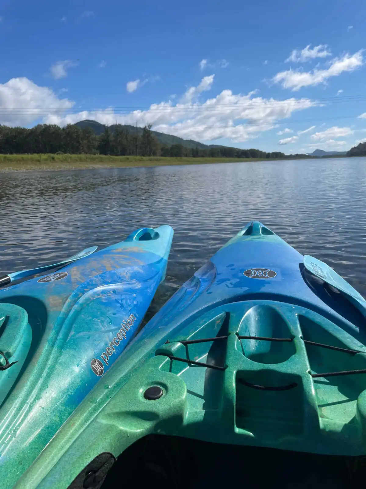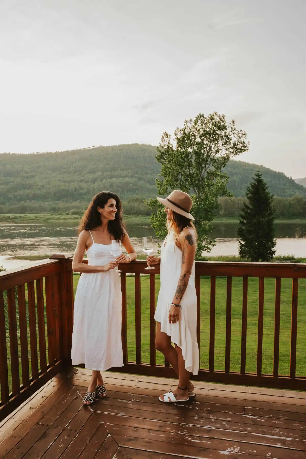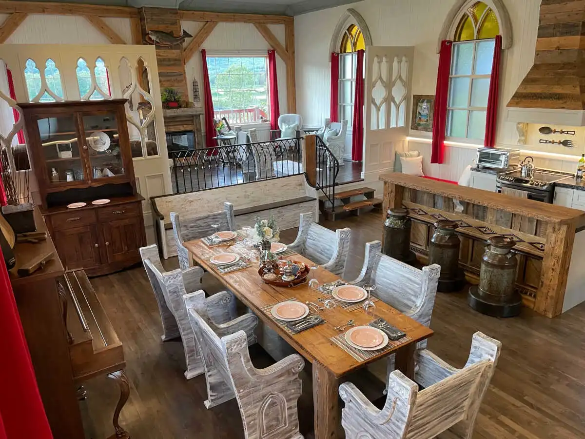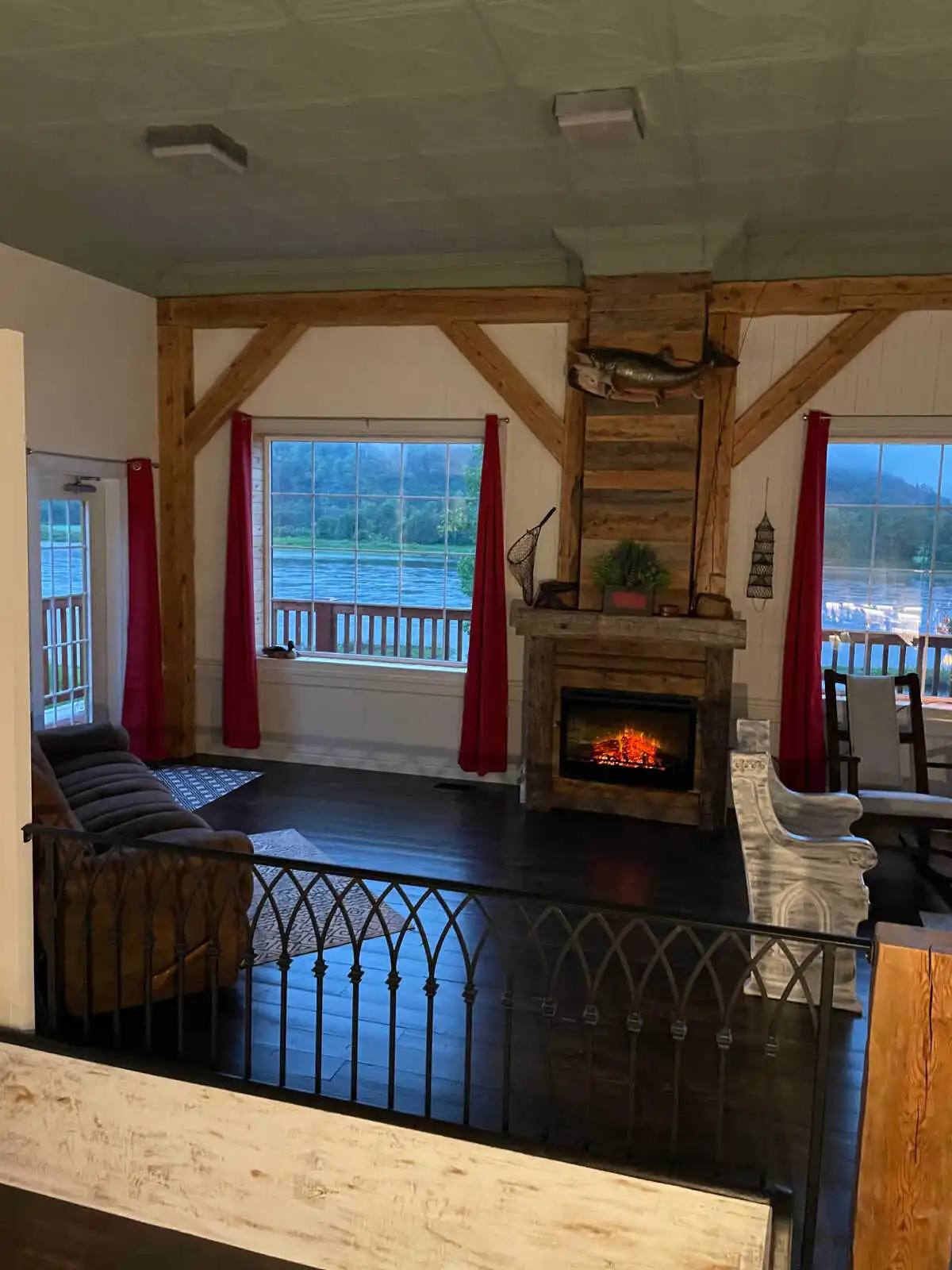 Le rez-de-chaussée propose un vaste espace ouvert avec cuisine entièrement équipée, grande table rustique et salon lumineux offrant une vue imprenable sur la rivière.