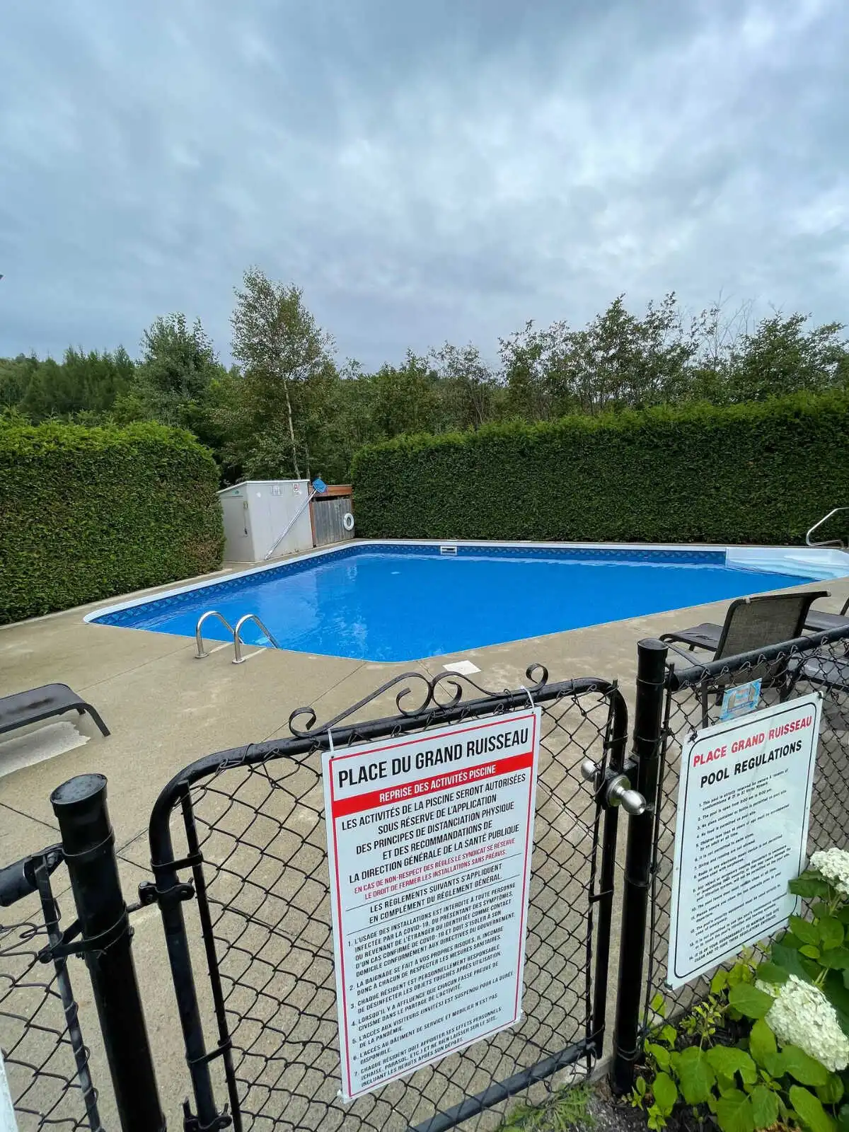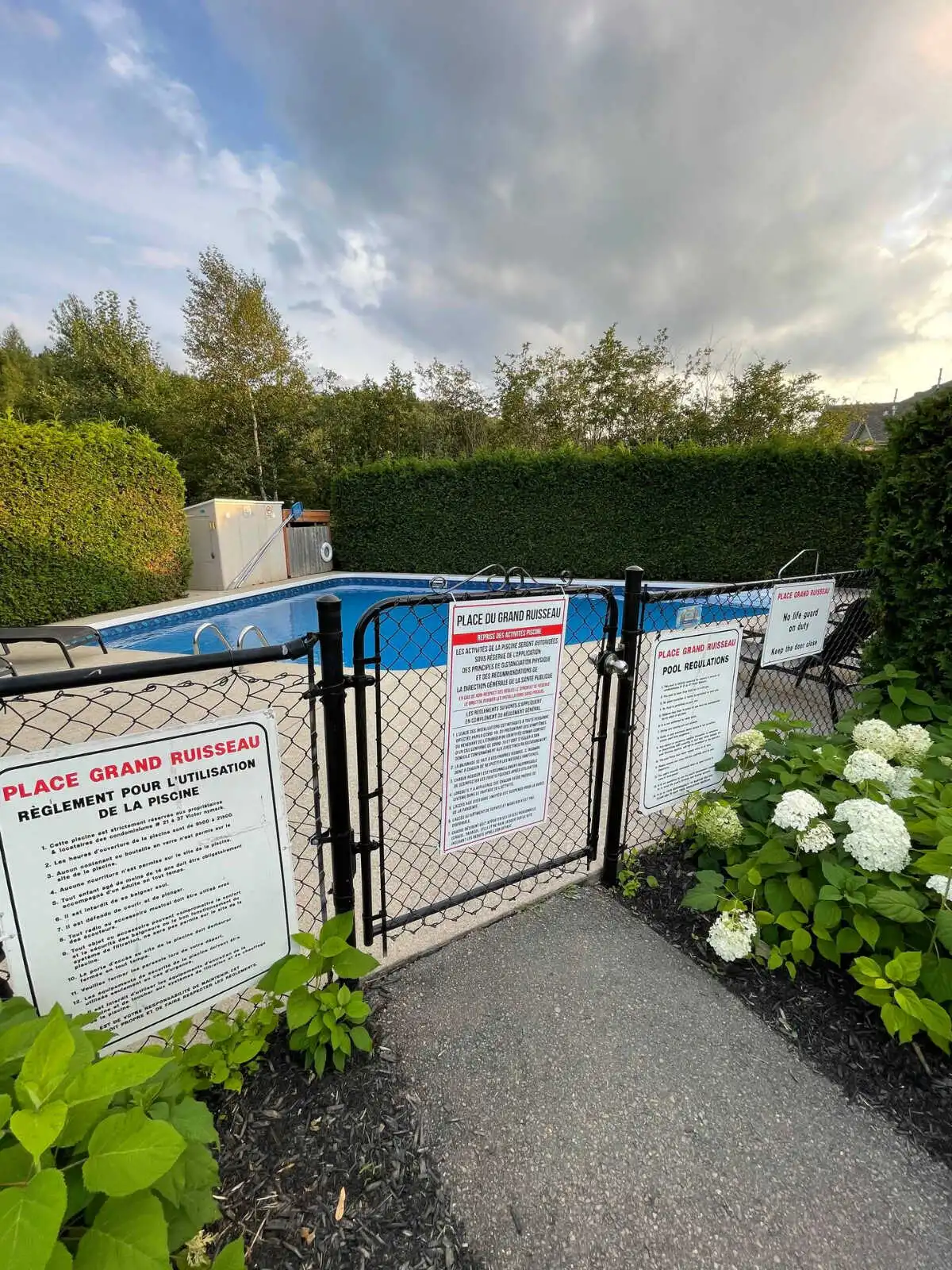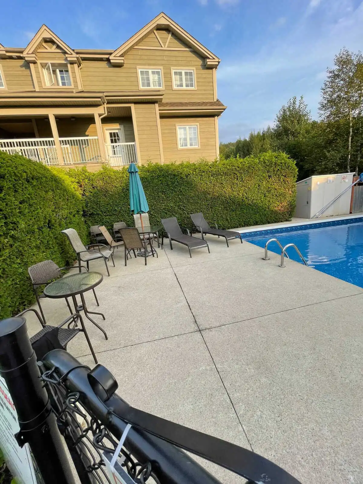 Terrasse privée avec BBQ, piscine chauffée commune et stationnement pour 2 véhicules. En été : supports et cadenas pour vos vélos. En hiver : espace de rangement fermé privé pour vos équipements de ski.