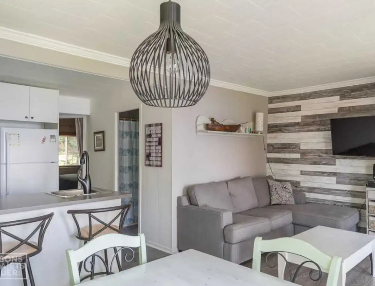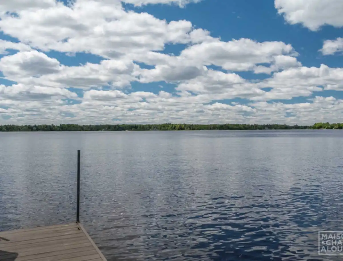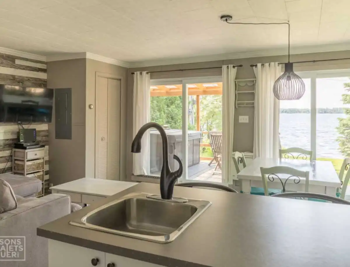 Salon, cuisine et salle à manger à aire ouverte avec vue sur le lac
