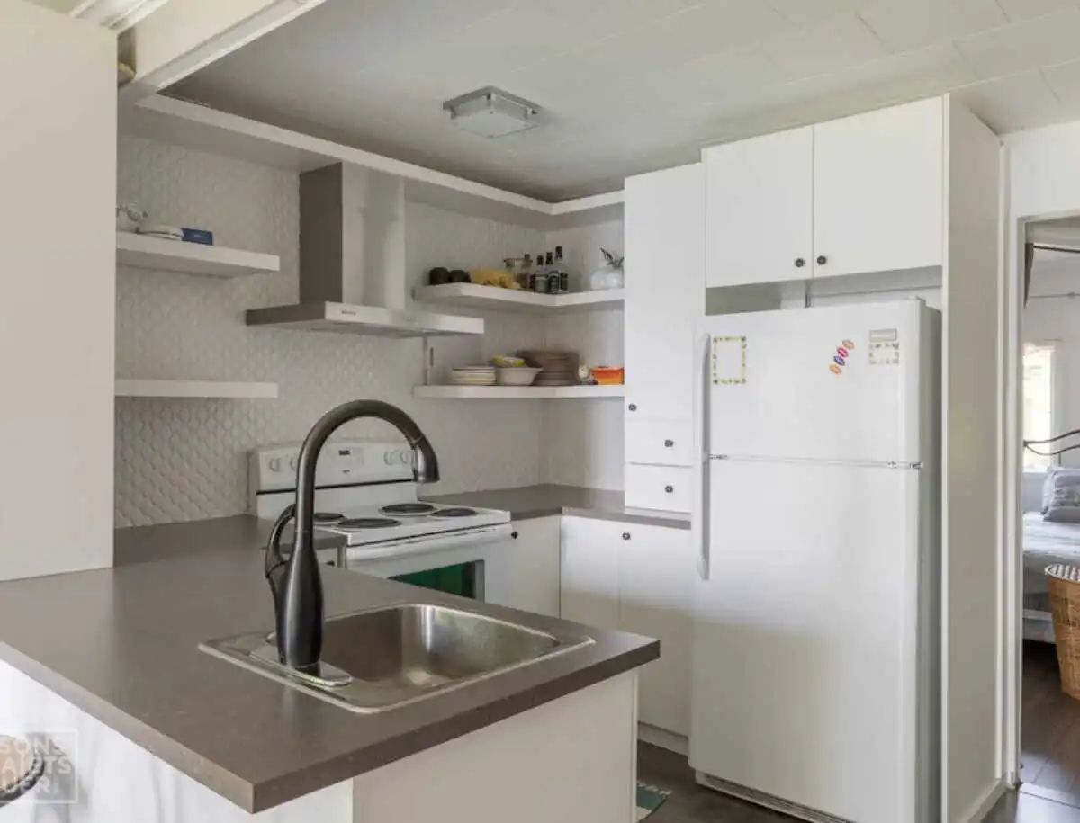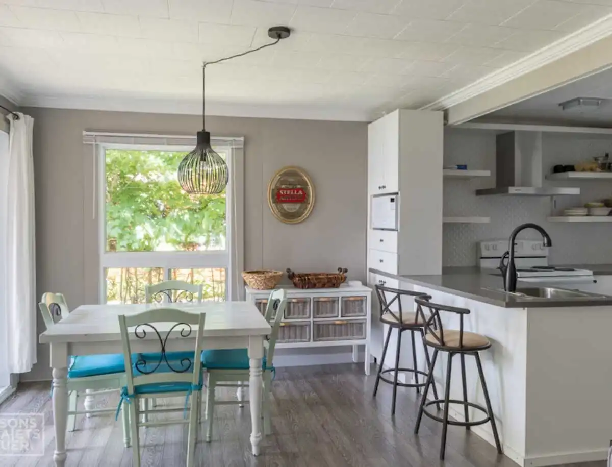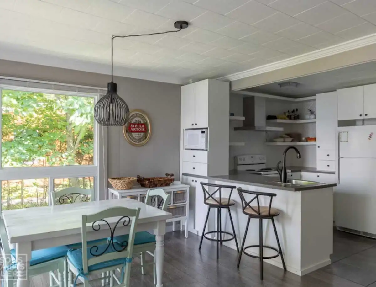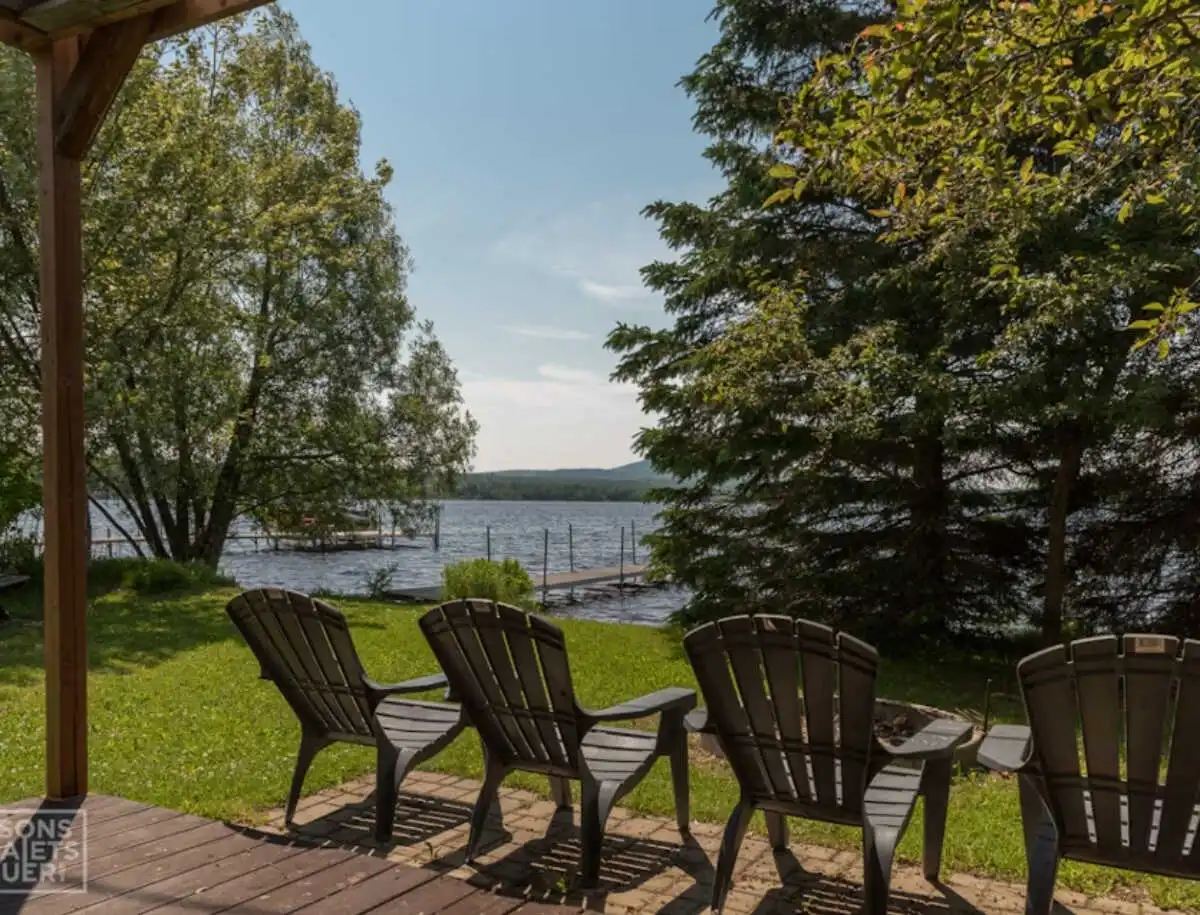 Salon, cuisine et salle à manger à aire ouverte avec vue sur le lac