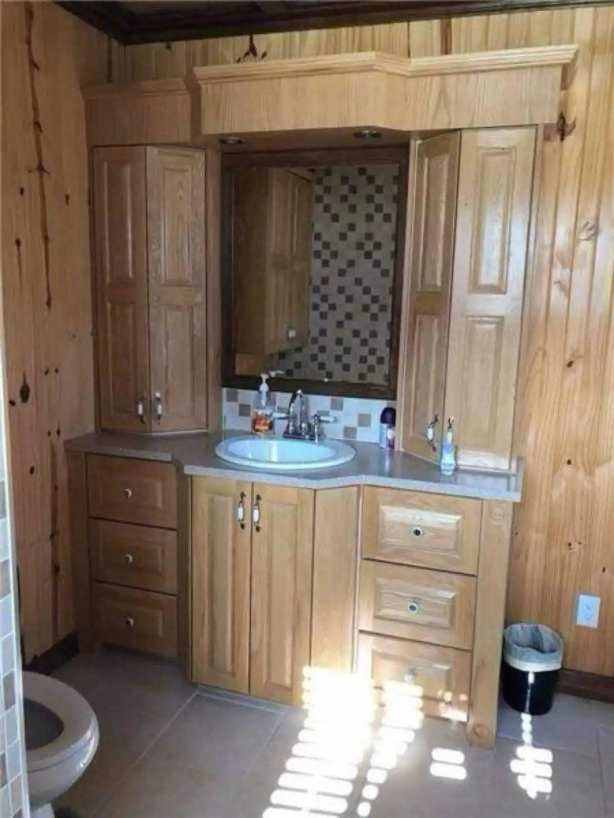Salle de bain au rez-de-chaussée avec douche, laveuse et sécheuse