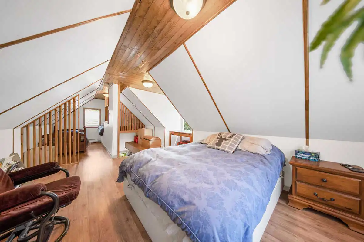 Chambre ouverte avec 1 lit queen et 2 lits simples, salon avec canapé-lit double, cuisine équipée, salle de bain et Wi-Fi.