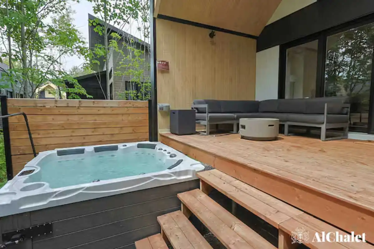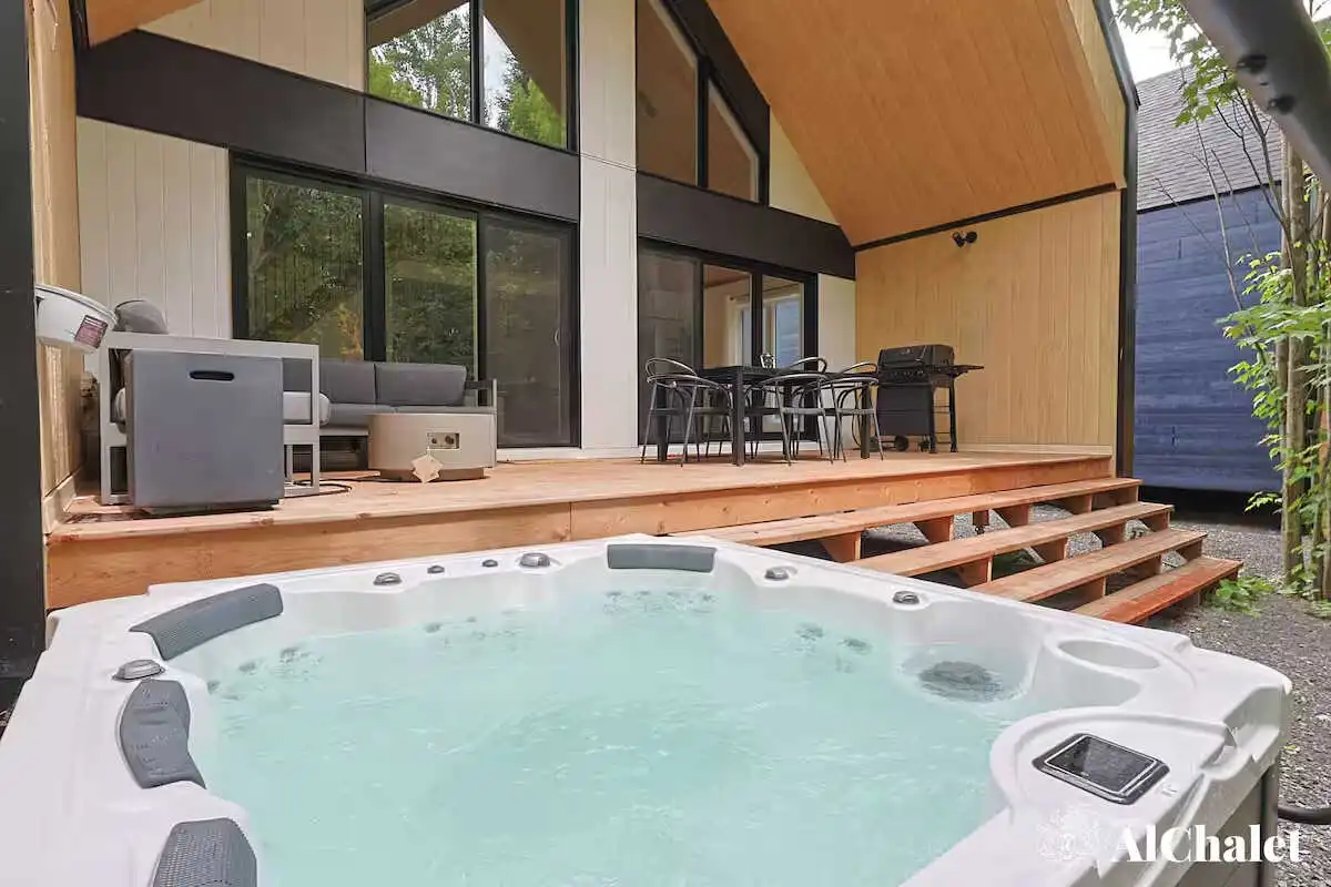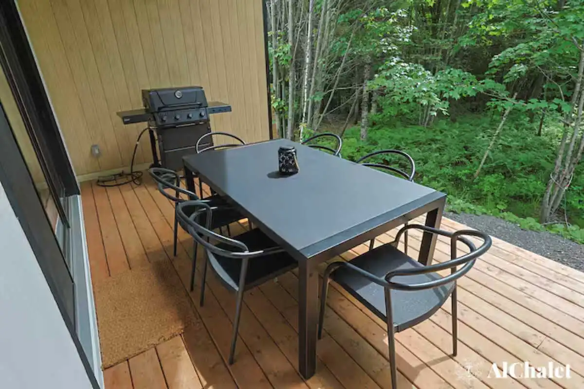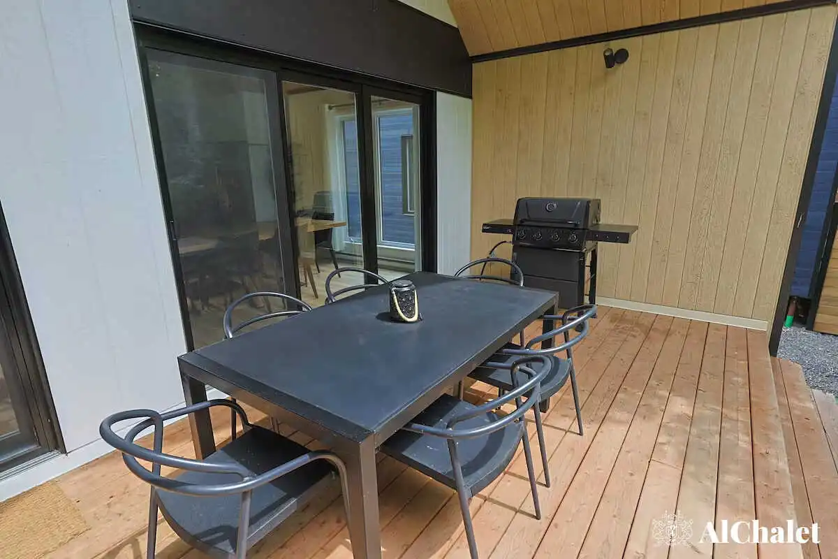 Mais c’est sur la terrasse que le chalet révèle son âme : un espace paisible bordé par les arbres, avec un spa privé et un foyer extérieur pour prolonger les soirées, été comme hiver. Même vos animaux de compagnie sont les bienvenus – parce qu’ici, l’expérience se vit ensemble.