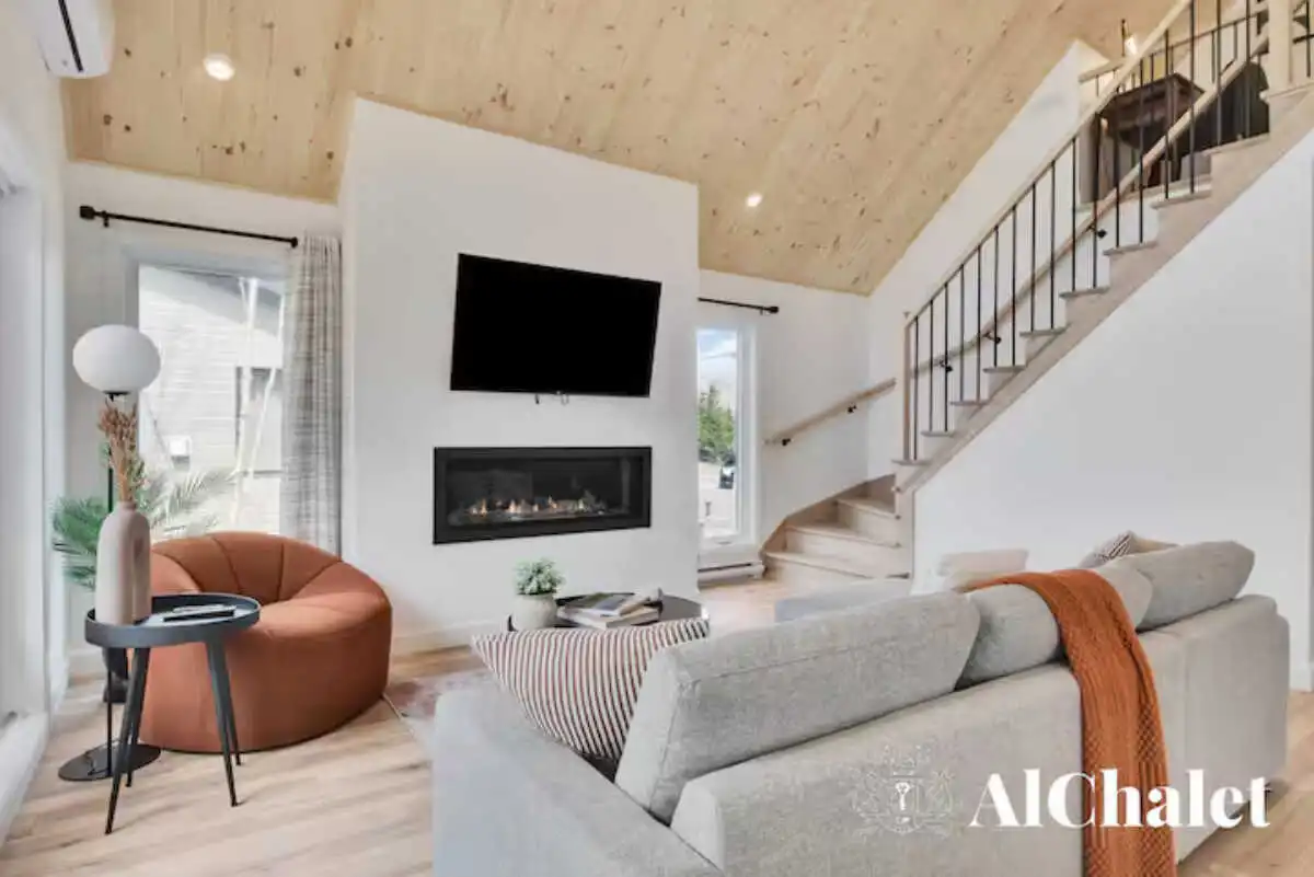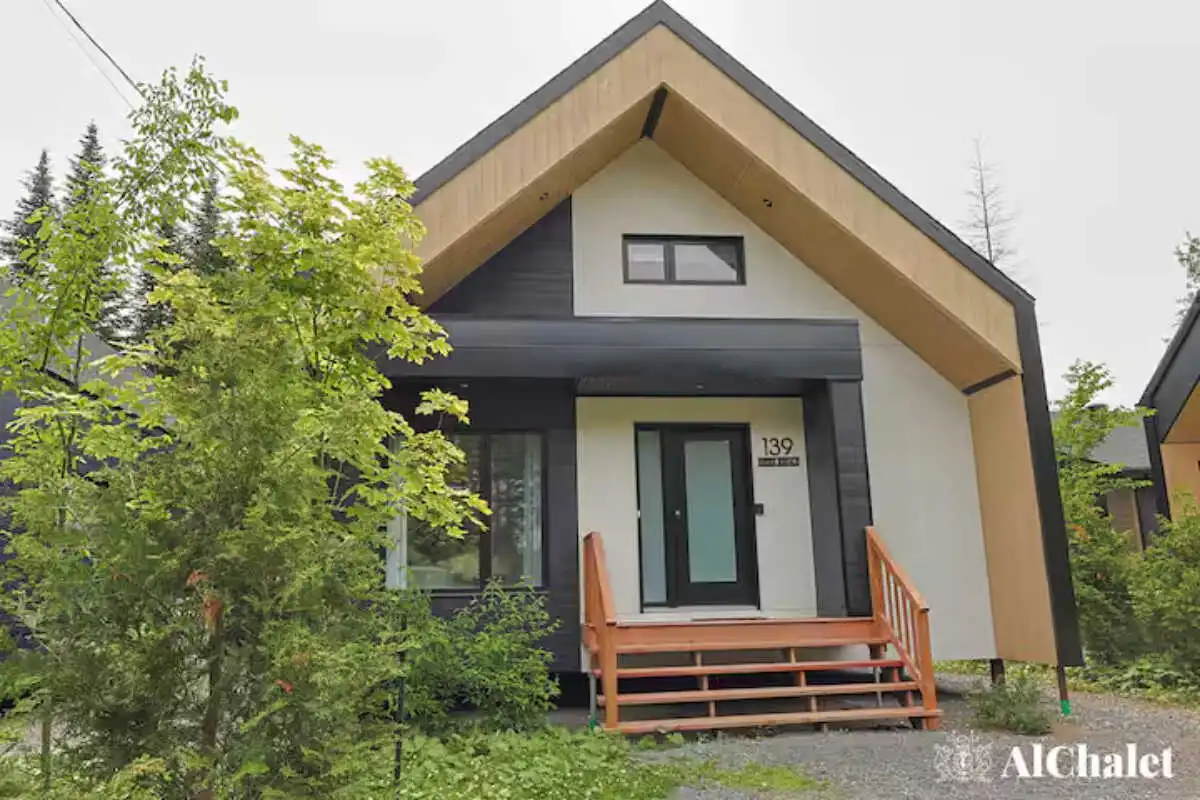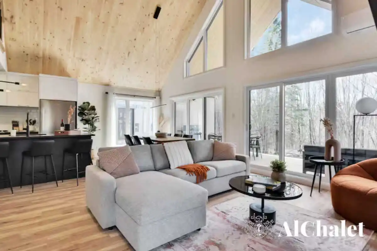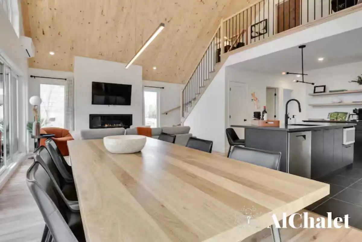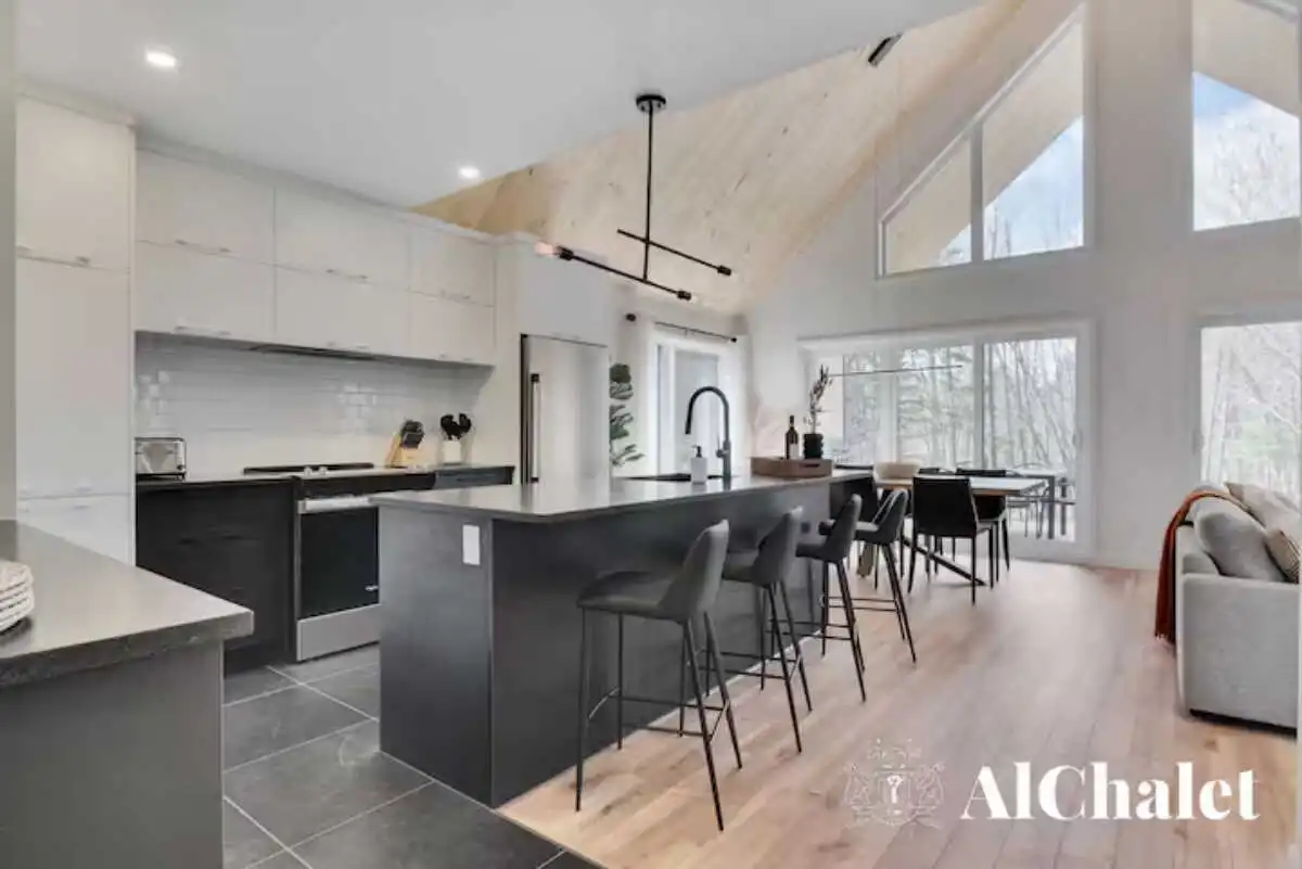 Évadez-vous au Chalet Aurora Borealis, un havre où design moderne et touches nordiques fusionnent. Profitez de chambres lumineuses avec lits Queen confortables. Son toit cathédrale en bois naturel inspirent la sérénité. La cuisine ouverte invite à la convivialité avec ses tons de noir élégant et de bois chaleureux.