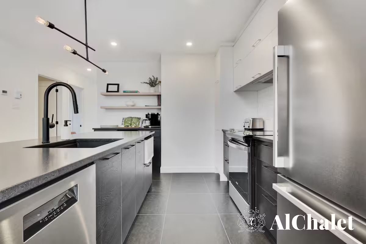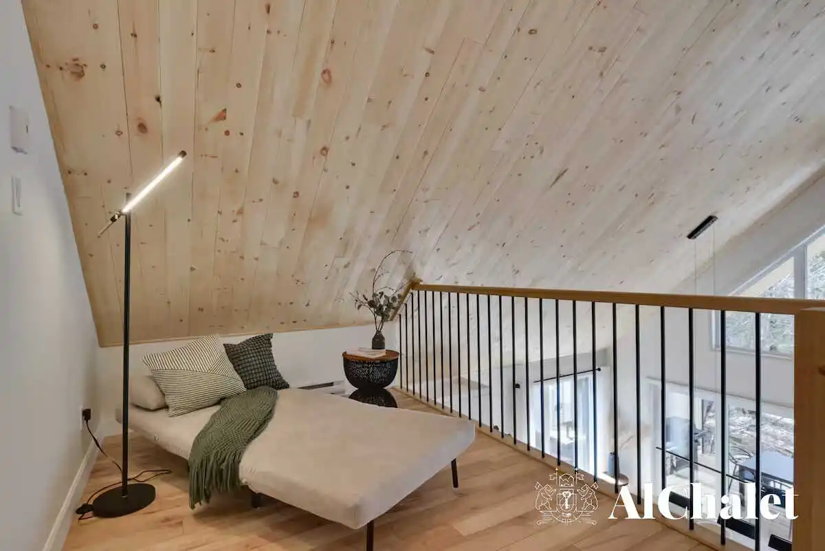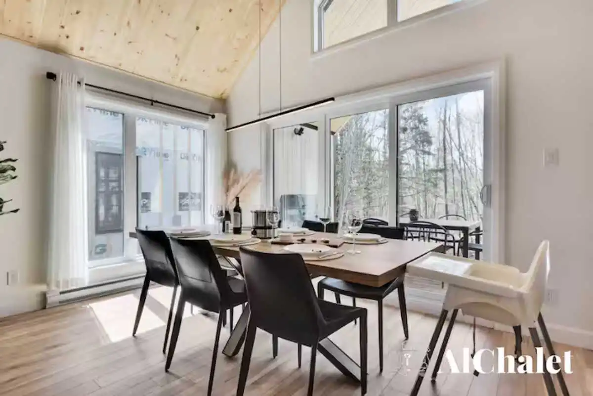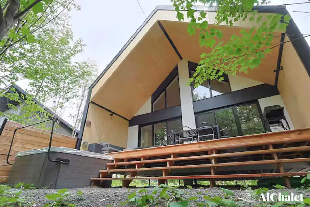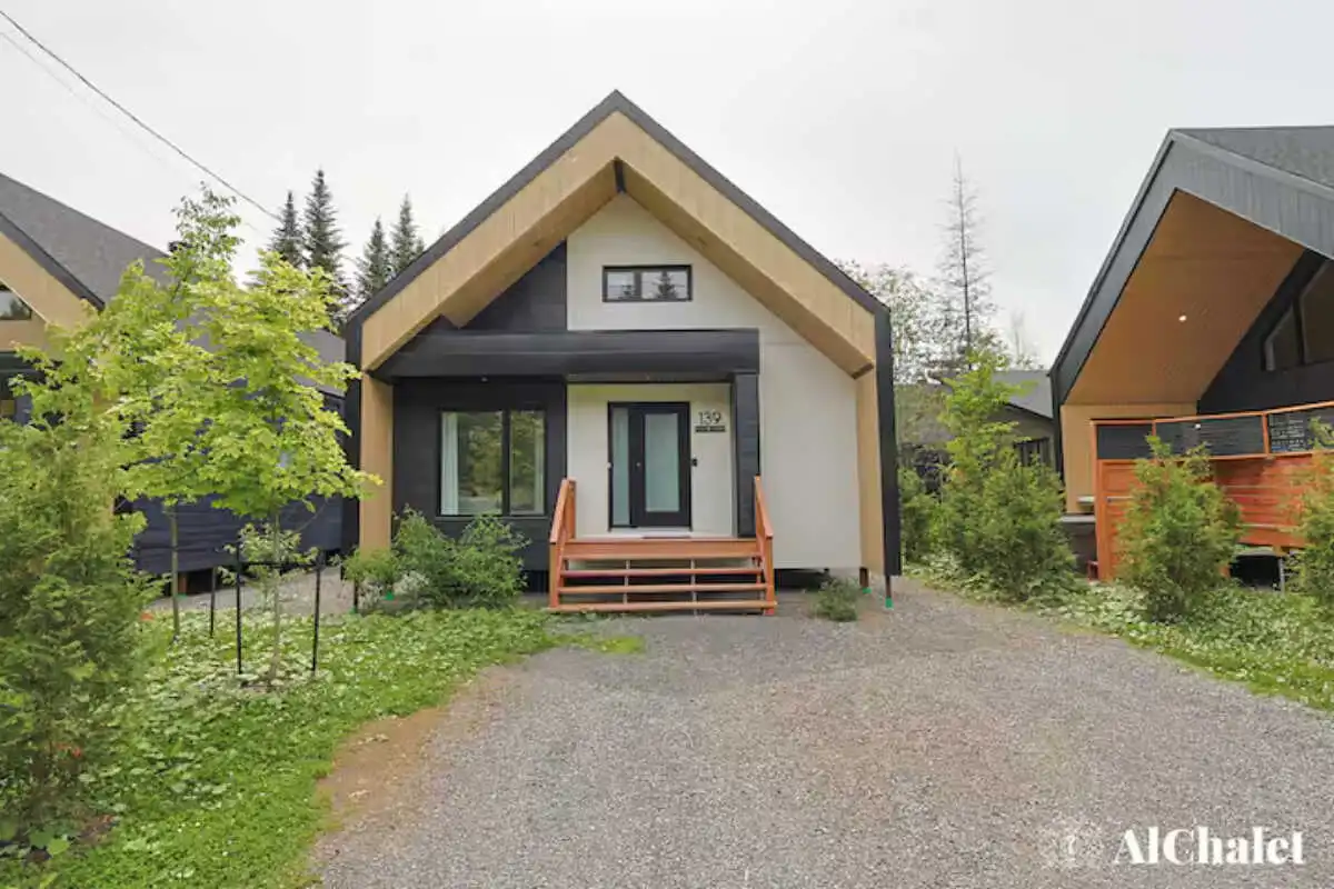 Évadez-vous au Chalet Aurora Borealis, un havre où design moderne et touches nordiques fusionnent. Profitez de chambres lumineuses avec lits Queen confortables. Son toit cathédrale en bois naturel inspirent la sérénité. La cuisine ouverte invite à la convivialité avec ses tons de noir élégant et de bois chaleureux.
