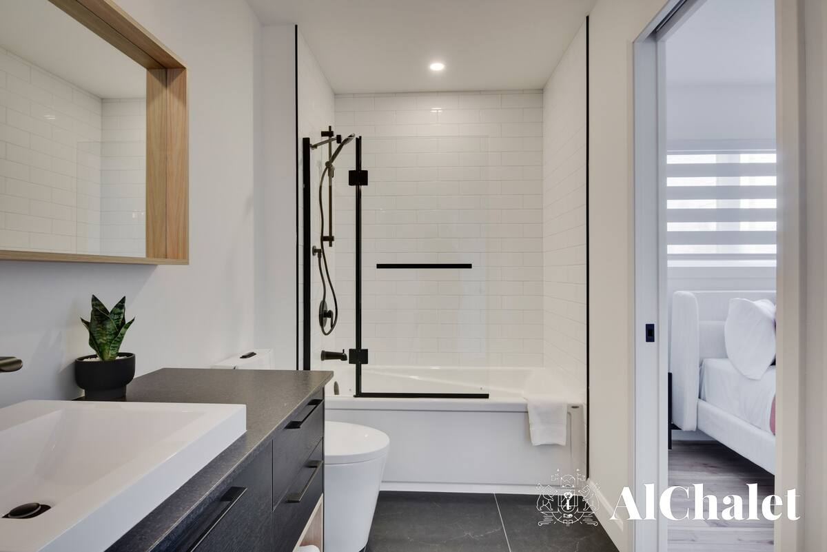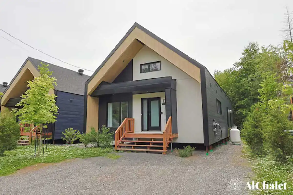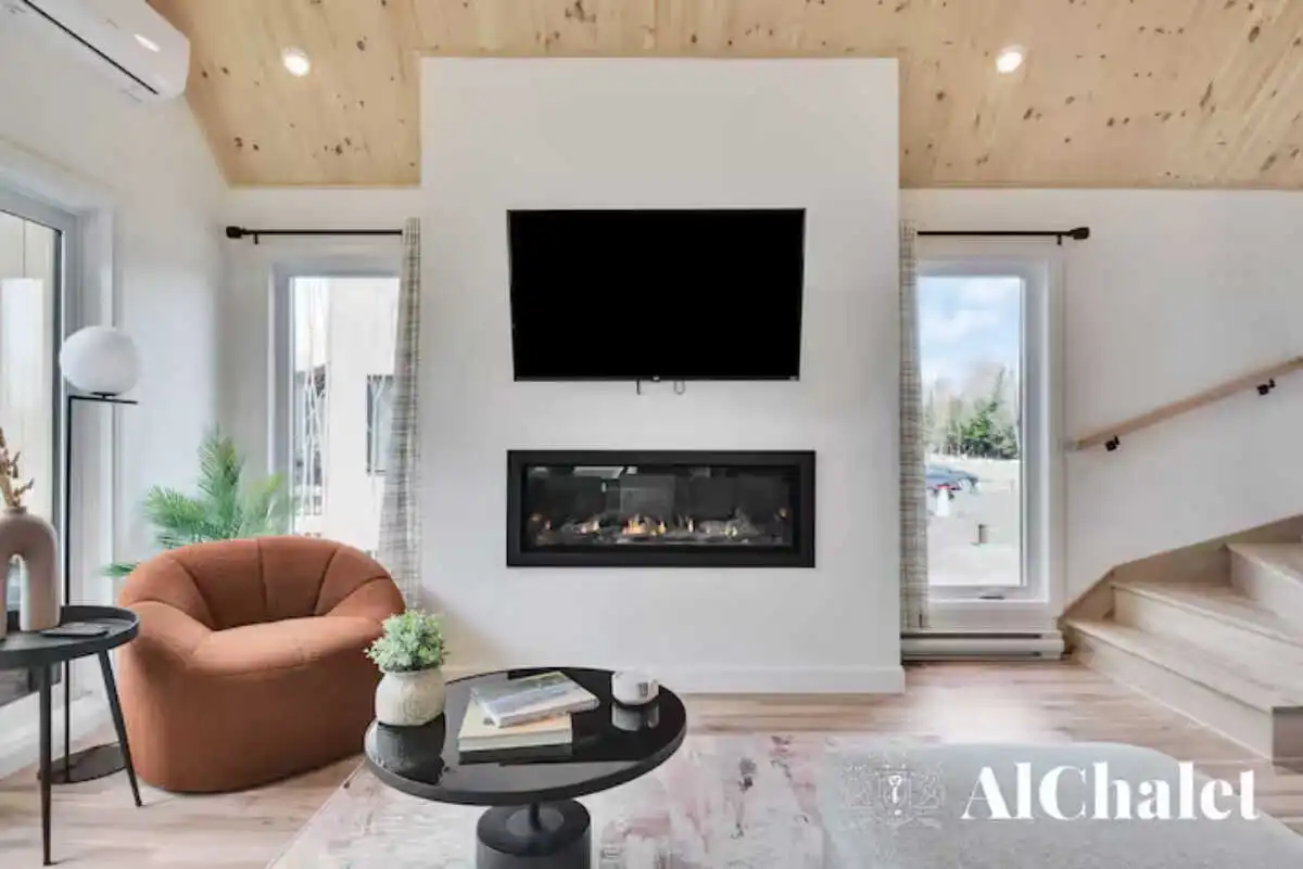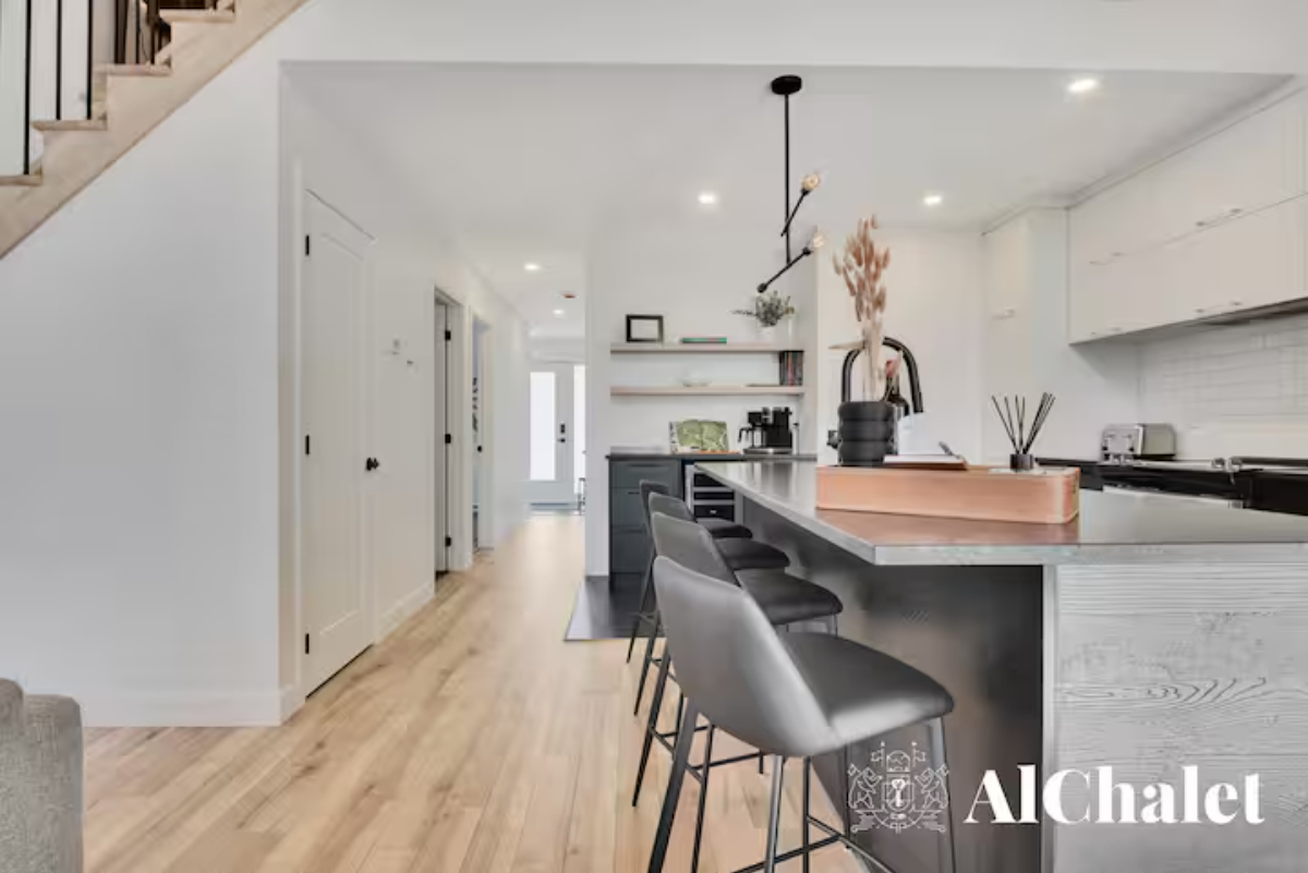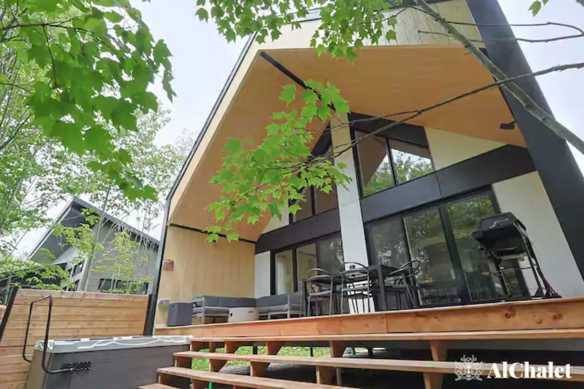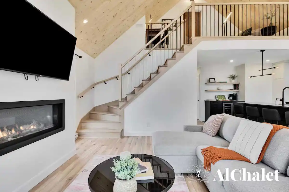 Évadez-vous au Chalet Aurora Borealis, un havre où design moderne et touches nordiques fusionnent. Profitez de chambres lumineuses avec lits Queen confortables. Son toit cathédrale en bois naturel inspirent la sérénité. La cuisine ouverte invite à la convivialité avec ses tons de noir élégant et de bois chaleureux.