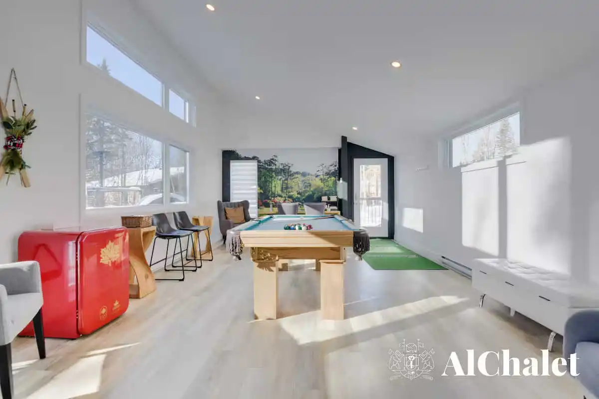 Nos clients ont accès à l'ensemble du chalet et à toutes ses installations. Vous pourrez également profiter des espaces communs avec le salon avec télé et billard, de la terrasse extérieure, de la piscine chauffée (été seulement), du sauna et du spa. .