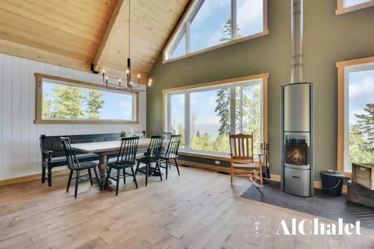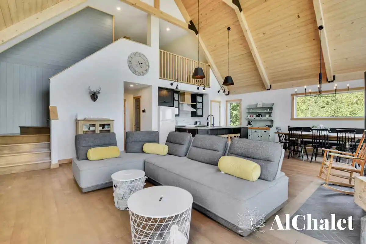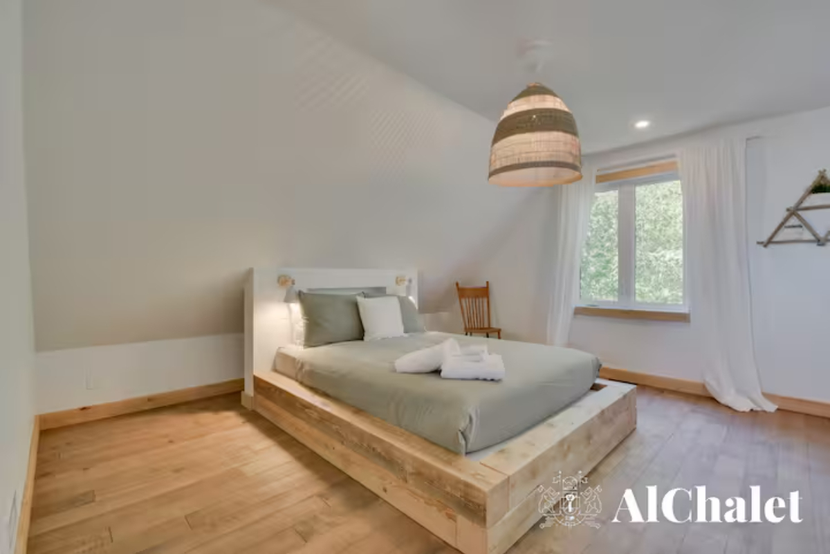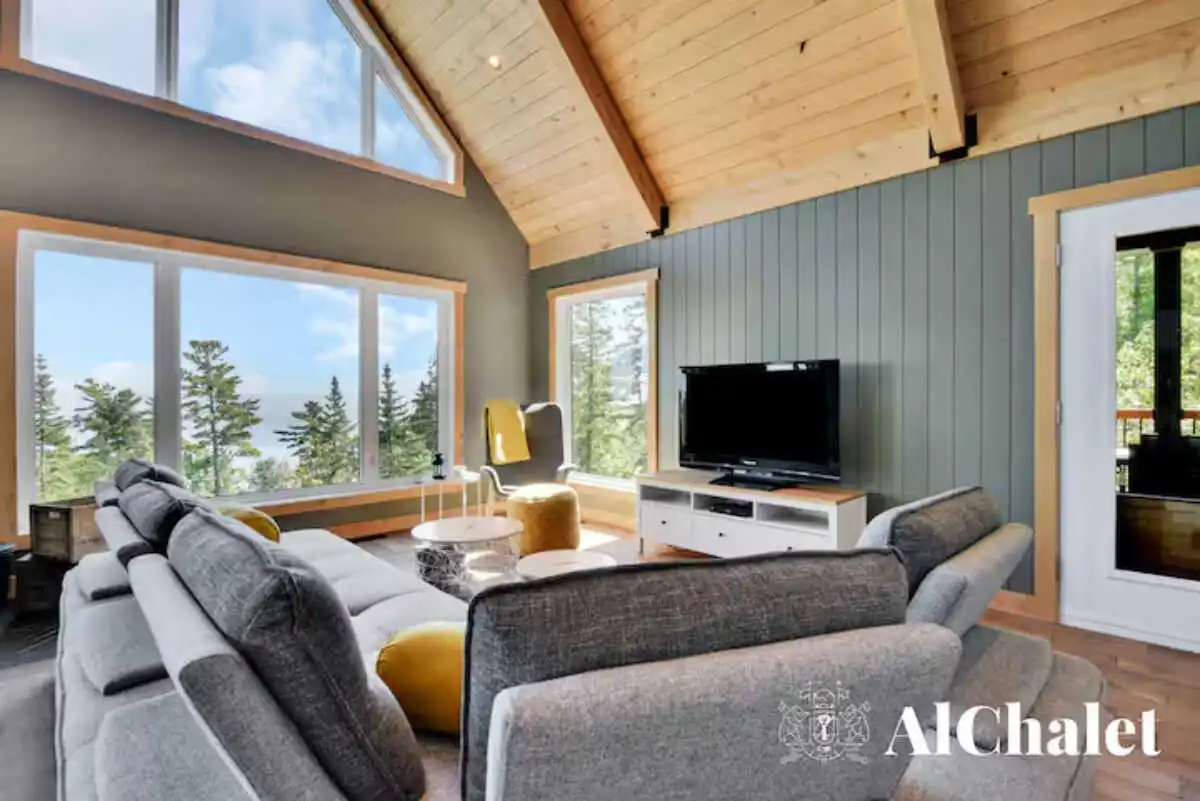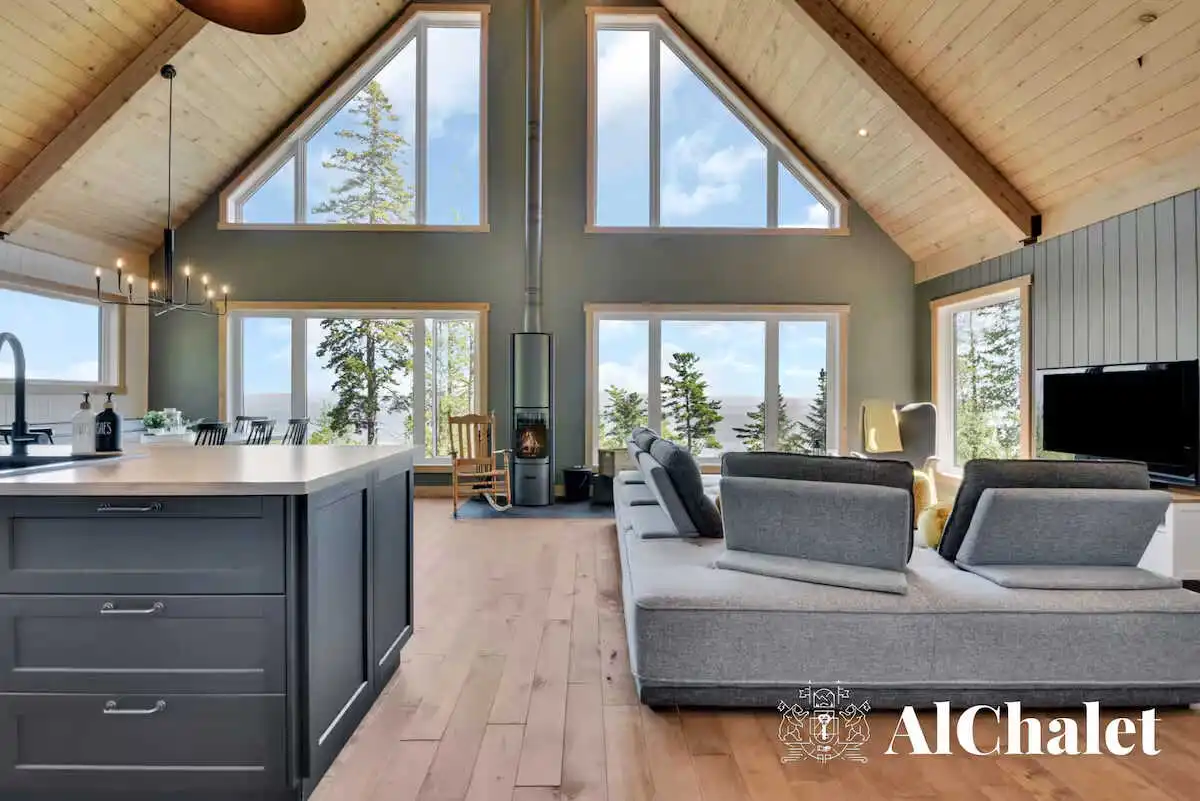 Shack Saison est un chalet aux allures de ranch, alliant simplicité et modernité. Ses teintes vert apportent une fraîcheur bienvenue, tandis que le toit cathédrale et les fenêtres inondent l'intérieur de lumière naturelle. offrant une belle vue sur le fleuve. Pouvant accueillir jusqu'à 8 personnes avec ses 4 chambres, 2 salles de bain, profitez d'un espace vibrant pour toute la famille. Son spa, foyer et terrasse avec sa vue, vous offrent tout le confort nécessaire pour un séjour mémorable.
