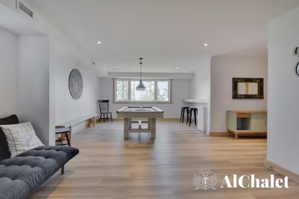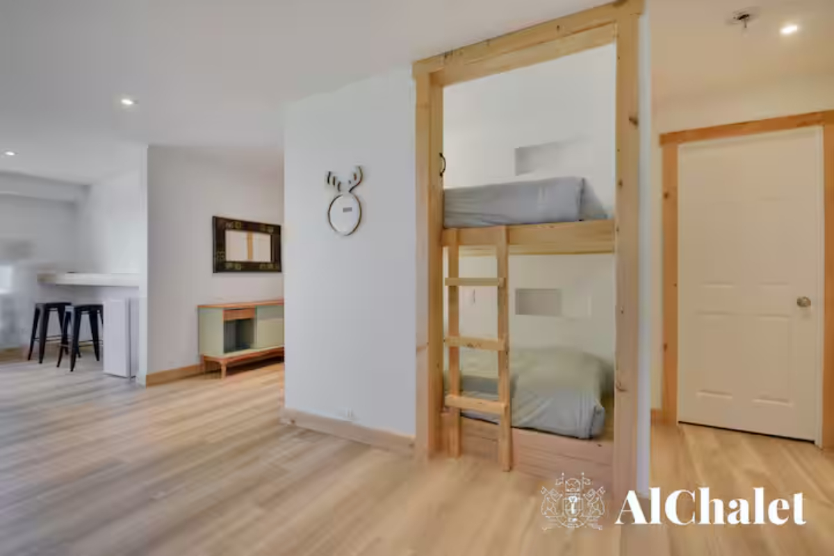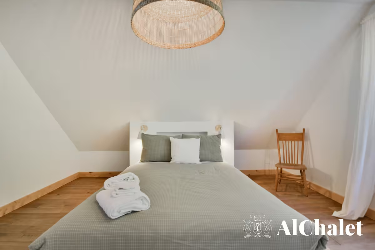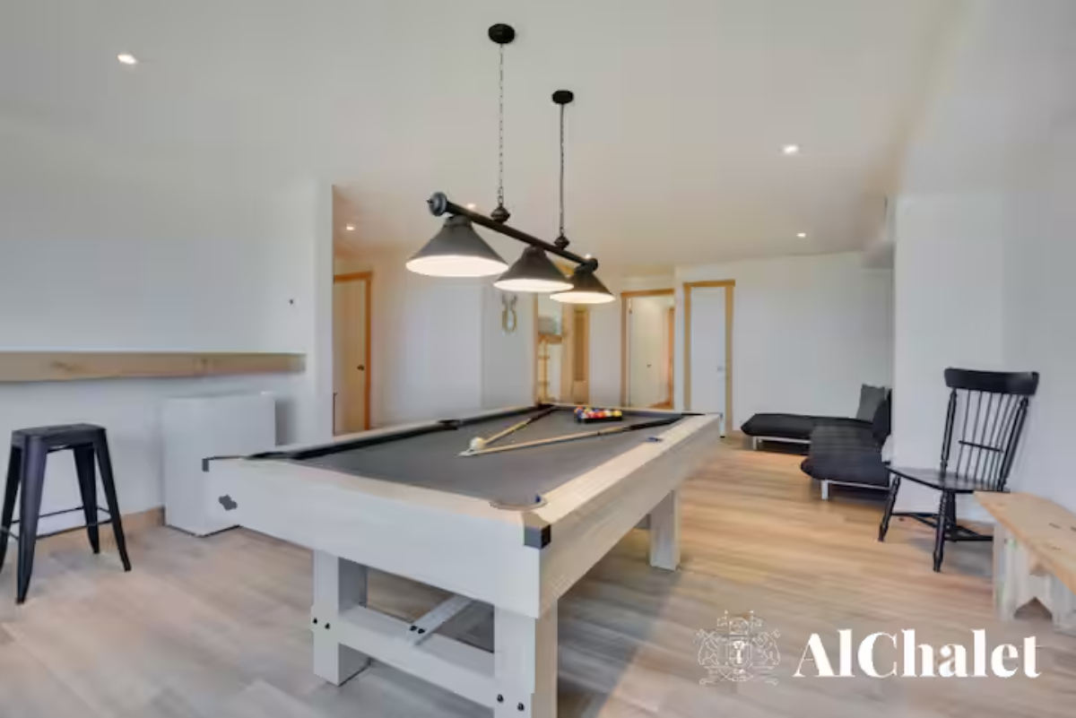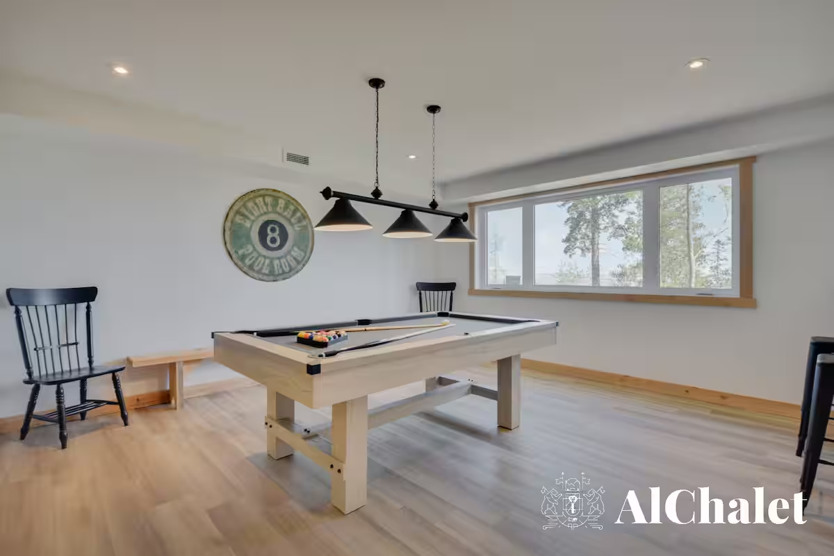 Le chalet dispose de trois chambres et de 4 lits pour 8 personnes, dont une mezzanine surplombant le salon et offrant un panorama unique sur les arbres. Le sous-sol est équipé d'un lit simple superposé et d'un billard, idéal pour se détendre et pour le plaisir des plus jeunes. Deux salles de bains sont à votre disposition.