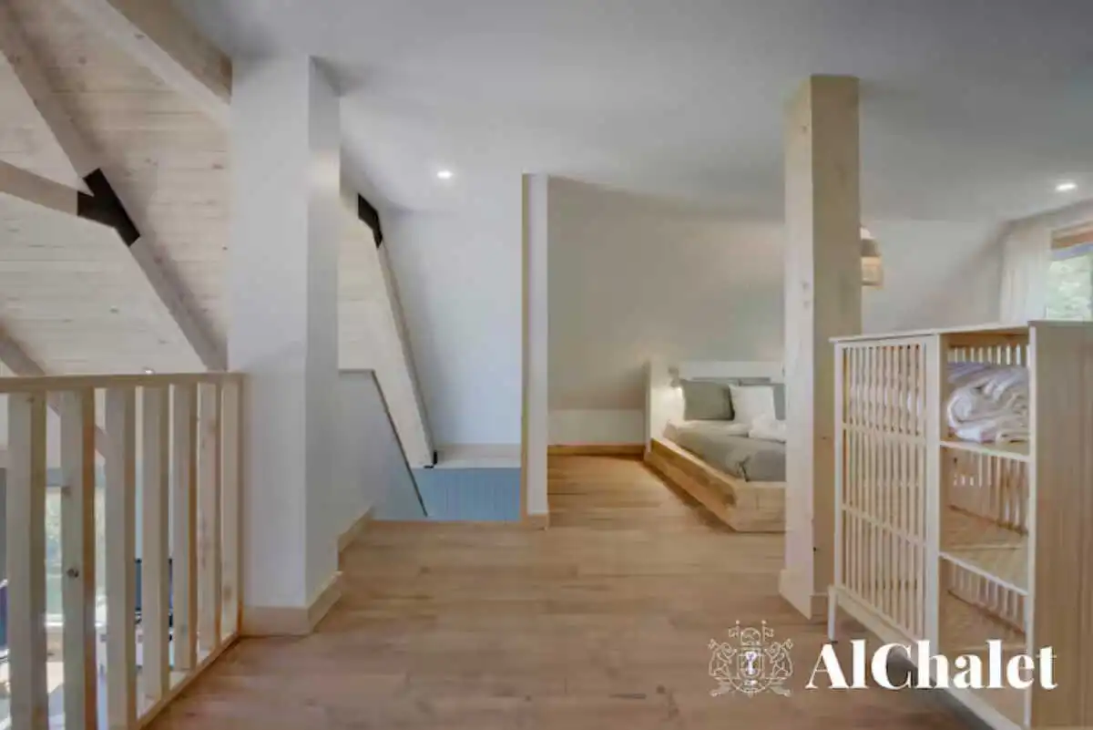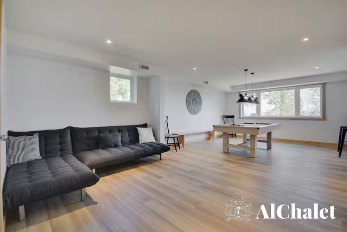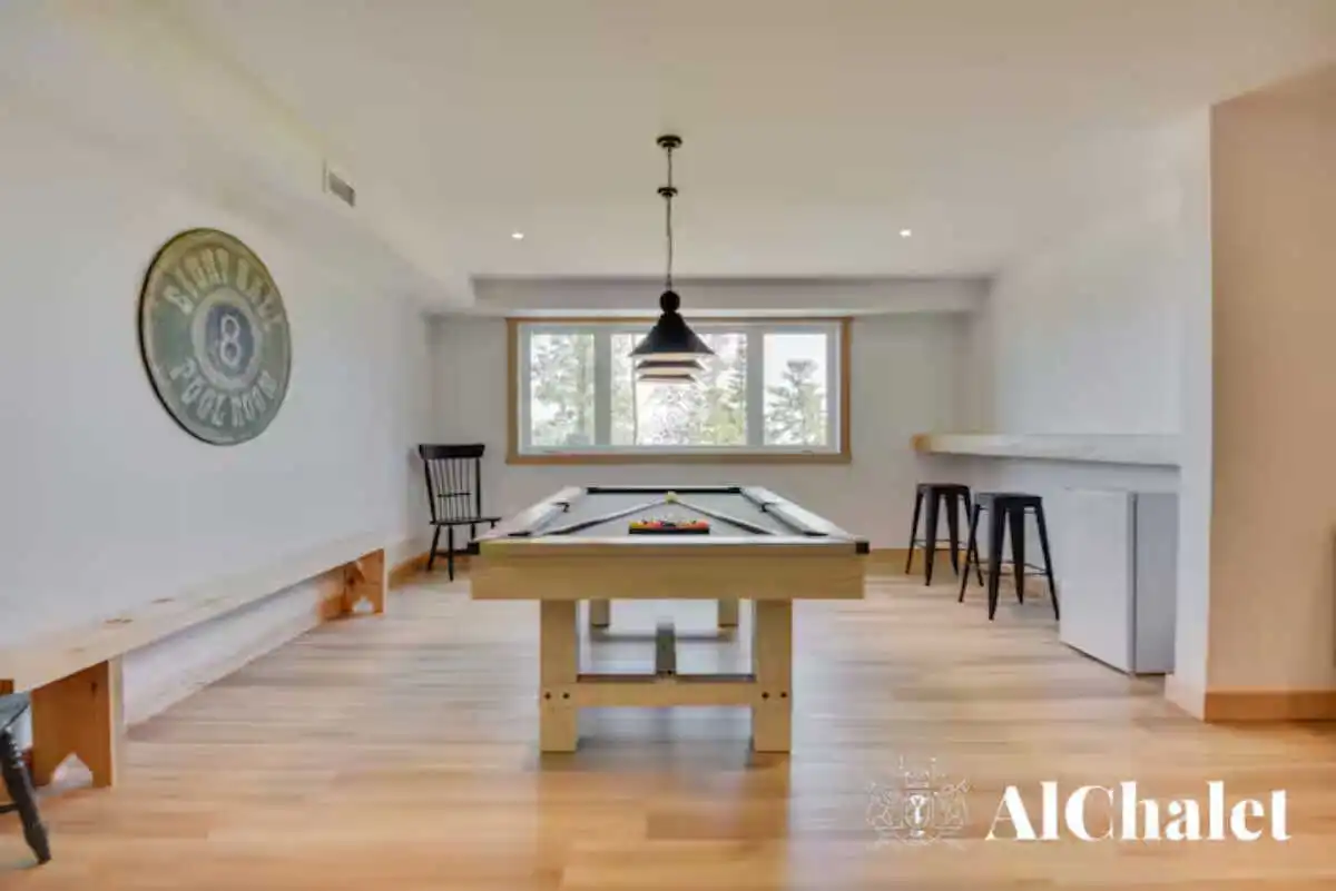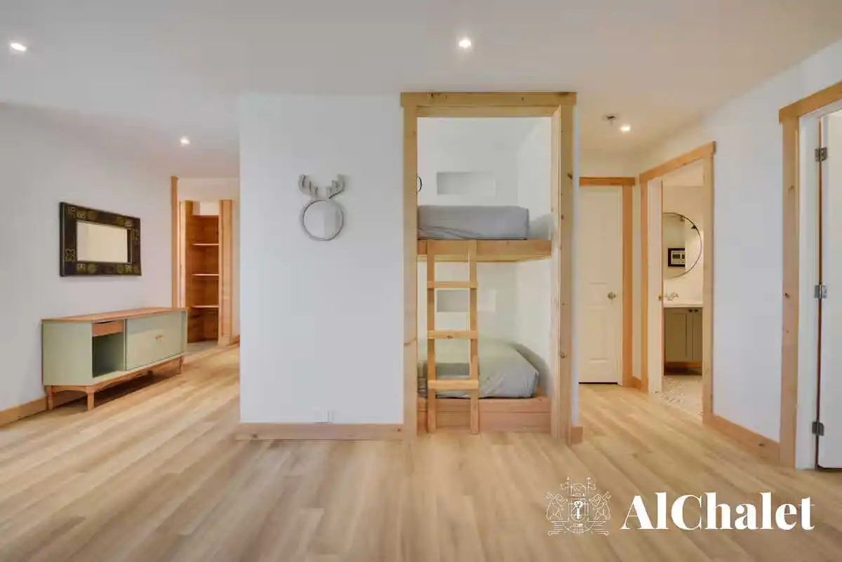 Le chalet dispose de trois chambres et de 4 lits pour 8 personnes, dont une mezzanine surplombant le salon et offrant un panorama unique sur les arbres. Le sous-sol est équipé d'un lit simple superposé et d'un billard, idéal pour se détendre et pour le plaisir des plus jeunes. Deux salles de bains sont à votre disposition.