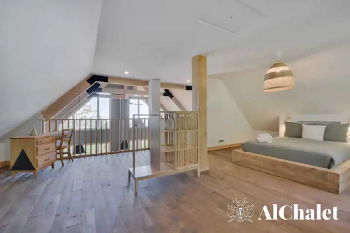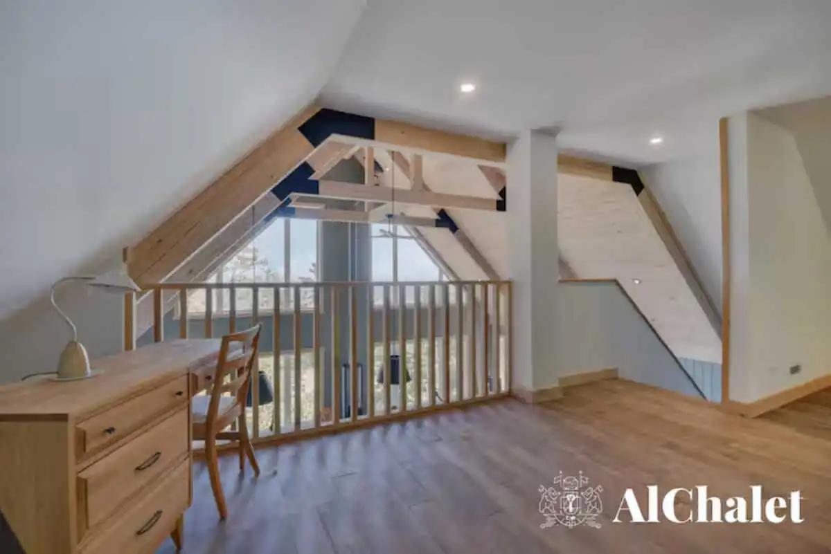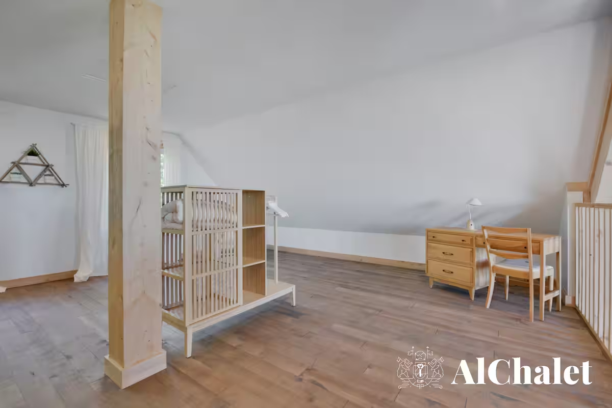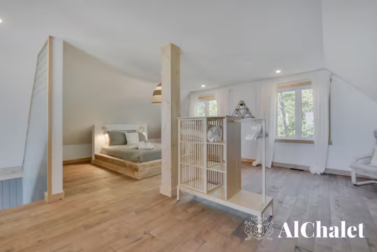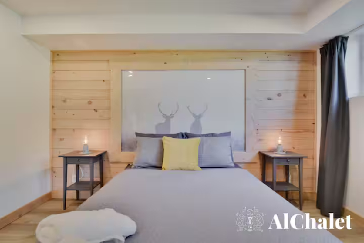 Le chalet dispose de trois chambres et de 4 lits pour 8 personnes, dont une mezzanine surplombant le salon et offrant un panorama unique sur les arbres. Le sous-sol est équipé d'un lit simple superposé et d'un billard, idéal pour se détendre et pour le plaisir des plus jeunes. Deux salles de bains sont à votre disposition.