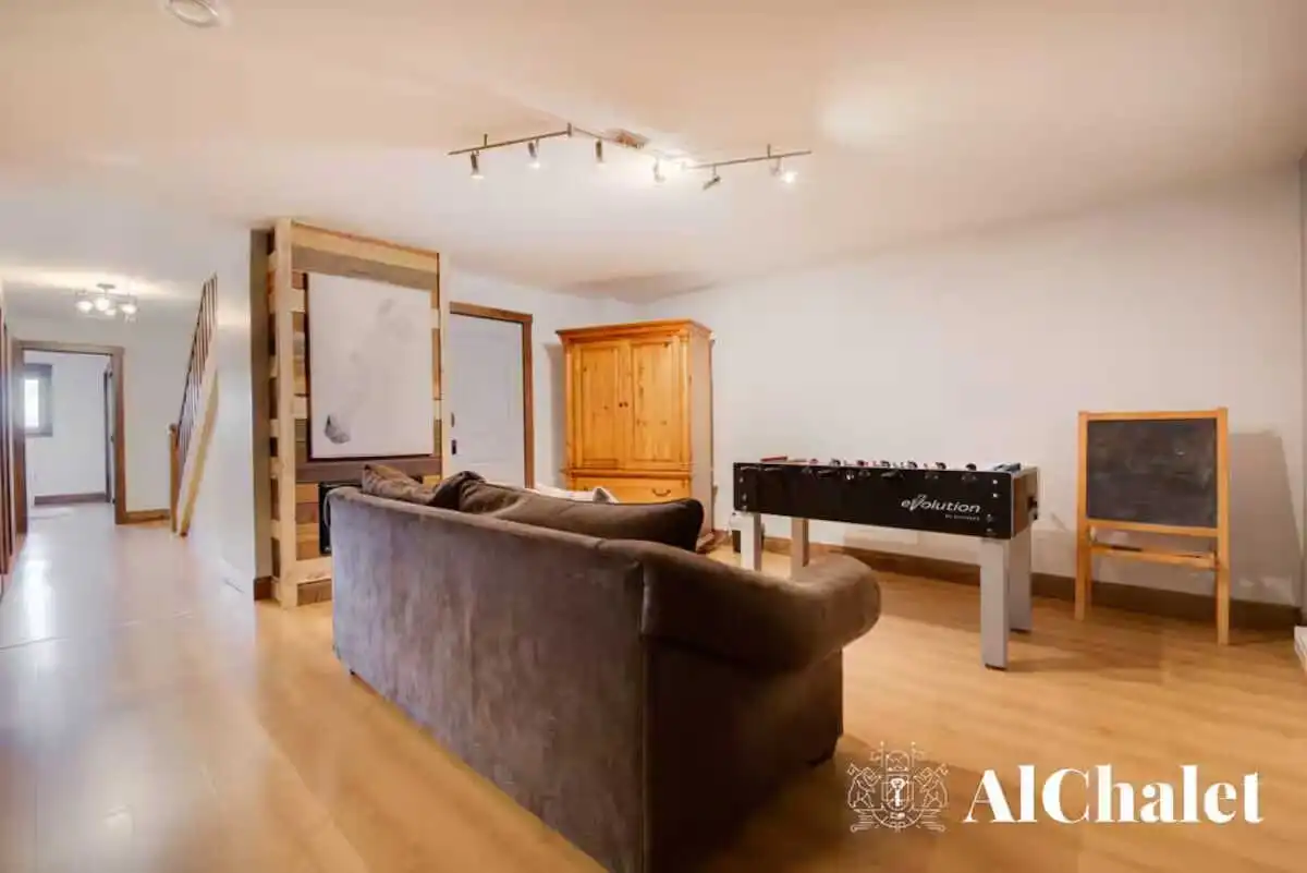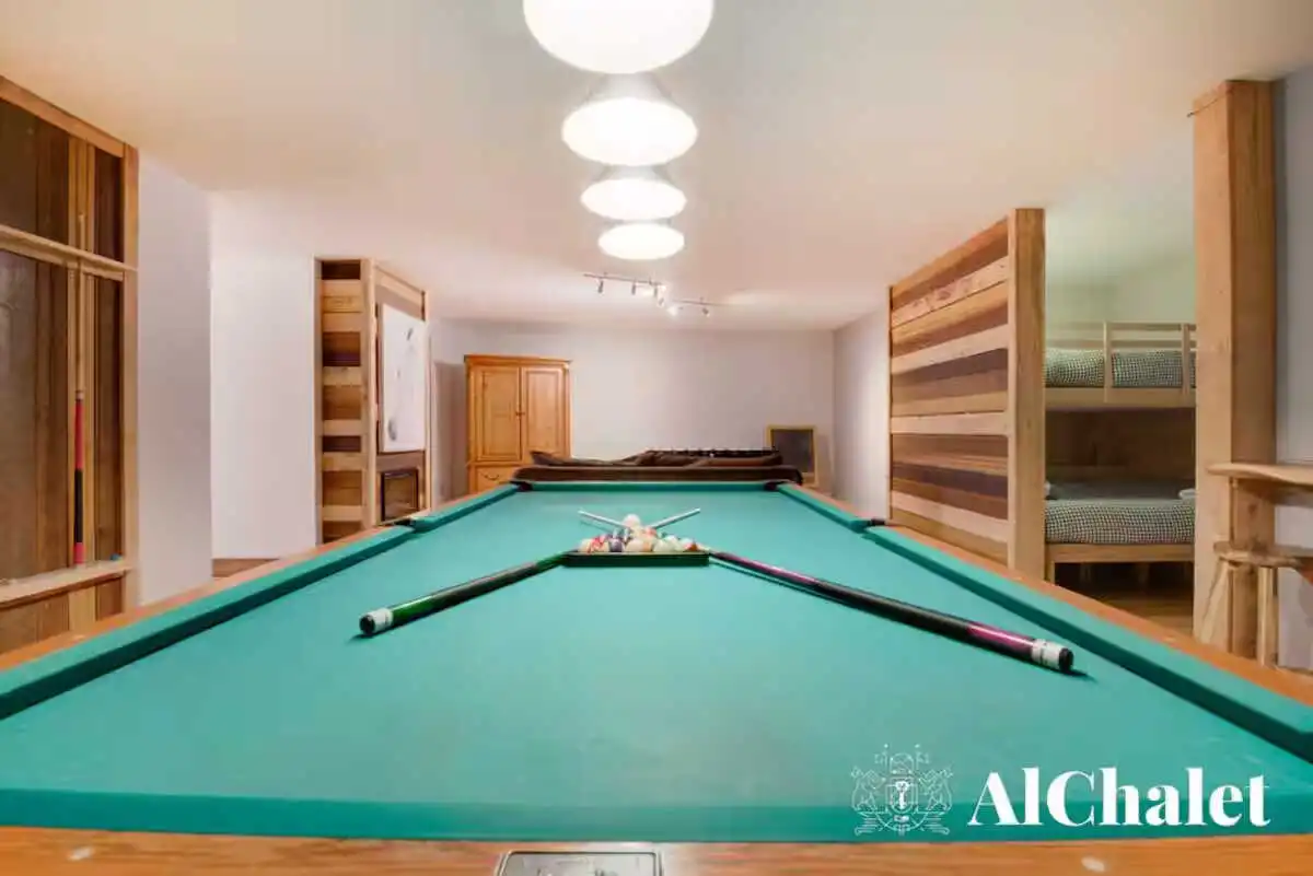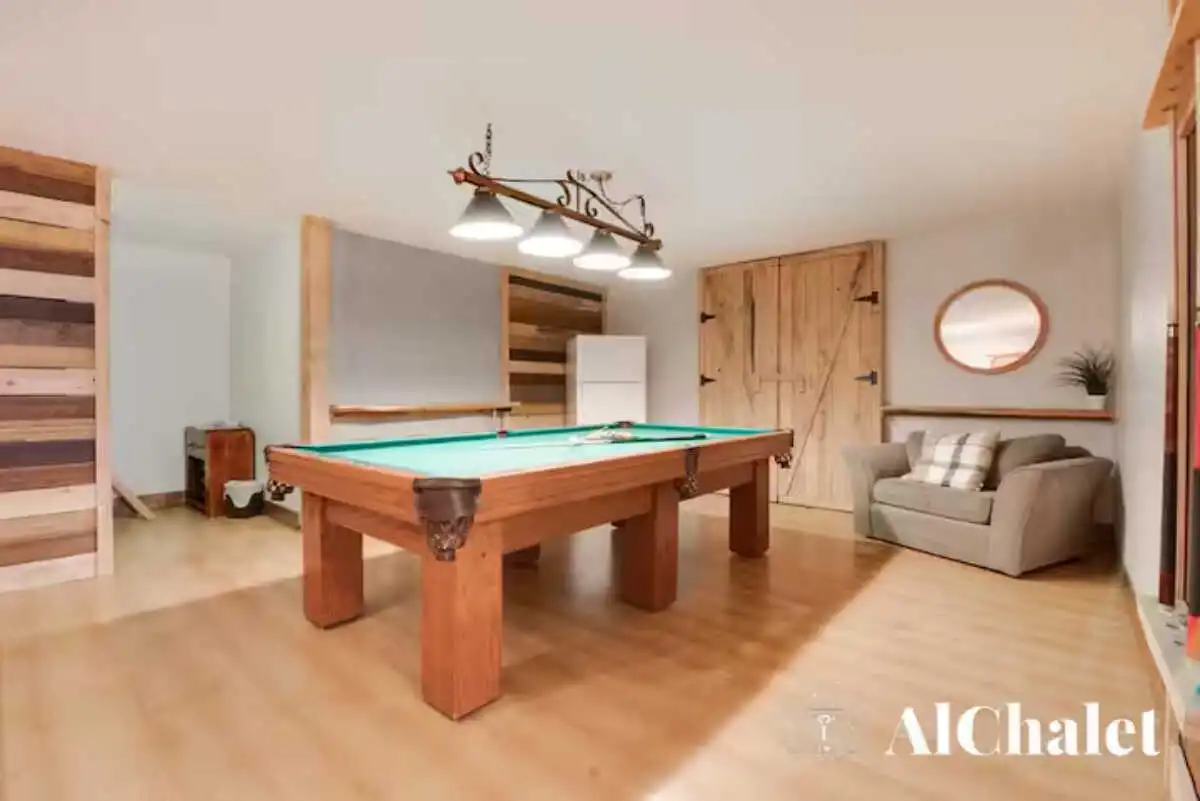 Pour les moments de loisirs, Villa Alpine dispose d'une salle de jeux équipée d'un billard et d'un baby-foot, parfaits pour divertir petits et grands. La cuisine entièrement équipée, avec son îlot central et sa grande table à manger, est un espace convivial pour préparer et partager de délicieux repas en famille ou entre amis.