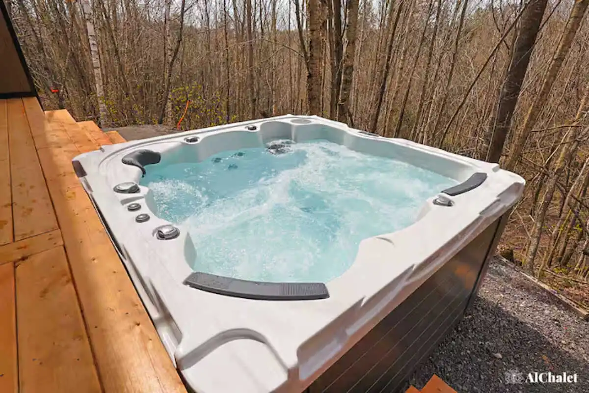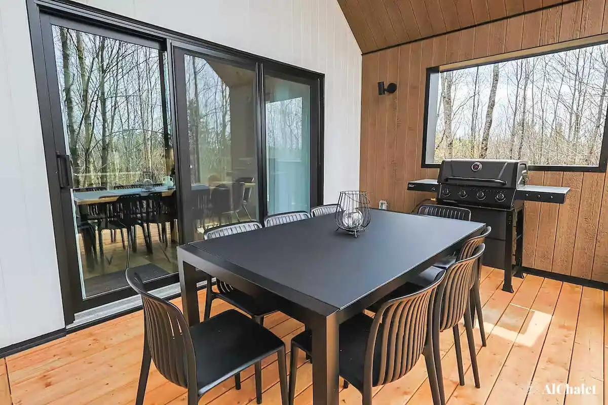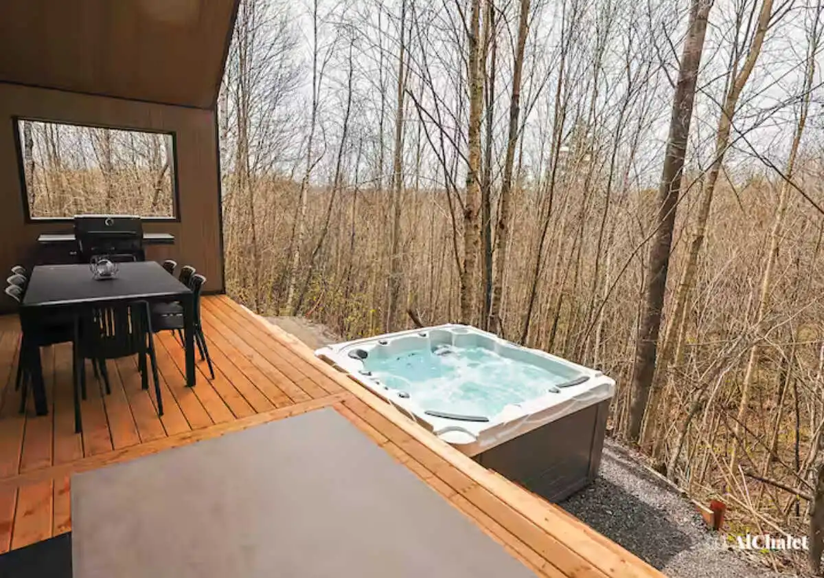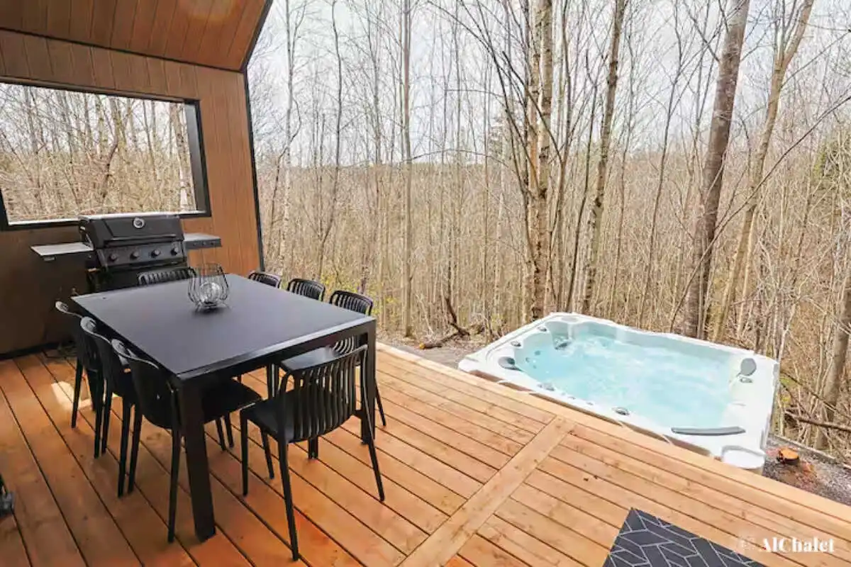 À l’extérieur, la nature s’invite à table. Une grande terrasse couverte avec BBQ, un coin salon pour l’apéro, et juste en contrebas, un spa privé qui surplombe le boisé. On s’y installe, on ferme les yeux, et on écoute le vent jouer dans les branches.