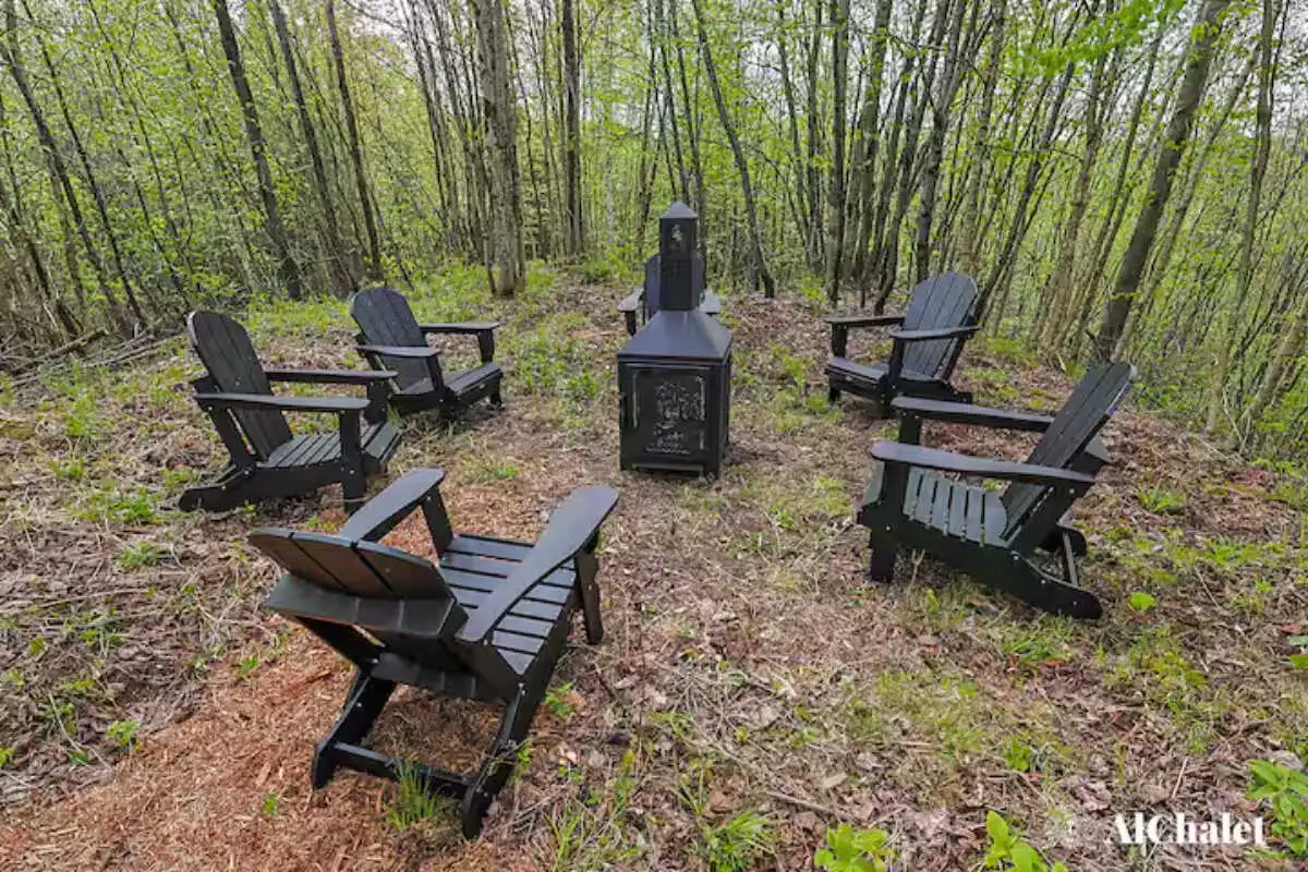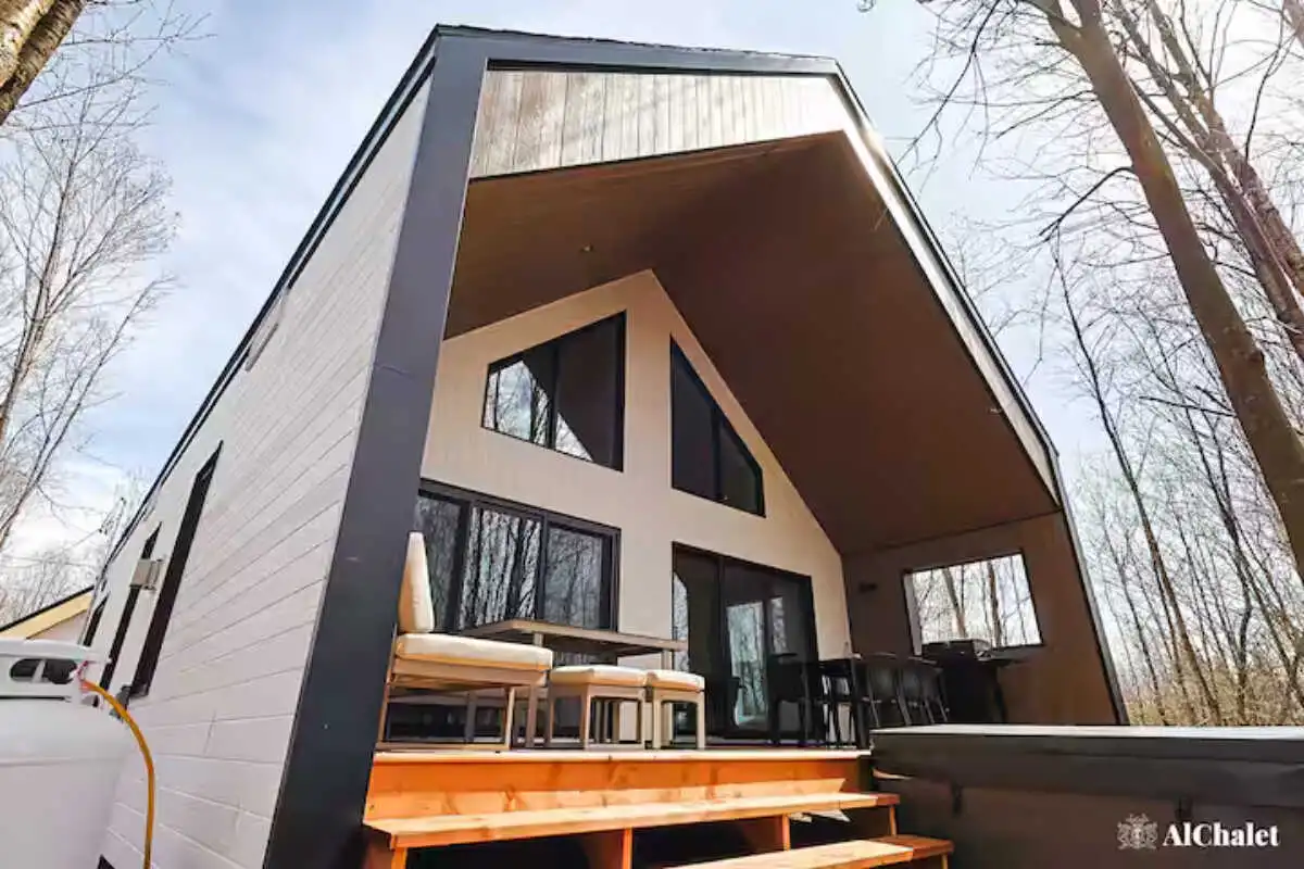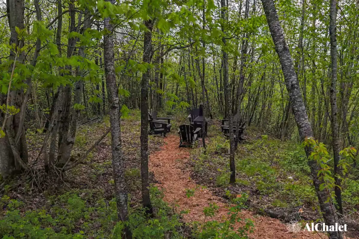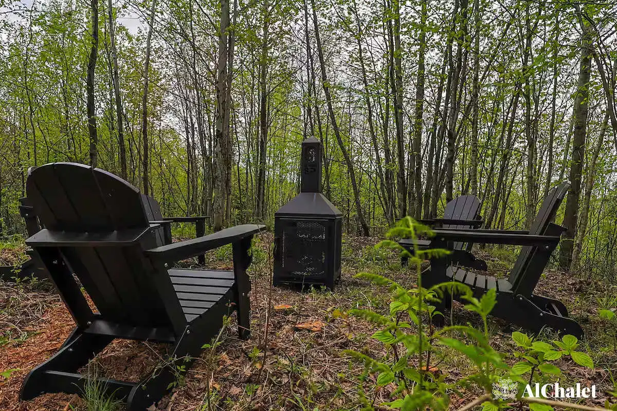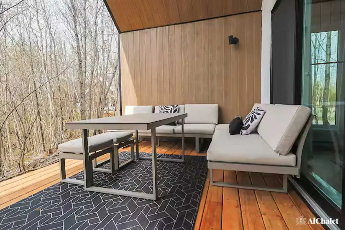 À l’extérieur, la nature s’invite à table. Une grande terrasse couverte avec BBQ, un coin salon pour l’apéro, et juste en contrebas, un spa privé qui surplombe le boisé. On s’y installe, on ferme les yeux, et on écoute le vent jouer dans les branches.