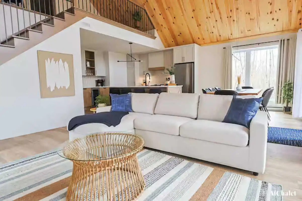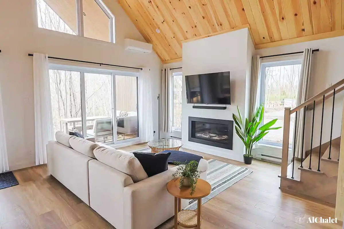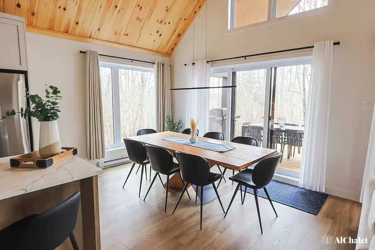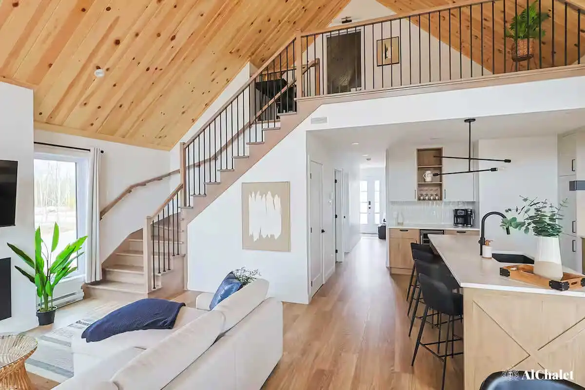 Le Bosquet vous accueille au cœur du Domaine du Grand Portneuf dans un décor moderne et minimaliste, parfait pour se ressourcer en nature. Avec ses grandes fenêtres et son toit cathédrale, la lumière naturelle habille les espaces de vie d’une ambiance apaisante, mettant en valeur une décoration soignée, épurée et chaleureuse.