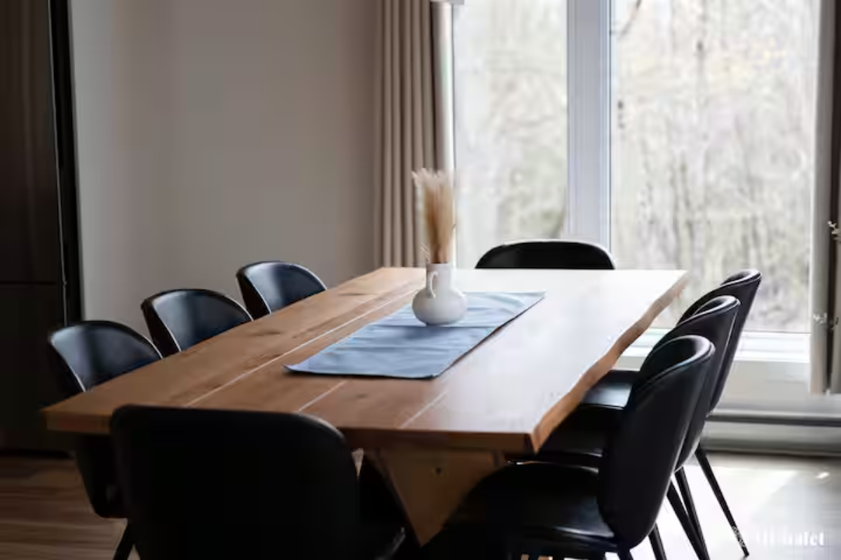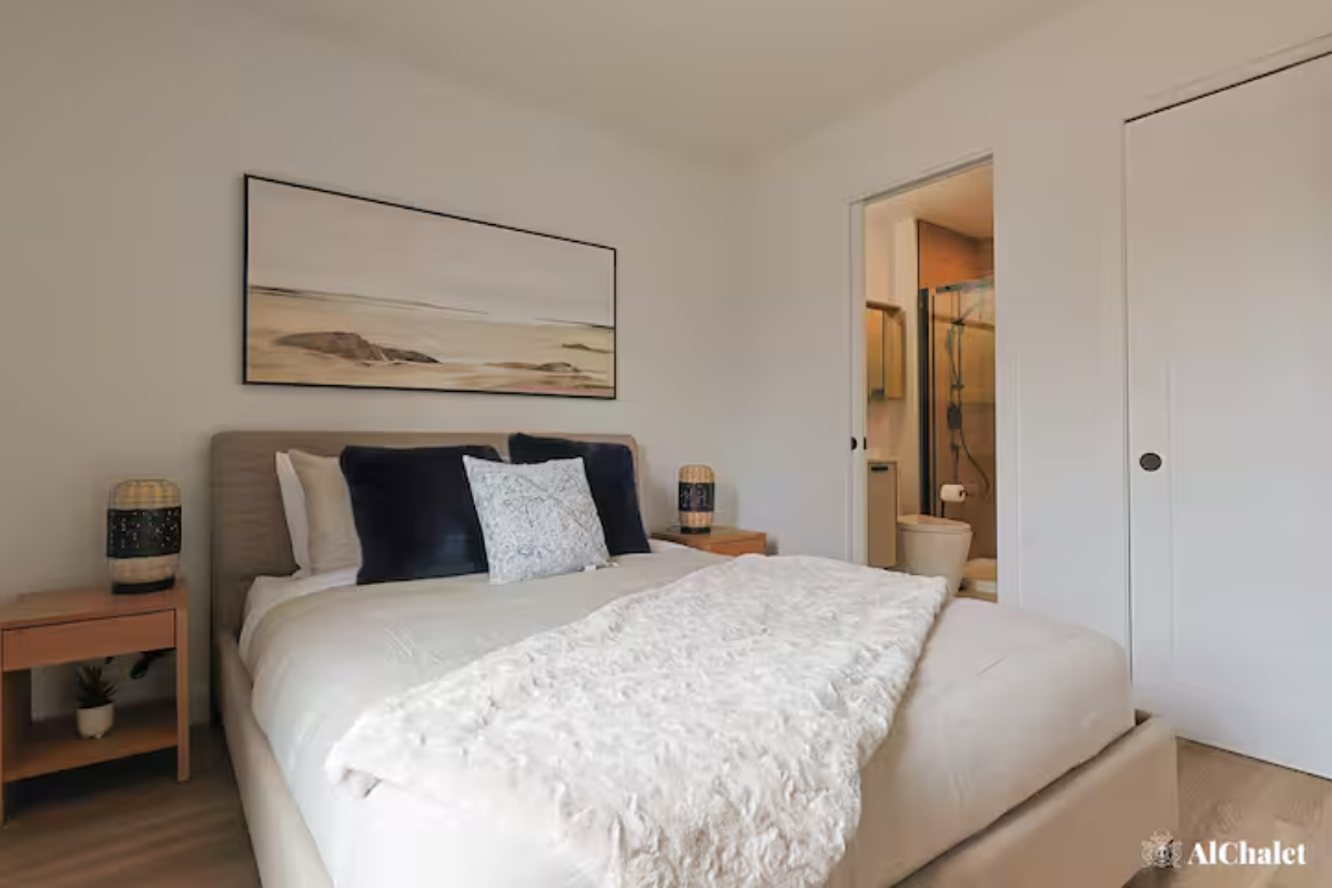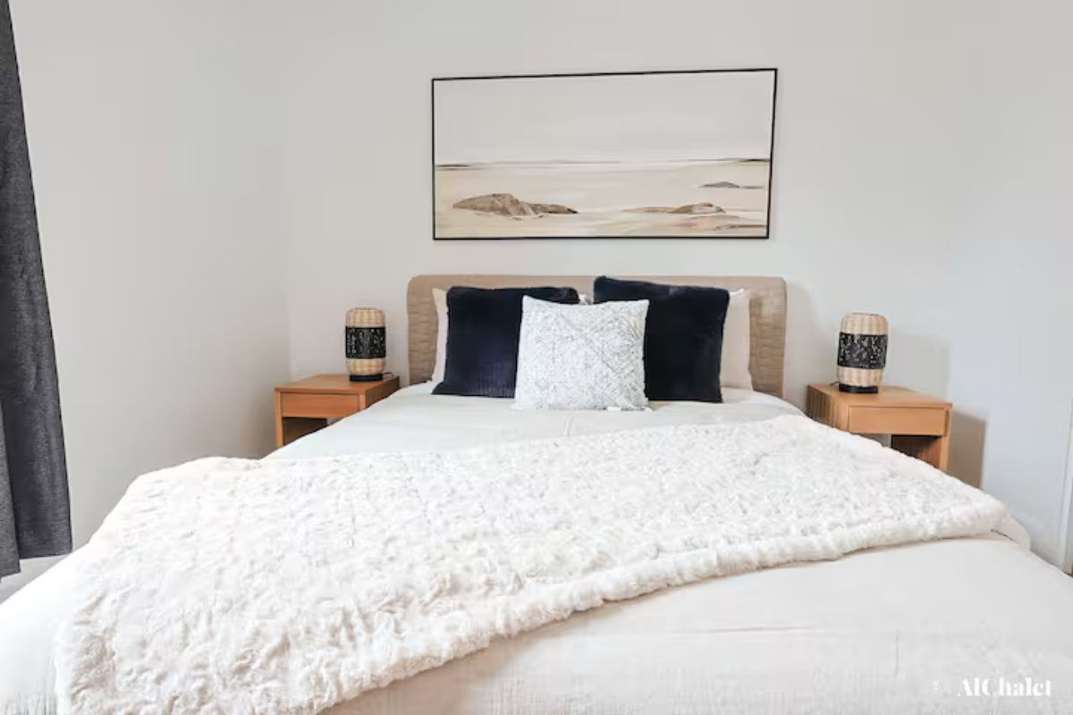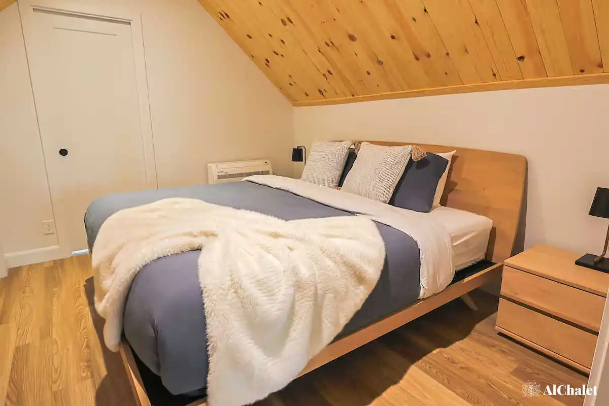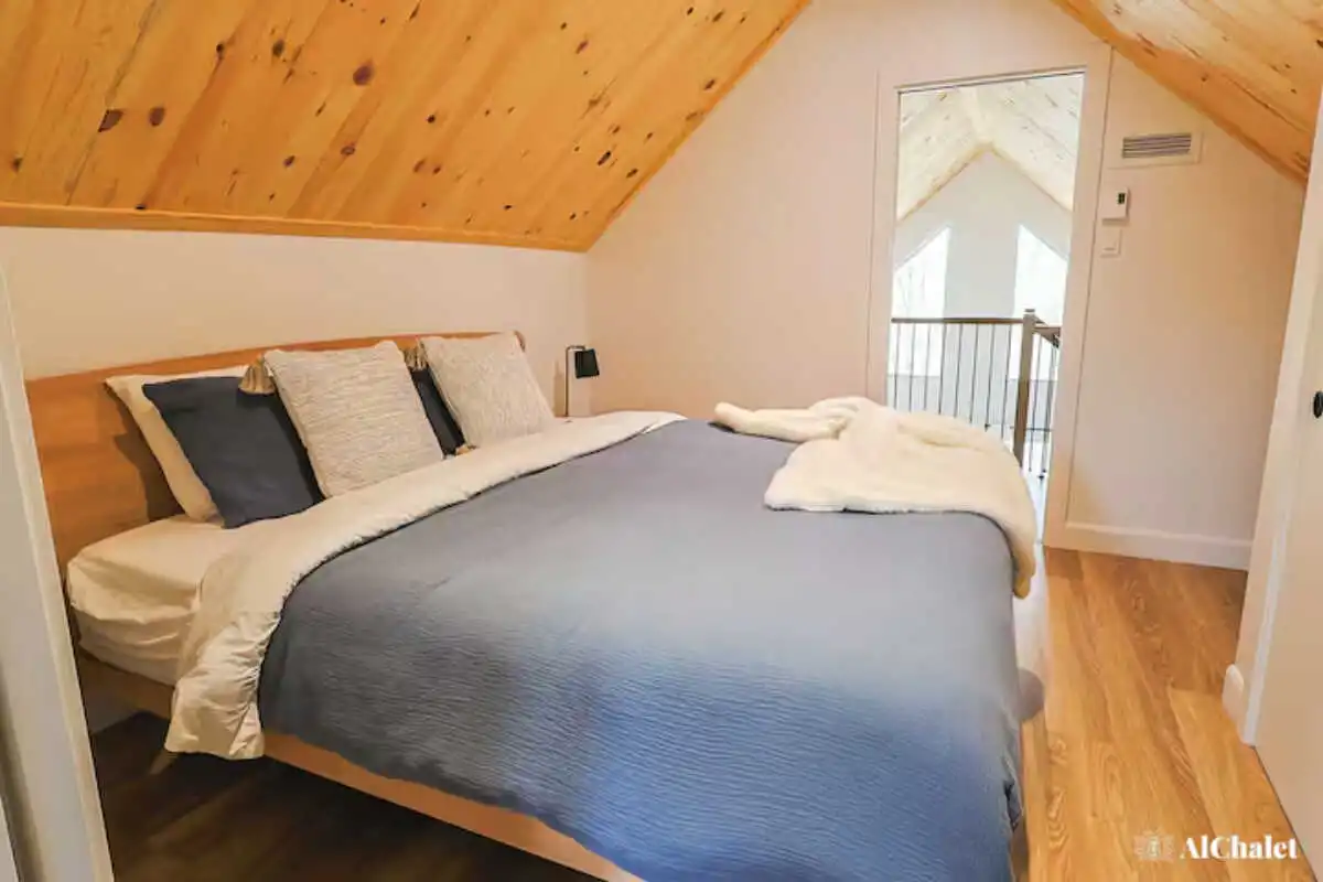 Pensé pour accueillir jusqu’à 8 personnes, le chalet allie minimalisme chaleureux et confort moderne. Trois chambres douillettes, trois salles de bain fonctionnelles, un salon accueillant avec foyer électrique, et un petit bureau en mezzanine pour les moments plus calmes : tout est à sa place, rien n’est superflu.