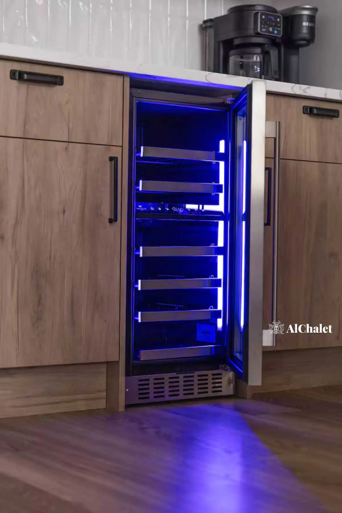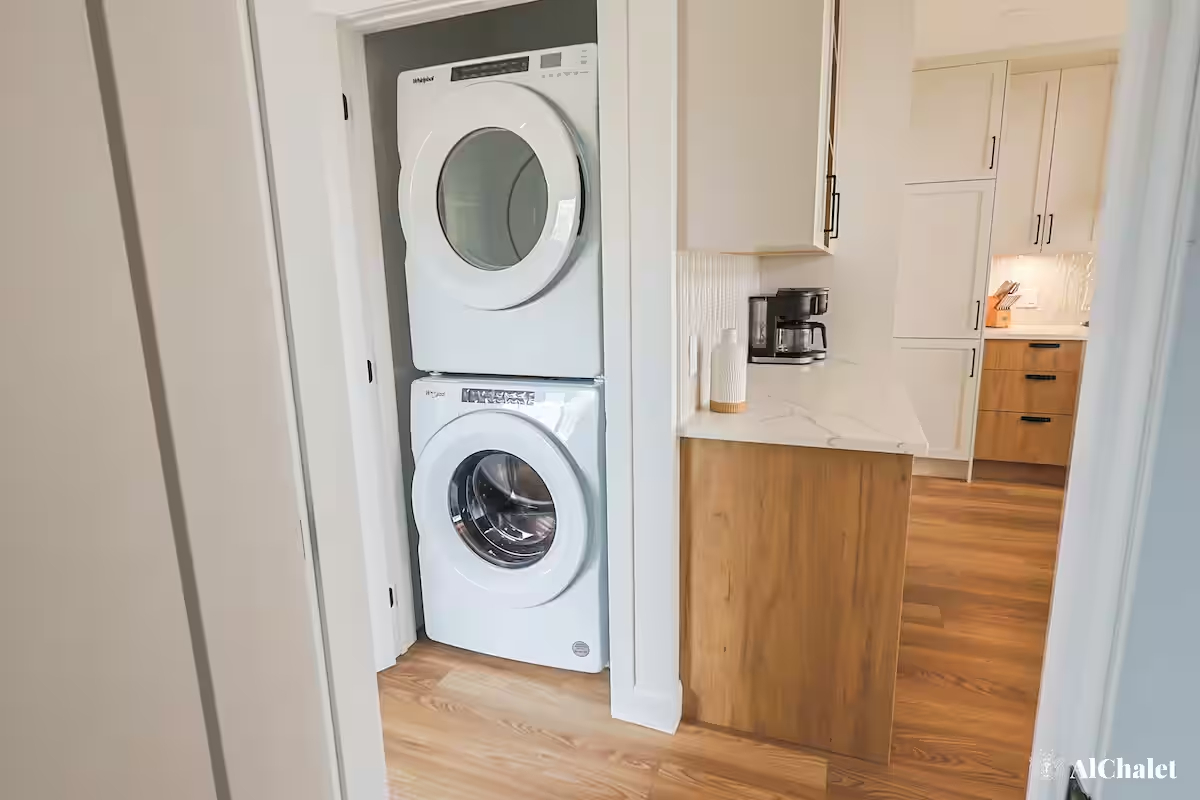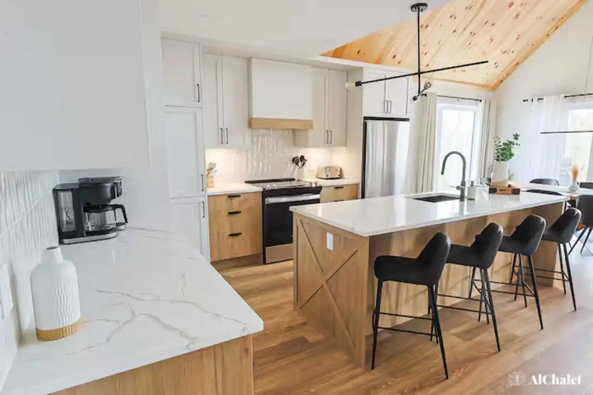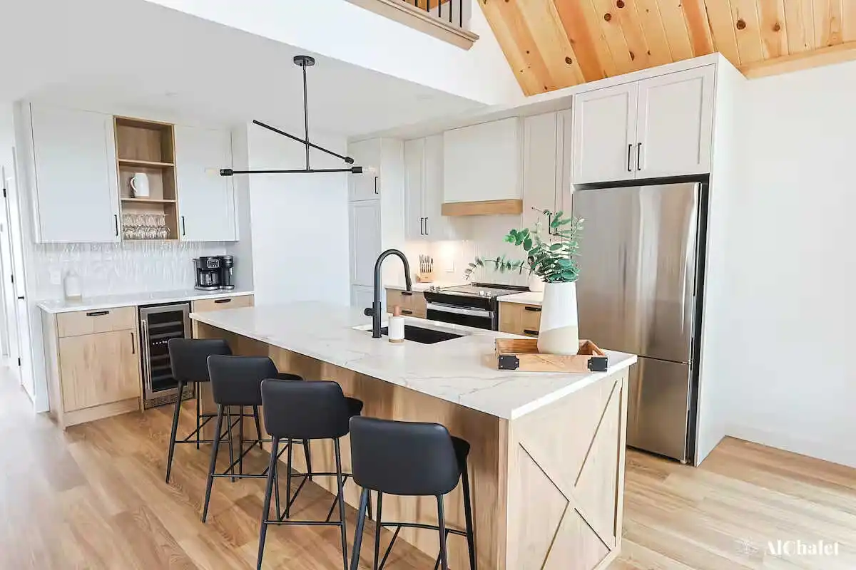 La cuisine ouverte, moderne et entièrement équipée, devient un lieu de rassemblement naturel. Que ce soit pour l’heure du brunch ou celle du souper, elle inspire la convivialité avec son grand îlot central, son frigo à vin intégré et un coin café qui ravira les amateurs de réveils en douceur.