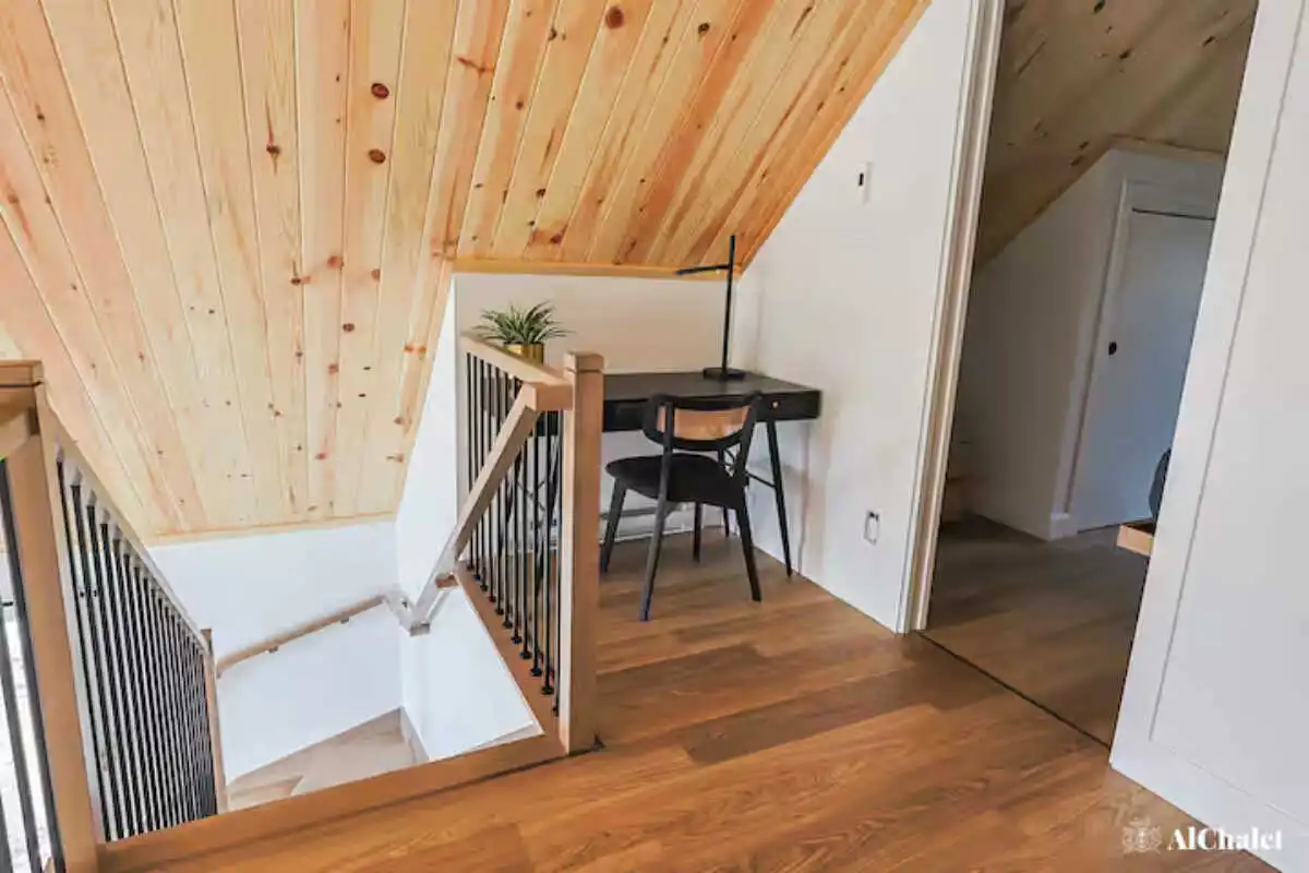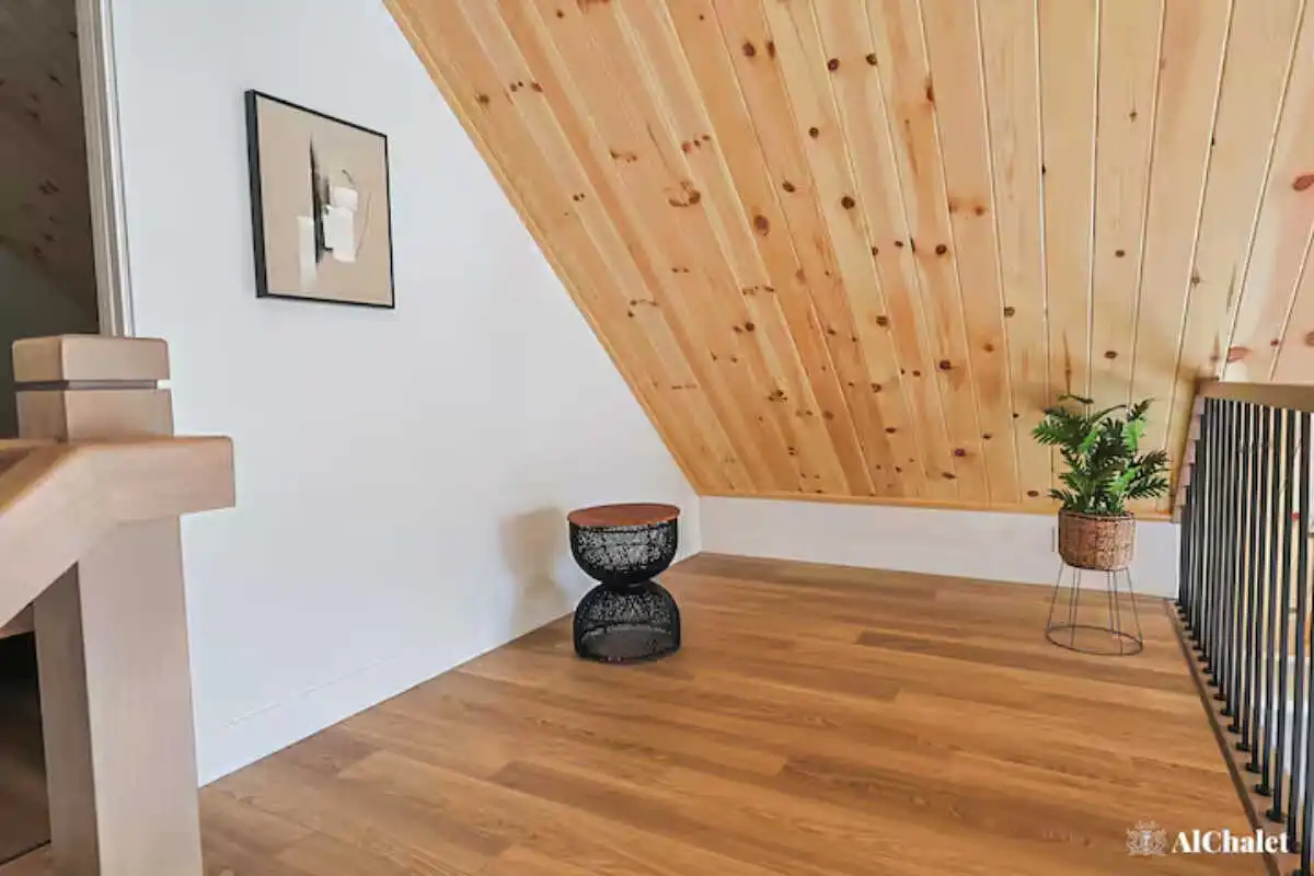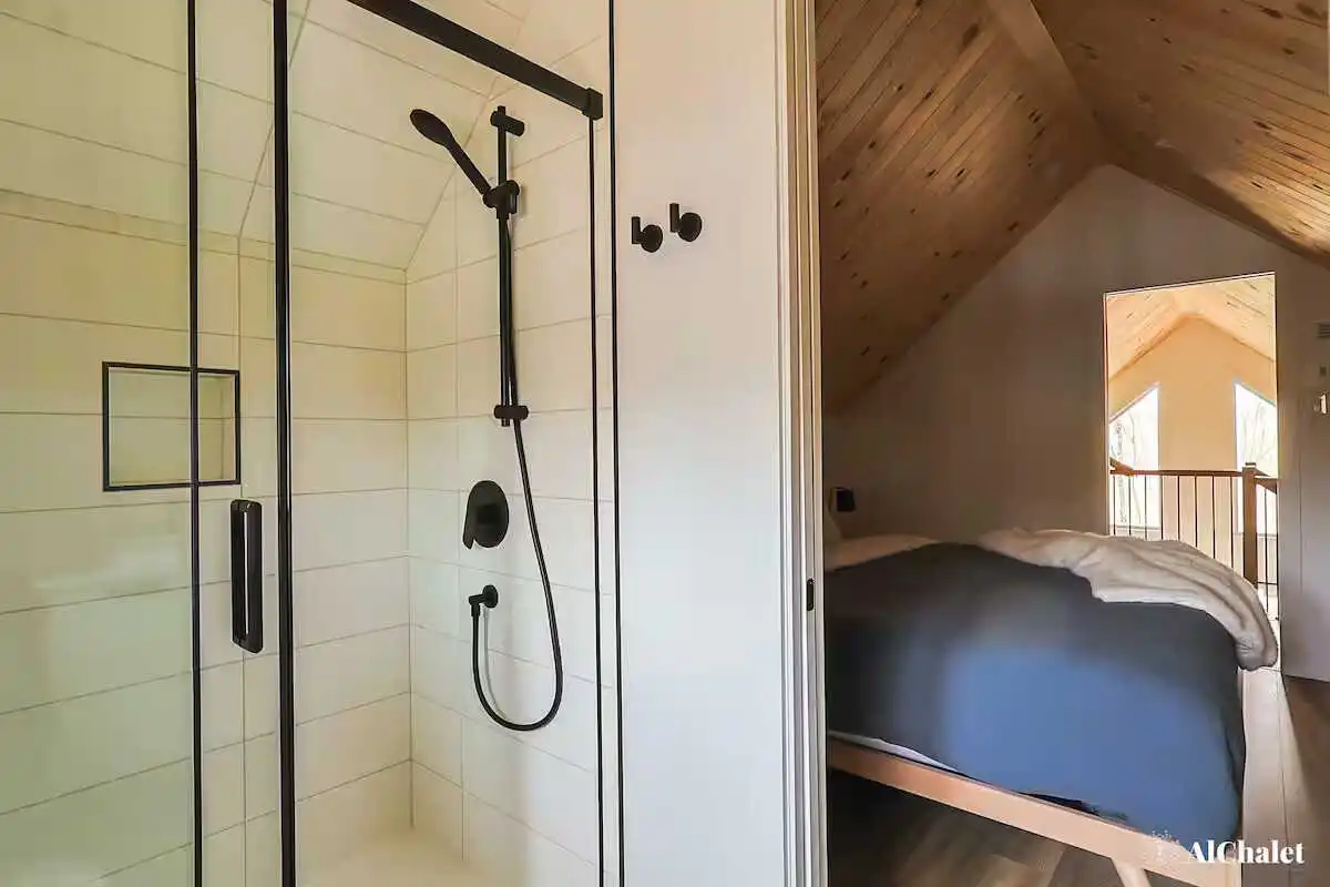 Le chalet dispose de 3 chambres, 3 salles de bain et d’un salon spacieux avec foyer électrique. La mezzanine offre un petit coin bureau idéal pour lire, travailler ou simplement admirer la vue sur la forêt.