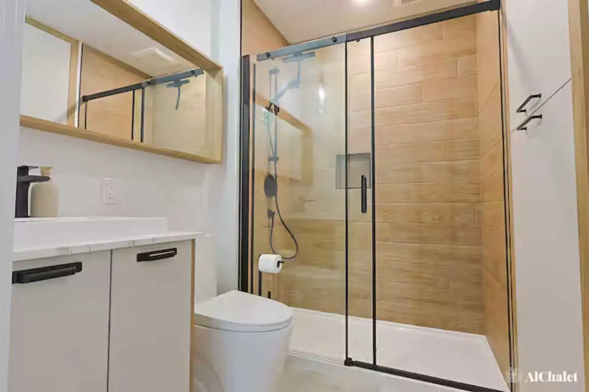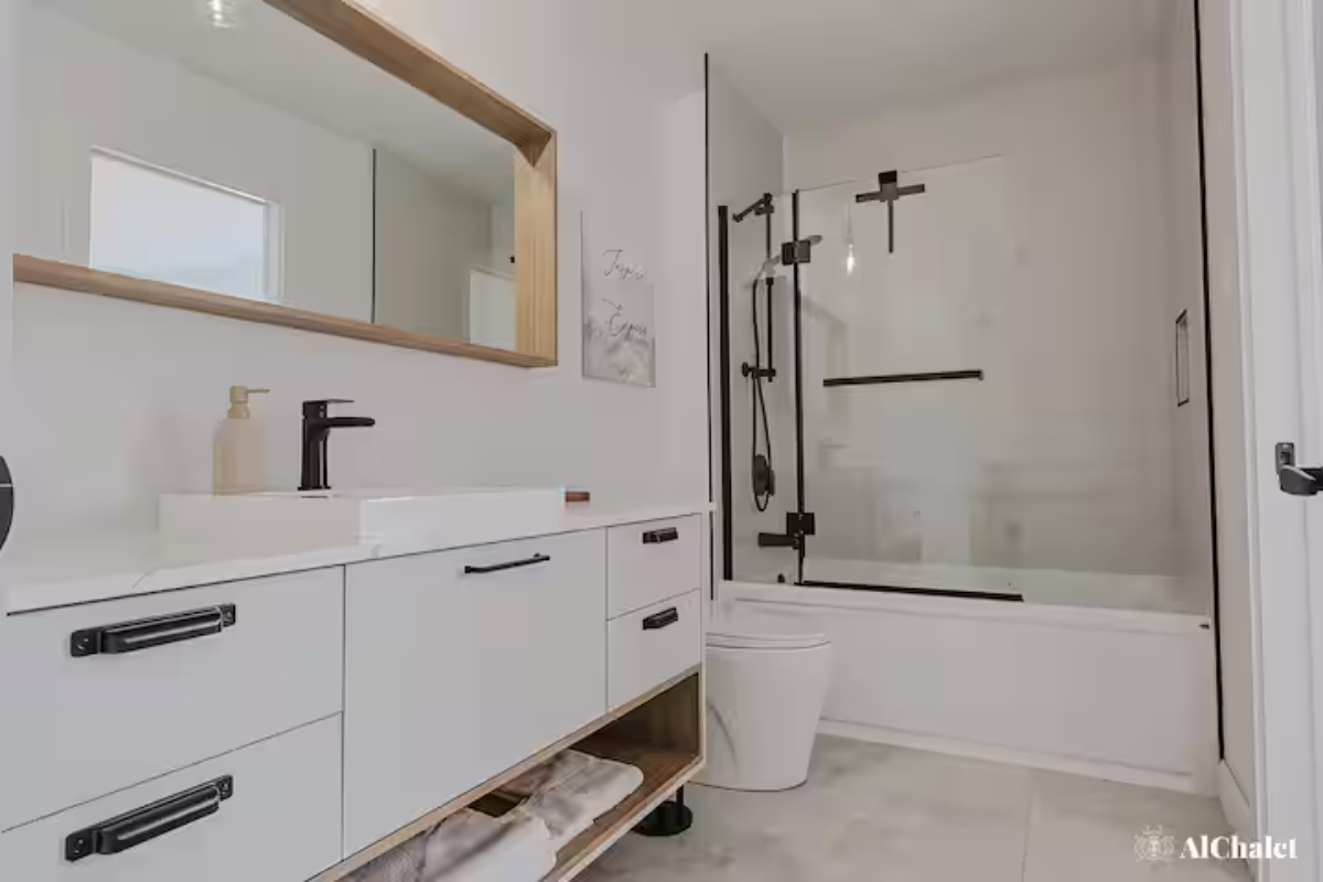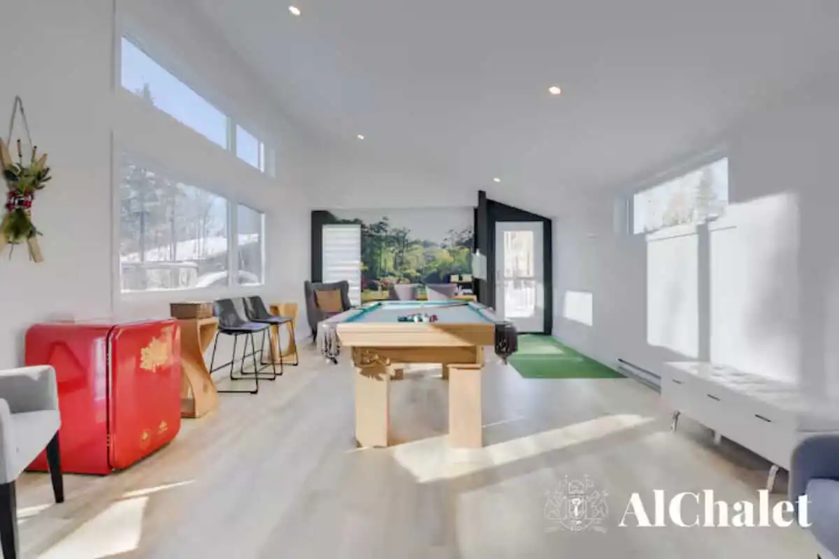 Nos clients ont accès à l'ensemble du chalet et à toutes ses installations. Vous pourrez également profiter des espaces communs avec le salon avec télé et billard, de la terrasse extérieure, de la piscine chauffée (été seulement), du sauna et du spa.
