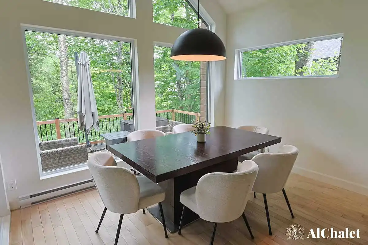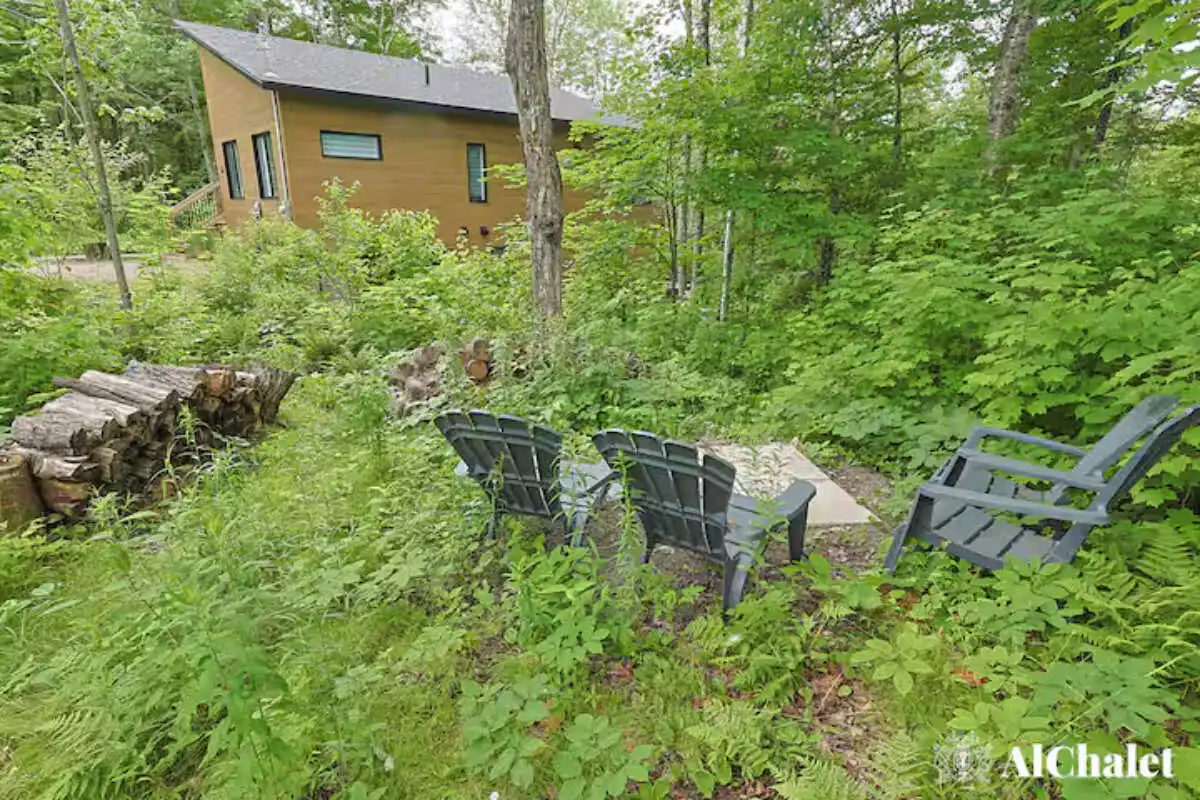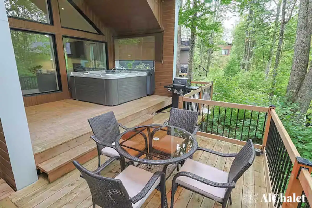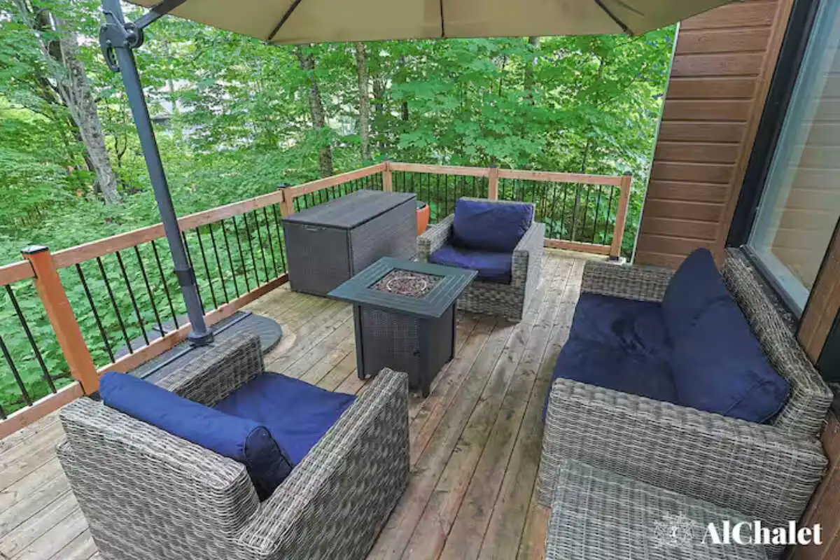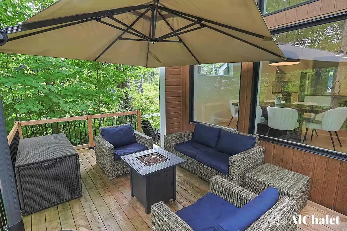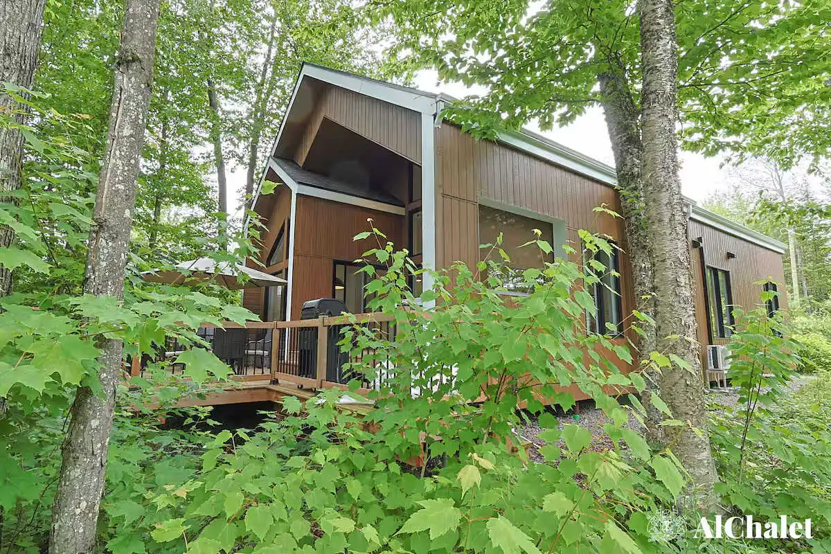 Avec ses 2 chambres, ses 2 salles de bain, et son foyer intérieur, le chalet offre tout le confort nécessaire pour se détendre en toute saison. À l’extérieur, la spacieuse terrasse devient un véritable lieu de rassemblement : coin salon, espace repas avec BBQ, foyer extérieur et spa privé avec vue sur le boisé, parfaits pour prolonger les soirées sous les étoiles.
