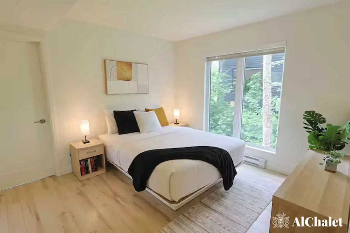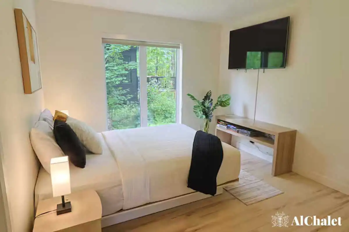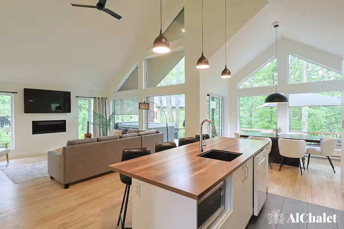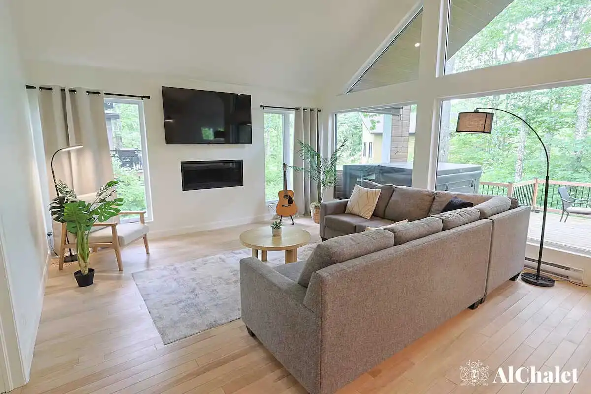 Accueillant jusqu’à 6 personnes, le chalet déploie 2 chambres et 2 salles de bain, parfaits pour un séjour en famille ou entre amis. Le salon lumineux, animé par un foyer intérieur, devient le cœur des journées d’hiver, alors qu’en été, c’est la terrasse qui vole la vedette. Surplombant le boisé, elle réunit tout pour profiter des soirées : coin détente, table pour partager un repas au BBQ, foyer extérieur et spa privé où l’on savoure le calme, bercé par le chant des arbres.