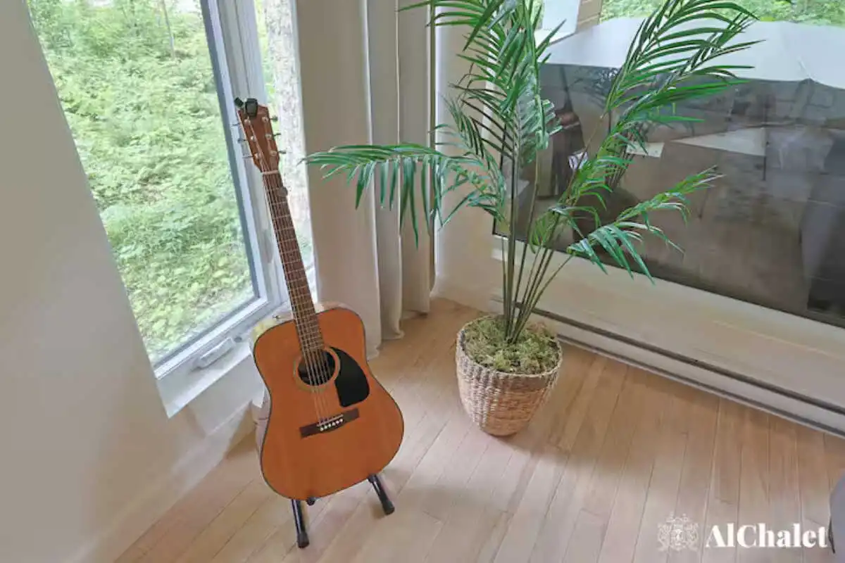 Pour les moments de détente, une guitare est à disposition, ajoutant une touche conviviale à ce cocon moderne pensé pour les séjours en famille ou entre amis.