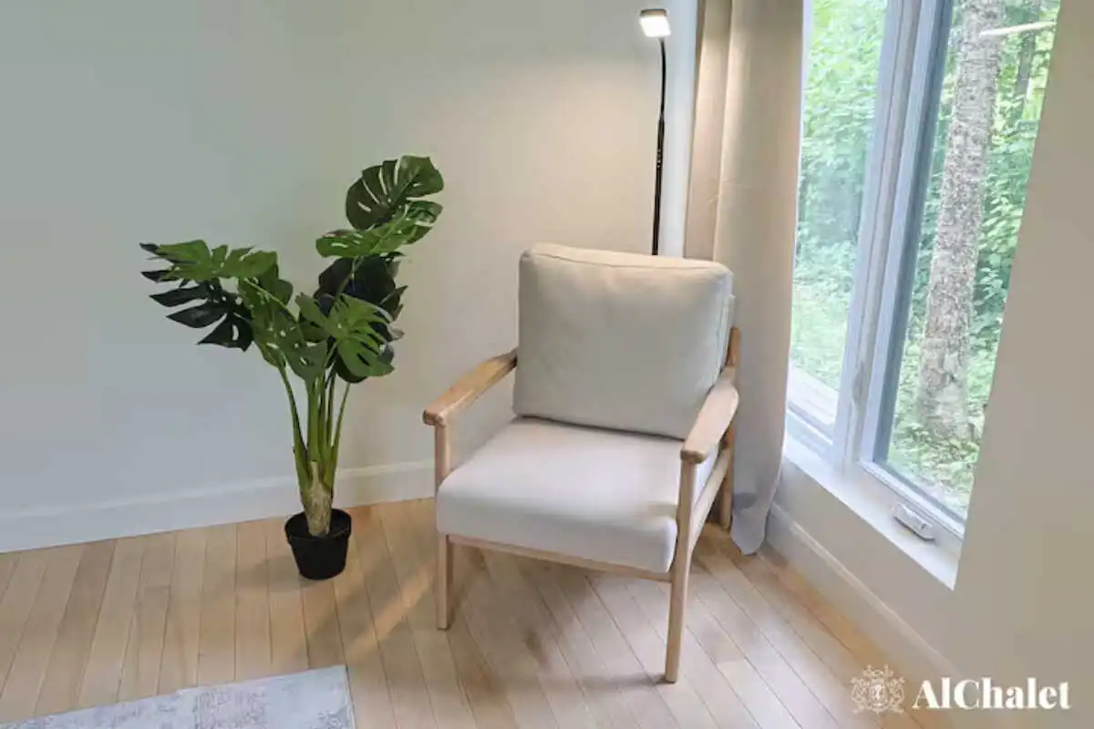 ès qu’on entre au chalet Fima, on ressent une atmosphère qui apaise instantanément. Les tons clairs et le bois blond enveloppent l’espace d’une lumière douce, tandis que les immenses fenêtres révèlent la forêt qui s’étend tout autour. Ici, tout est pensé pour que le regard et l’esprit puissent respirer.