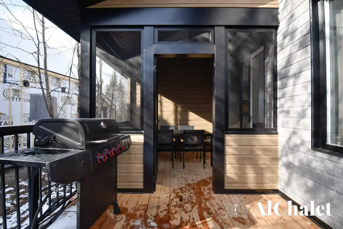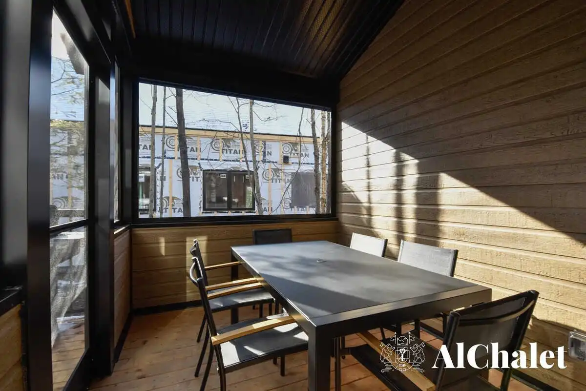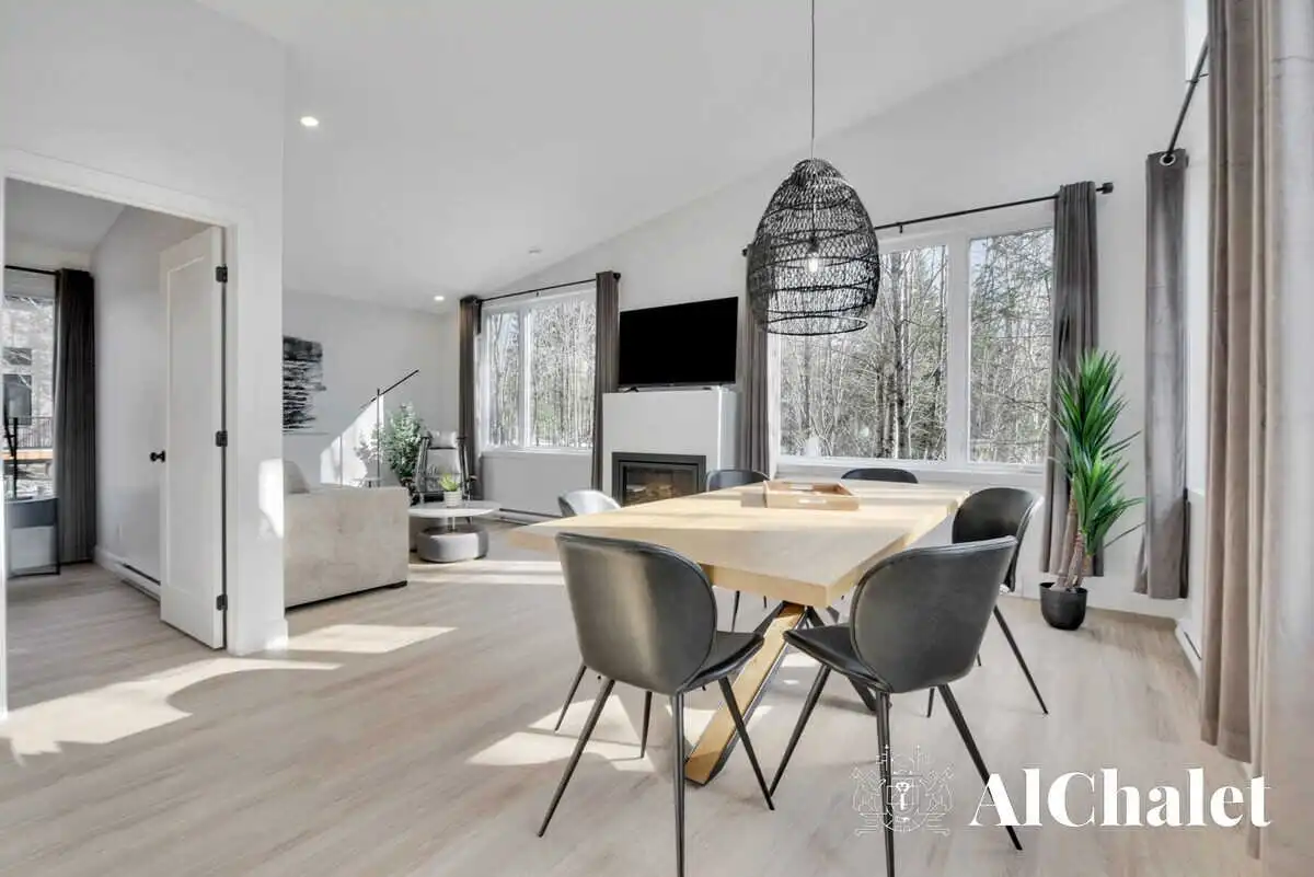 La pièce de vie ouverte séduit dès l’entrée avec sa cuisine moderne, son coin repas lumineux et son salon convivial agrémenté d’un foyer. À l’extérieur, vous profiterez d’un spa privé avec vue sur les arbres, ainsi que d’une terrasse fermée pour savourer les repas en toute tranquillité, peu importe la saison.