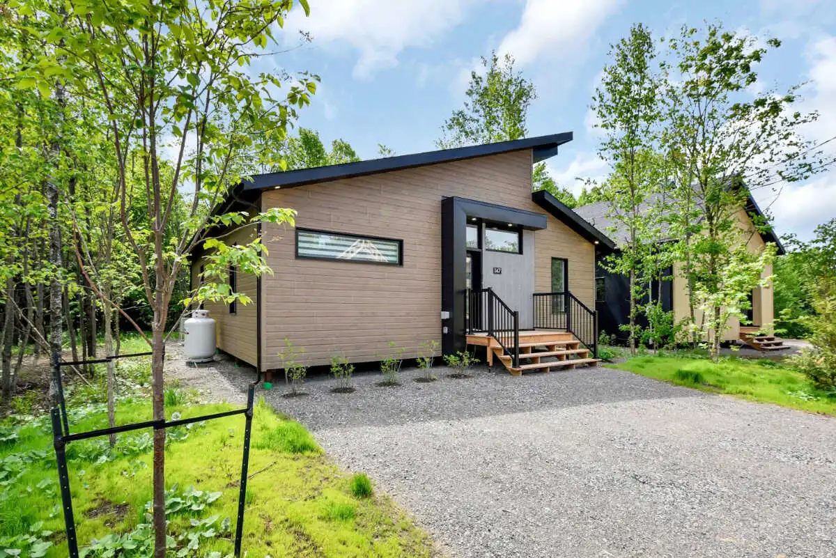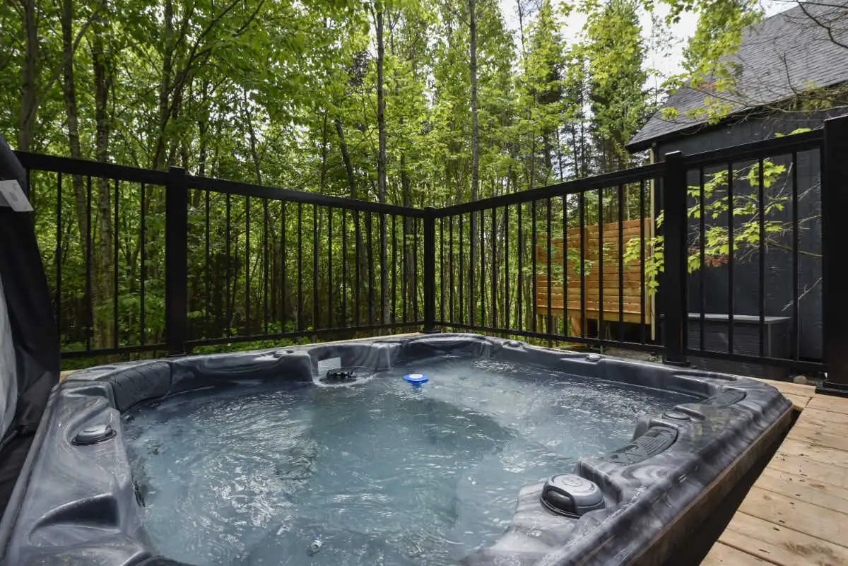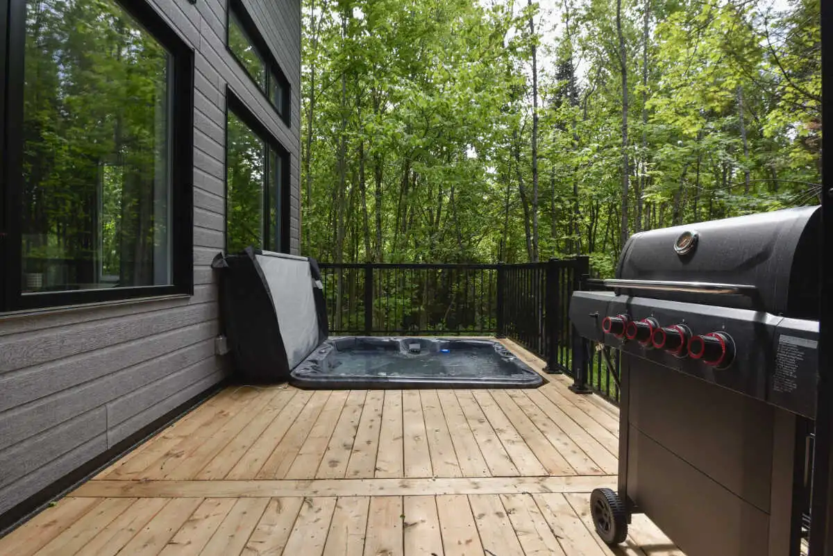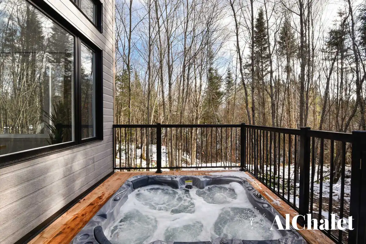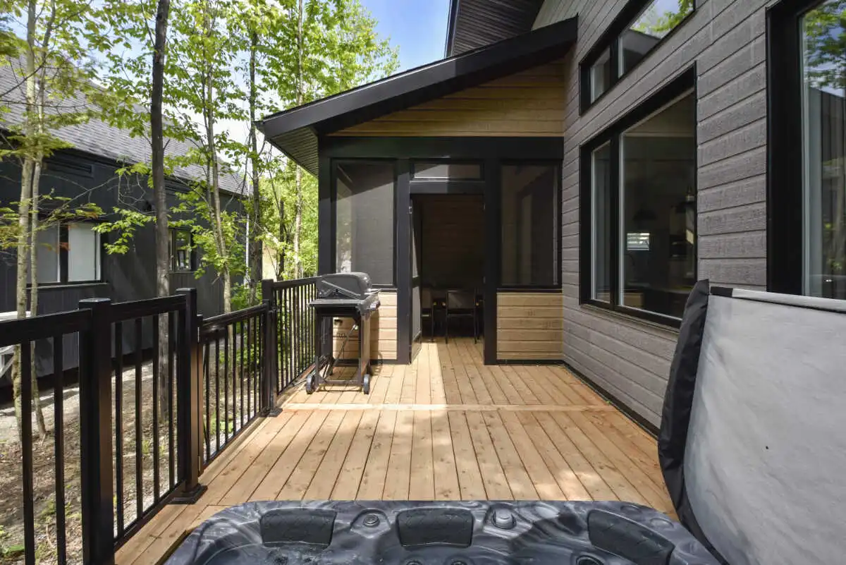Et à l’extérieur, c’est la nature qui prend le relais. Une terrasse couverte pour prolonger les soirées, un spa privé avec vue sur le boisé pour se détendre été comme hiver… même vos compagnons à quatre pattes ont leur place dans ce moment suspendu.