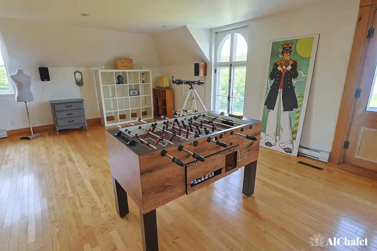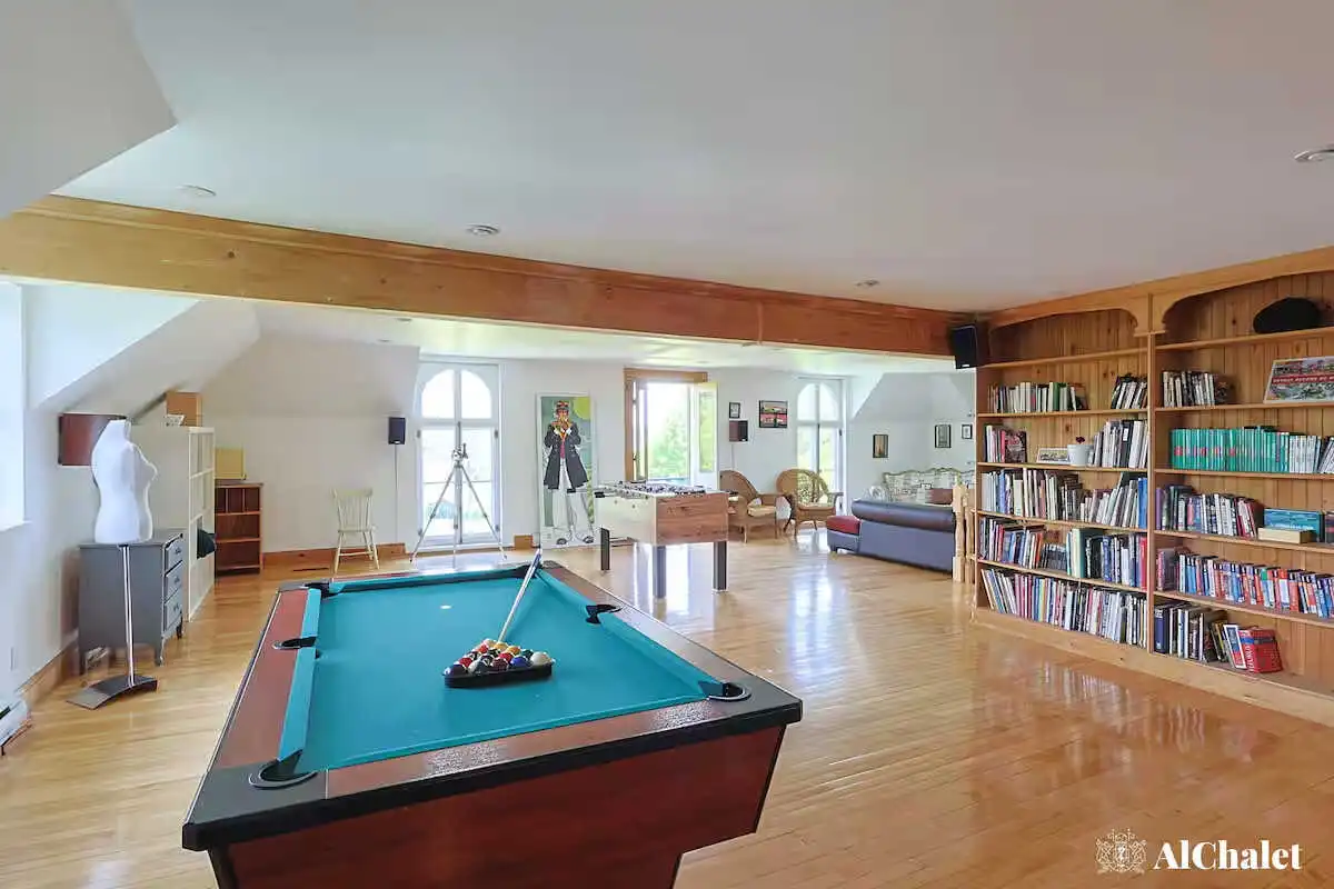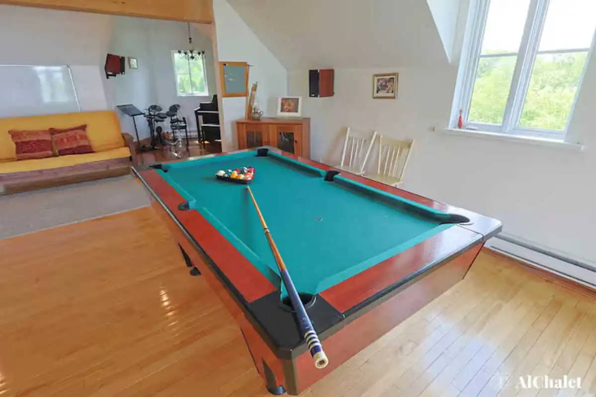 Vous aurez le privilège de profiter pleinement de toute la maison et de ses équipements. Détendez-vous dans les espaces communs chaleureux, comme le salon équipé d’une télévision, la salle de jeux avec billard et babyfoot, ou encore la grande terrasse extérieure et son trampoline dans le jardin. Pour des moments magiques, rendez-vous au gazebo qui offre une vue sur le fleuve Saint-Laurent.