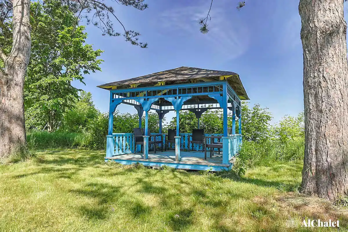 Au bout du terrain, le gazebo vous offre un point de vue privilégié pour admirer des couchers de soleil spectaculaires, tandis que le foyer de bois promet des soirées chaleureuses et mémorables. Vos compagnons à quatre pattes sont également les bienvenus pour profiter de ce vaste espace de verdure, dans un environnement à la fois accueillant et confortable.