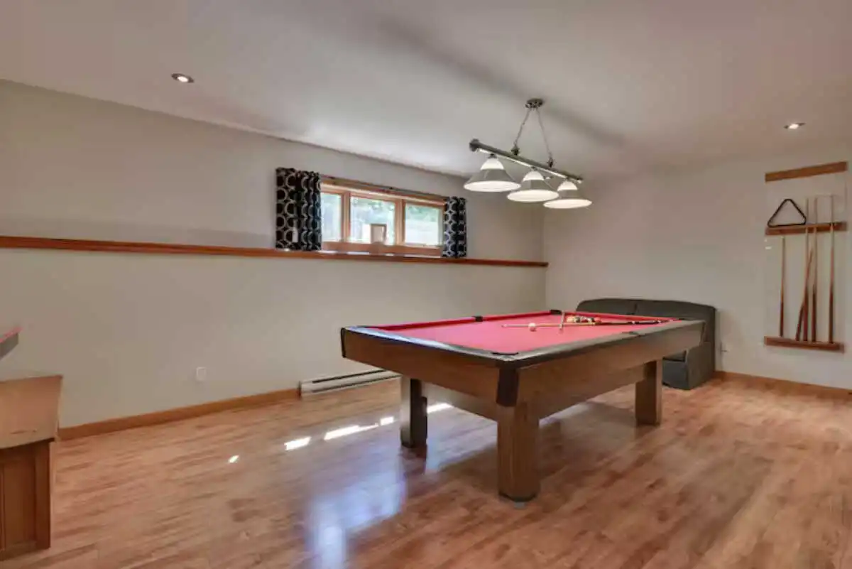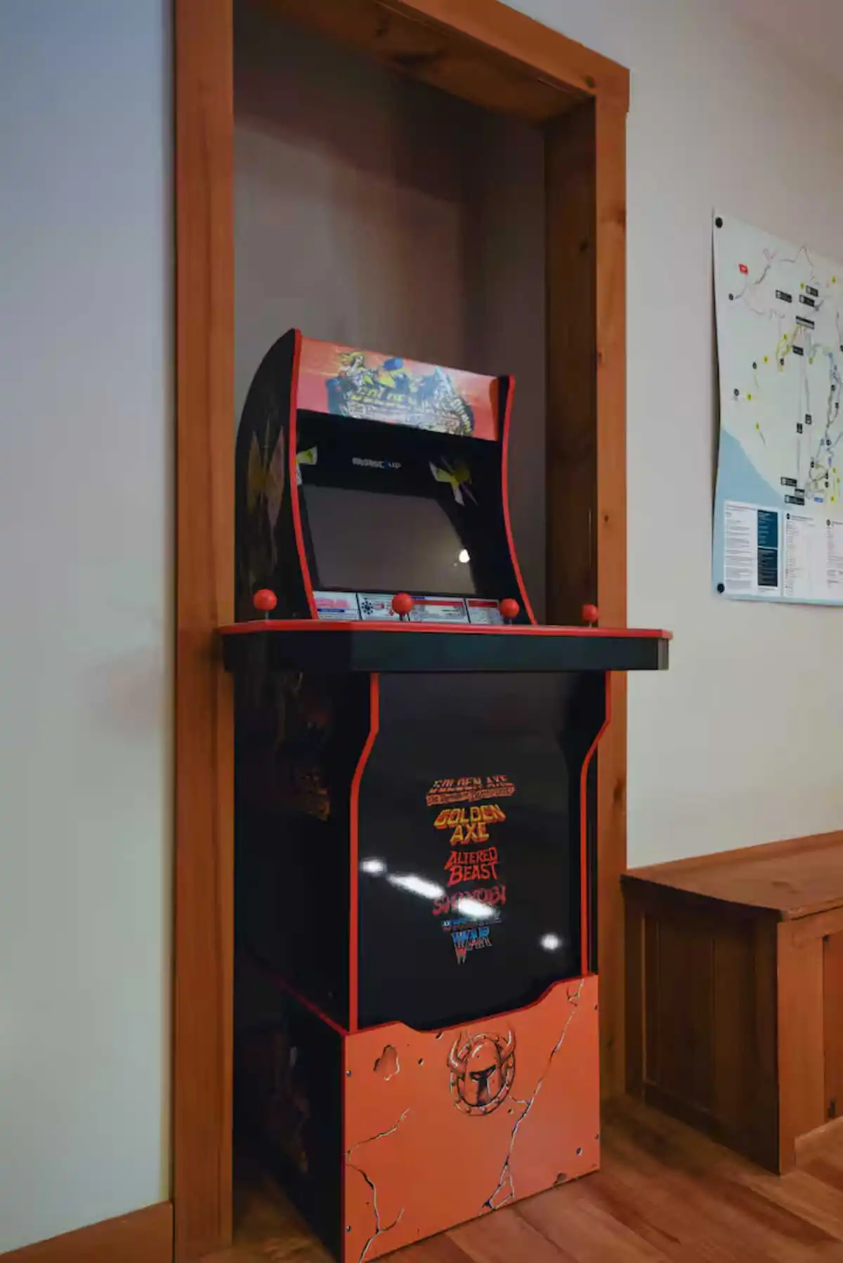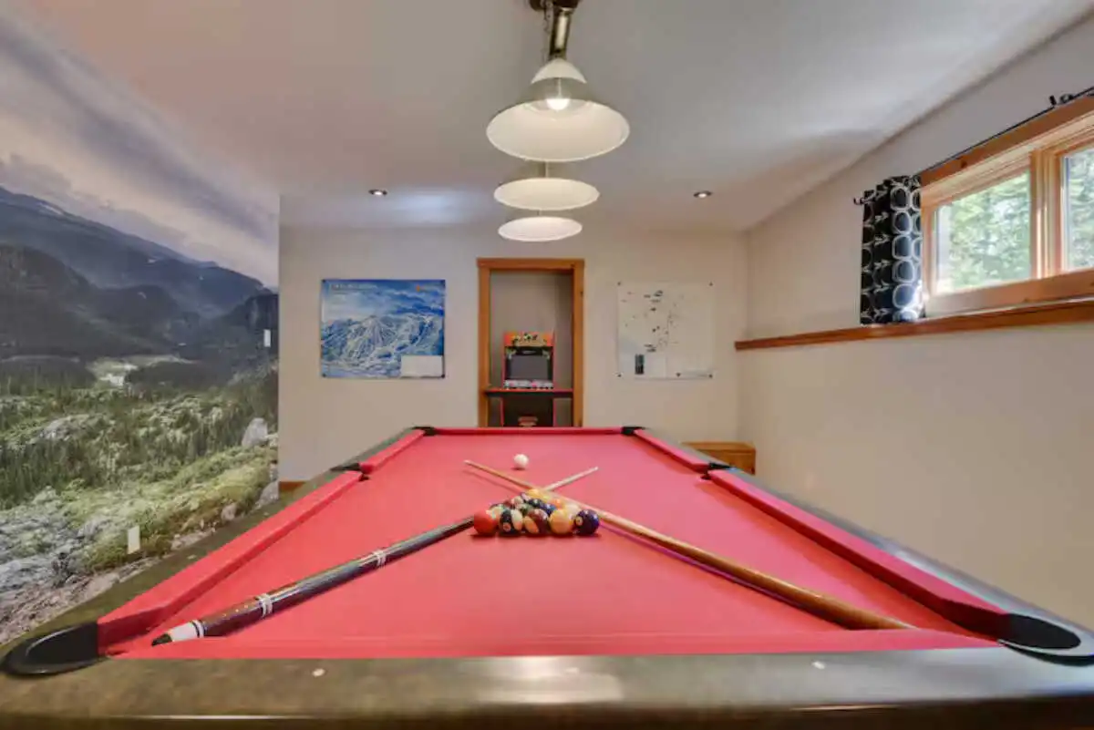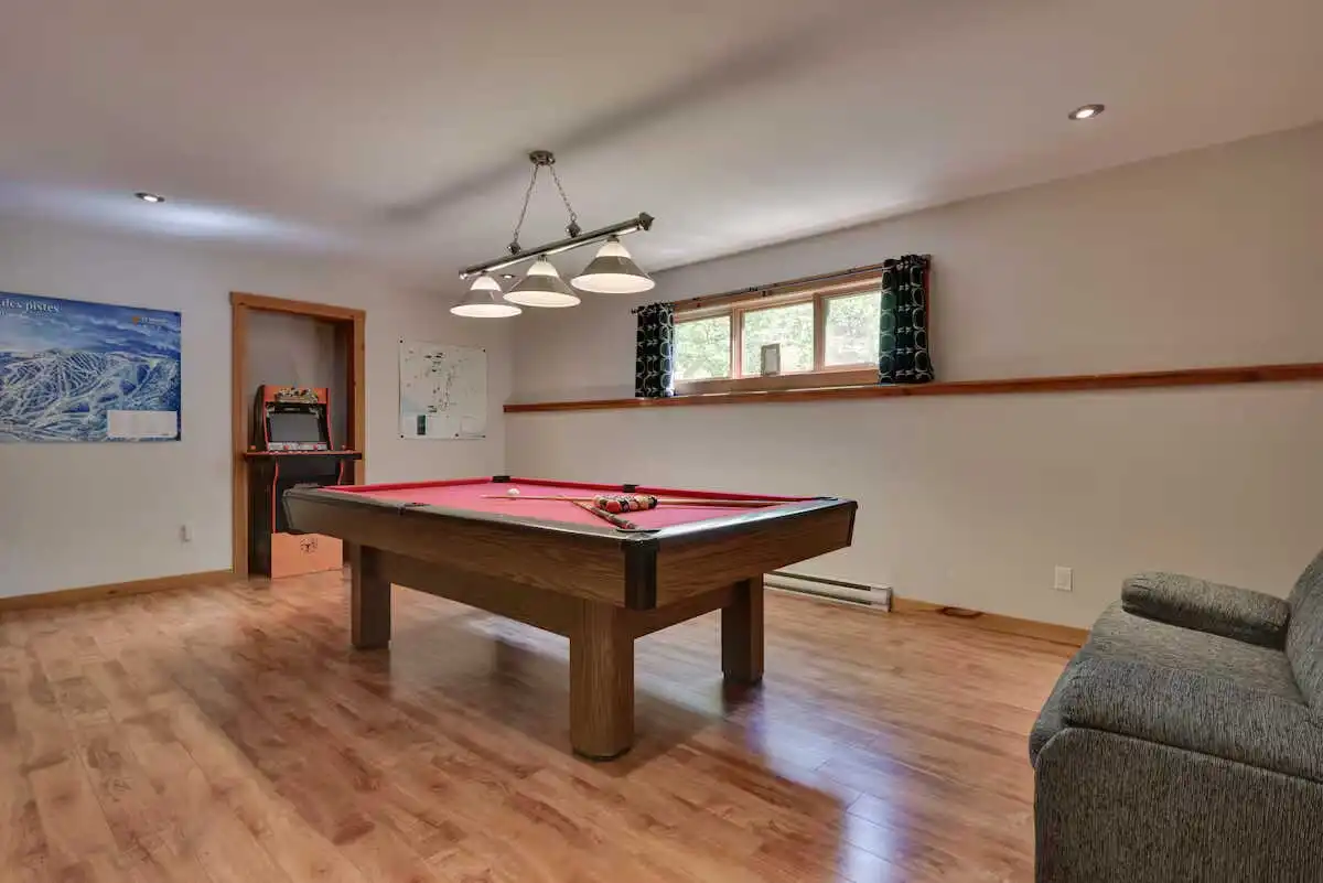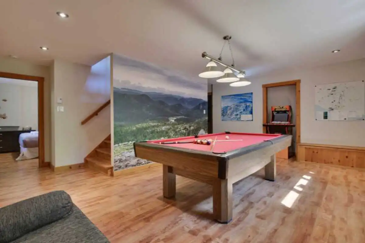 Ce chalet chaleureux et luxueux vous séduira avec ses cinq chambres et ses trois salles de bains, pouvant accueillir jusqu'à 12 personnes. Détendez-vous dans le spa et profitez du jeu d'arcade à quatre joueurs. Le salon est accueillant avec sa cheminée et son mur en pierre haut de plafond. Profitez d'une partie de billard avec vos proches pour passer un moment agréable.