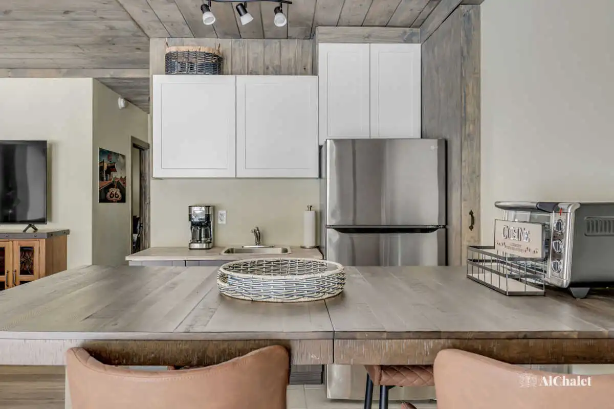 Route 66 propose également une cuisine entièrement équipée, et un espace cuisinette, idéal pour cuisiner à plusieurs et partager de délicieux repas. La terrasse, dotée d’un BBQ, vous permettra de profiter des douces soirées estivales autour d’un souper grillé sous les étoiles.