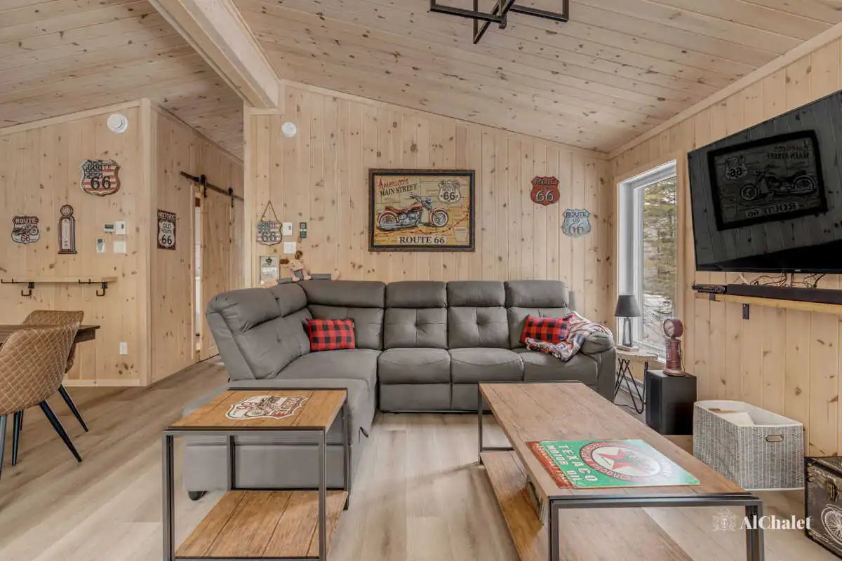 Entouré de forêt, le chalet offre une immersion en pleine nature, avec une terrasse et un spa privé pour un moment de relaxation après une journée d’activités. Route 66 allie confort, divertissement et évasion, offrant une expérience inoubliable à ses visiteurs.