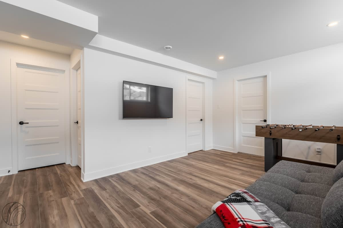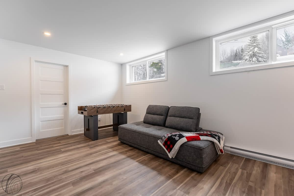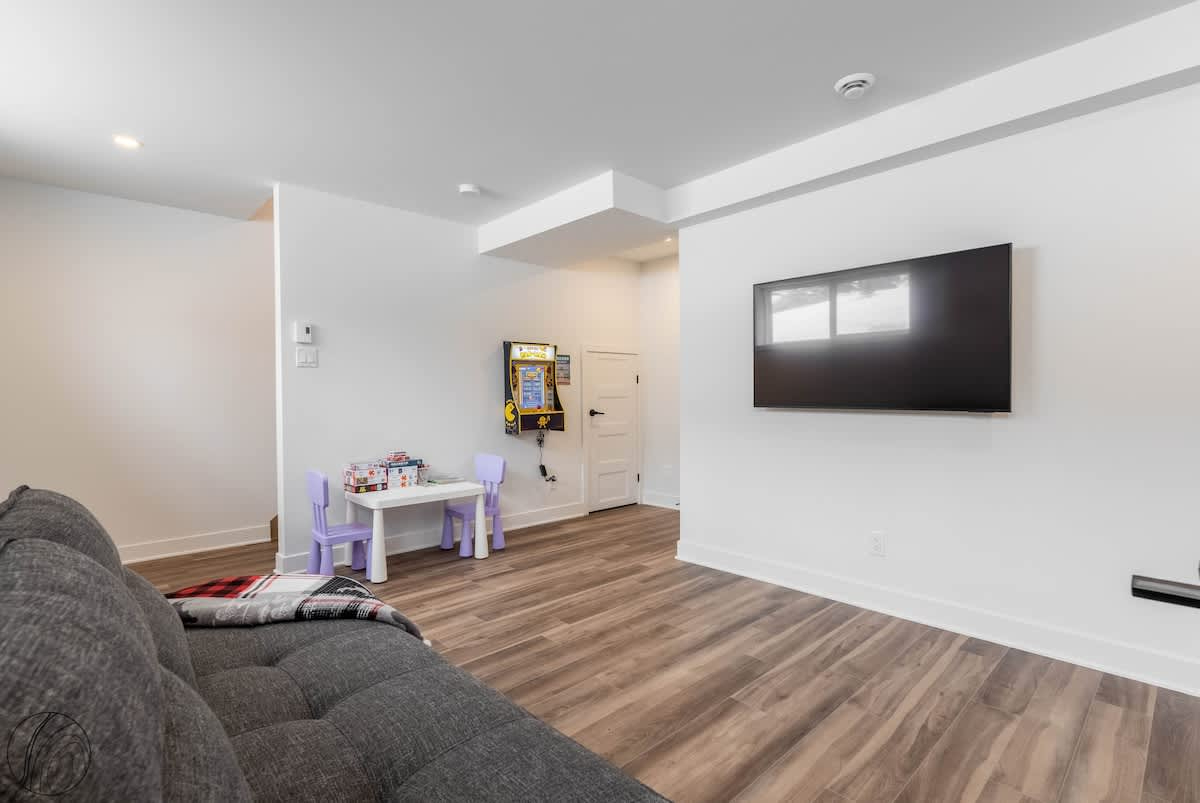 Profitez d’un espace de divertissement unique au sous-sol avec une table de babyfoot 3 en 1 et une arcade Pac-Man, idéal pour petits et grands. Détendez-vous au salon devant le foyer au propane ou plongez dans le spa extérieur... Lire la suite