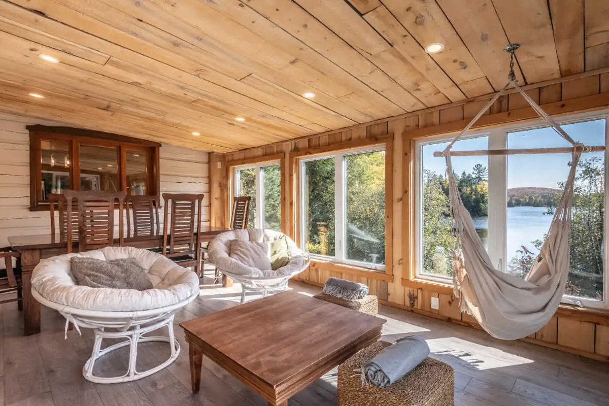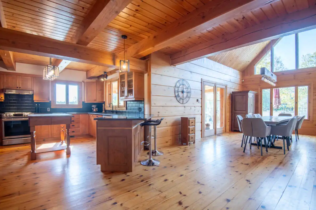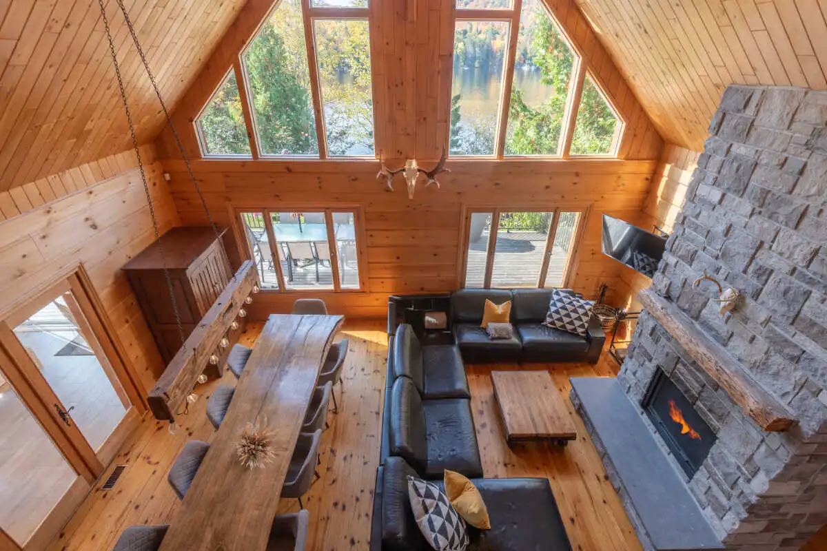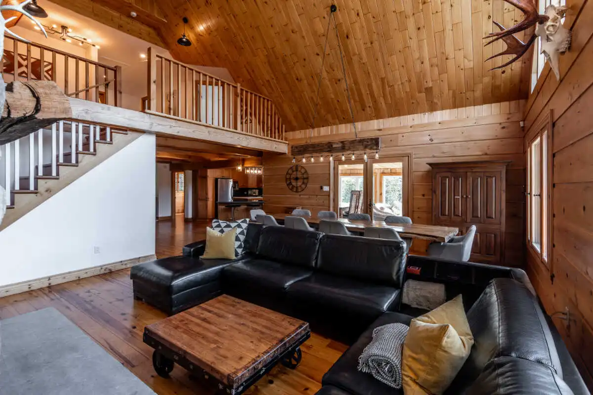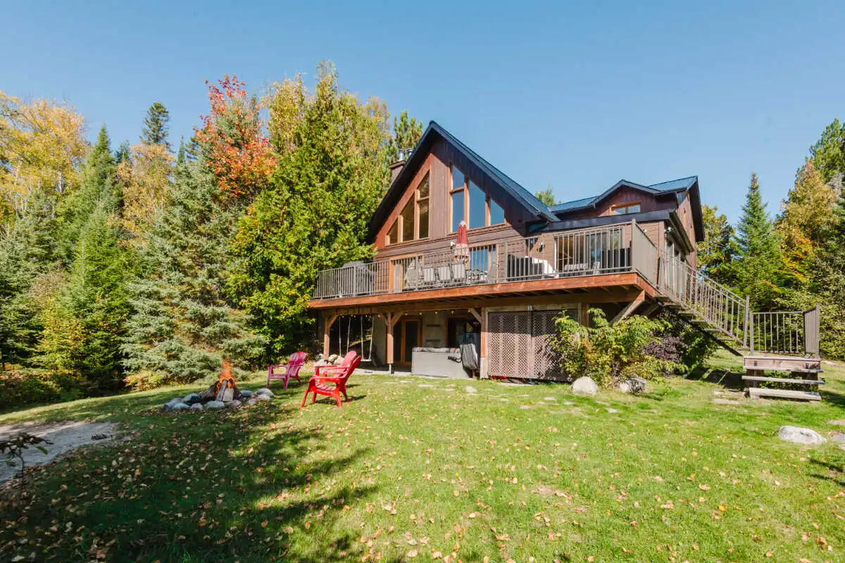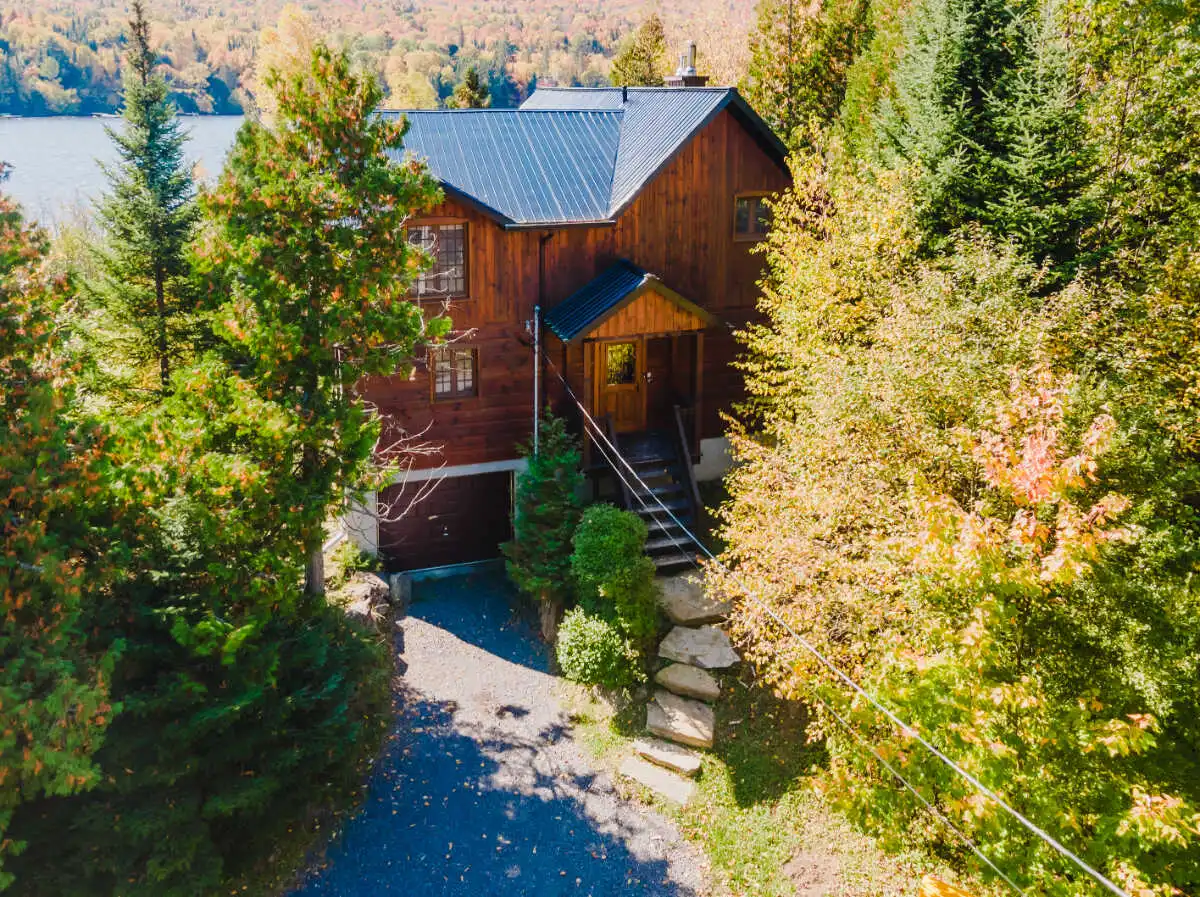 Directement sur le lac Ouareau avec accès à 2 quais sur un terrain plat de plus de 120 pieds de façade, cette propriété pièce sur pièce de type Bondu charme par son cachet unique.