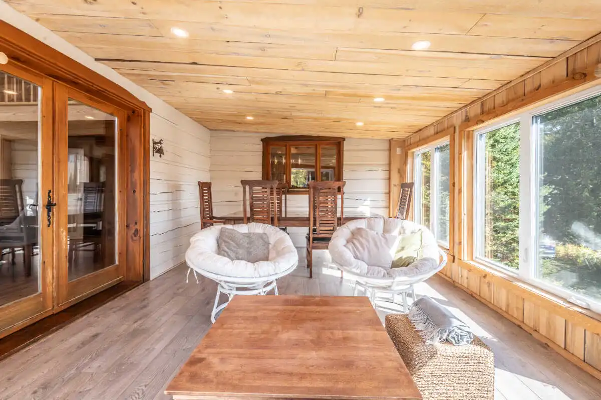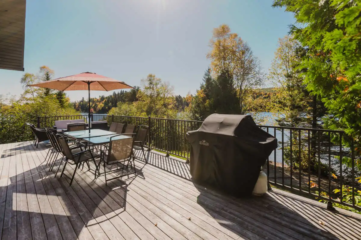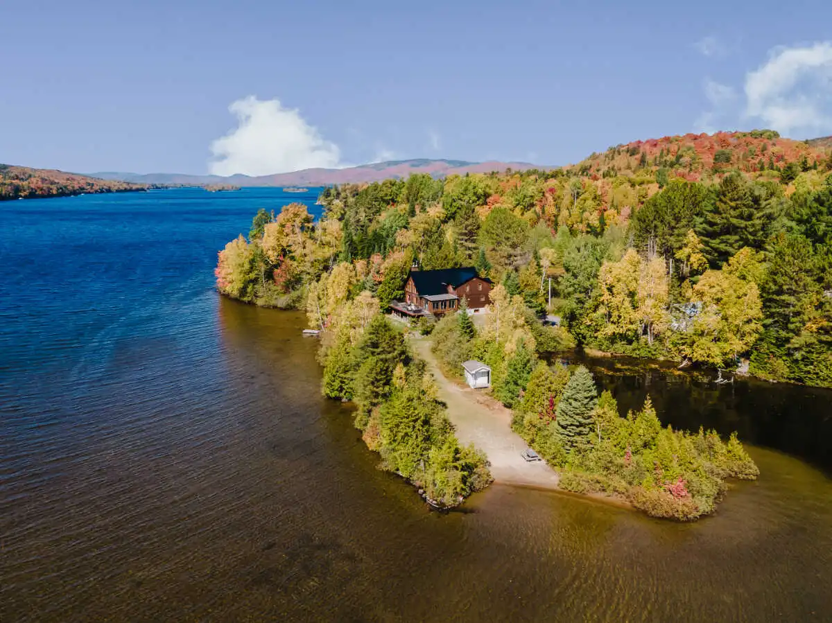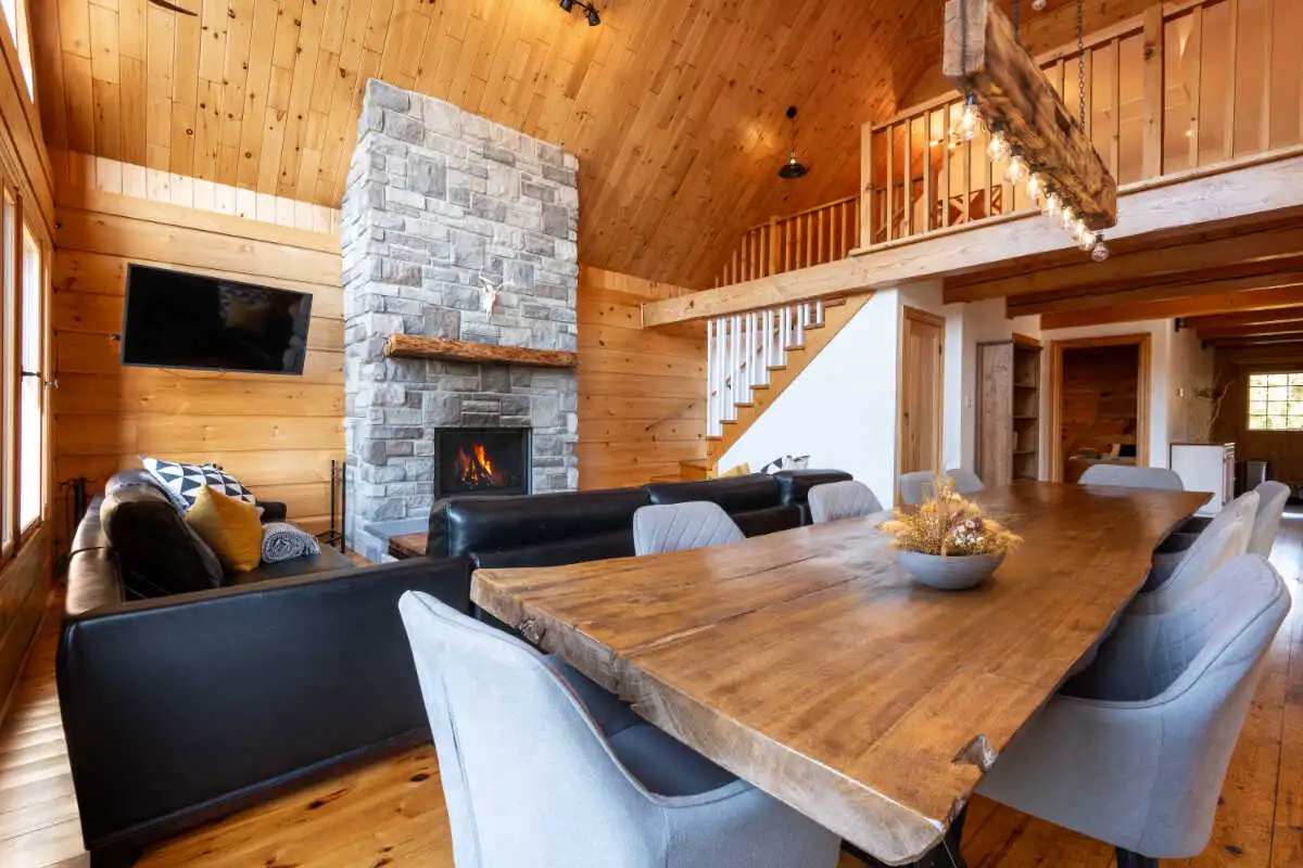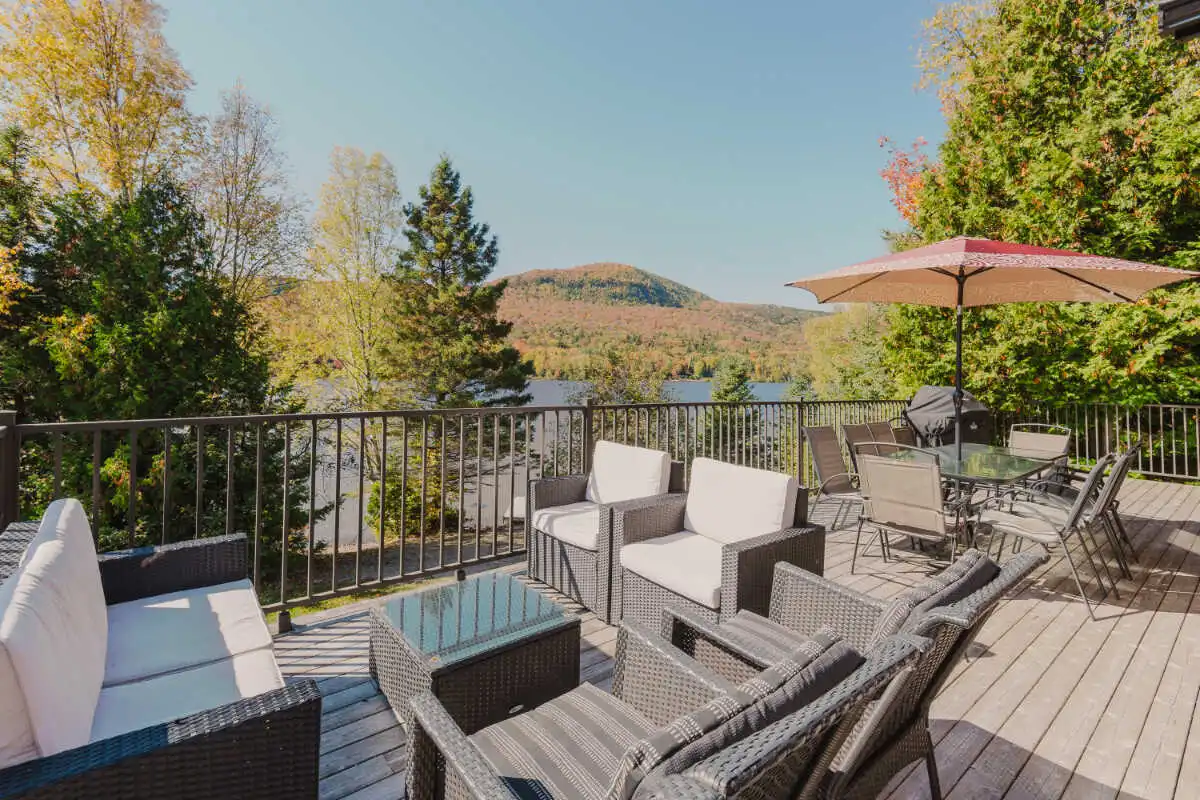 Directement sur le lac Ouareau avec accès à 2 quais sur un terrain plat de plus de 120 pieds de façade, cette propriété pièce sur pièce de type Bondu charme par son cachet unique.