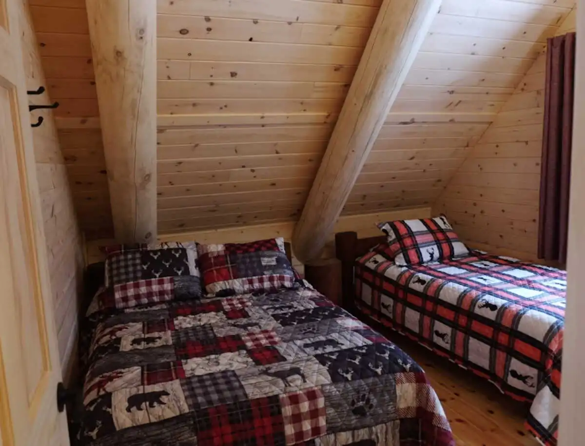 À l’étage : 1 chambre lit Queen, 1 chambre lit double + lit simple