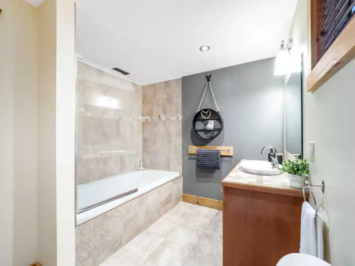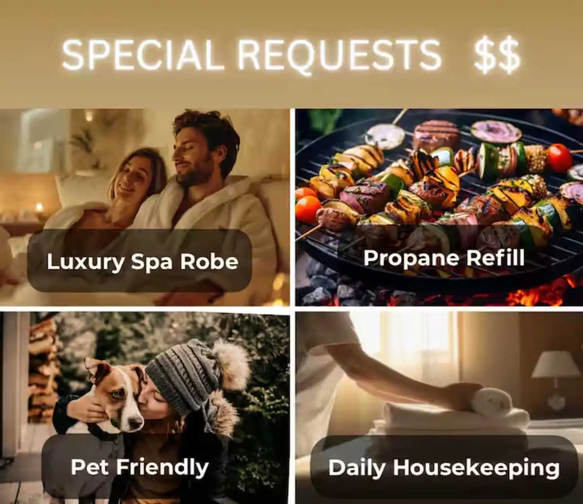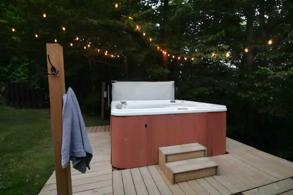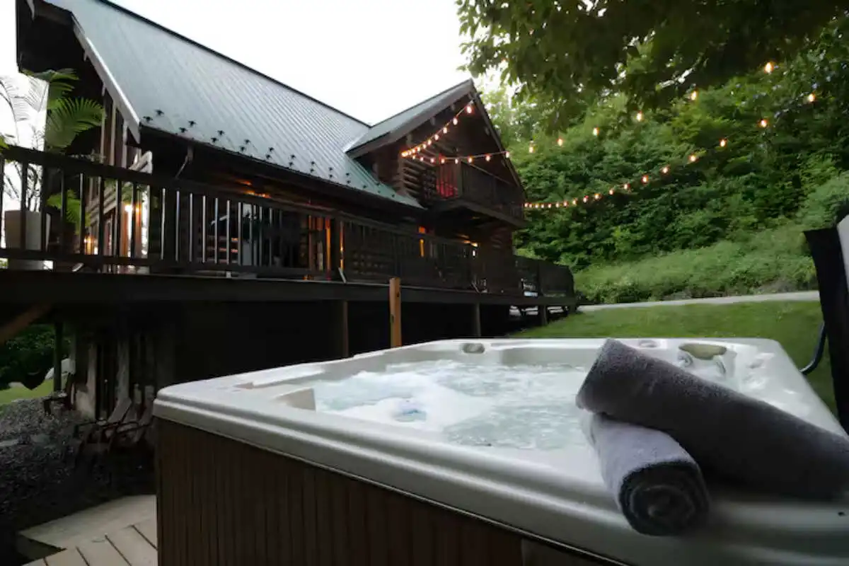 Profitez d’un spa extérieur ouvert toute l’année, d’un foyer intérieur en pierre, d’un foyer extérieur élégant, d’une terrasse massive avec barbecue et table de pique-nique, et d’une véranda avec lumières d’ambiance.