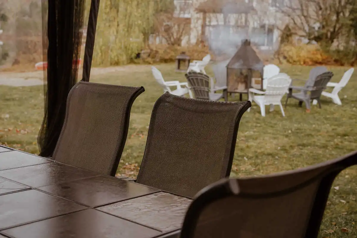 Terrasse avec gazebo, BBQ et foyer extérieur privé