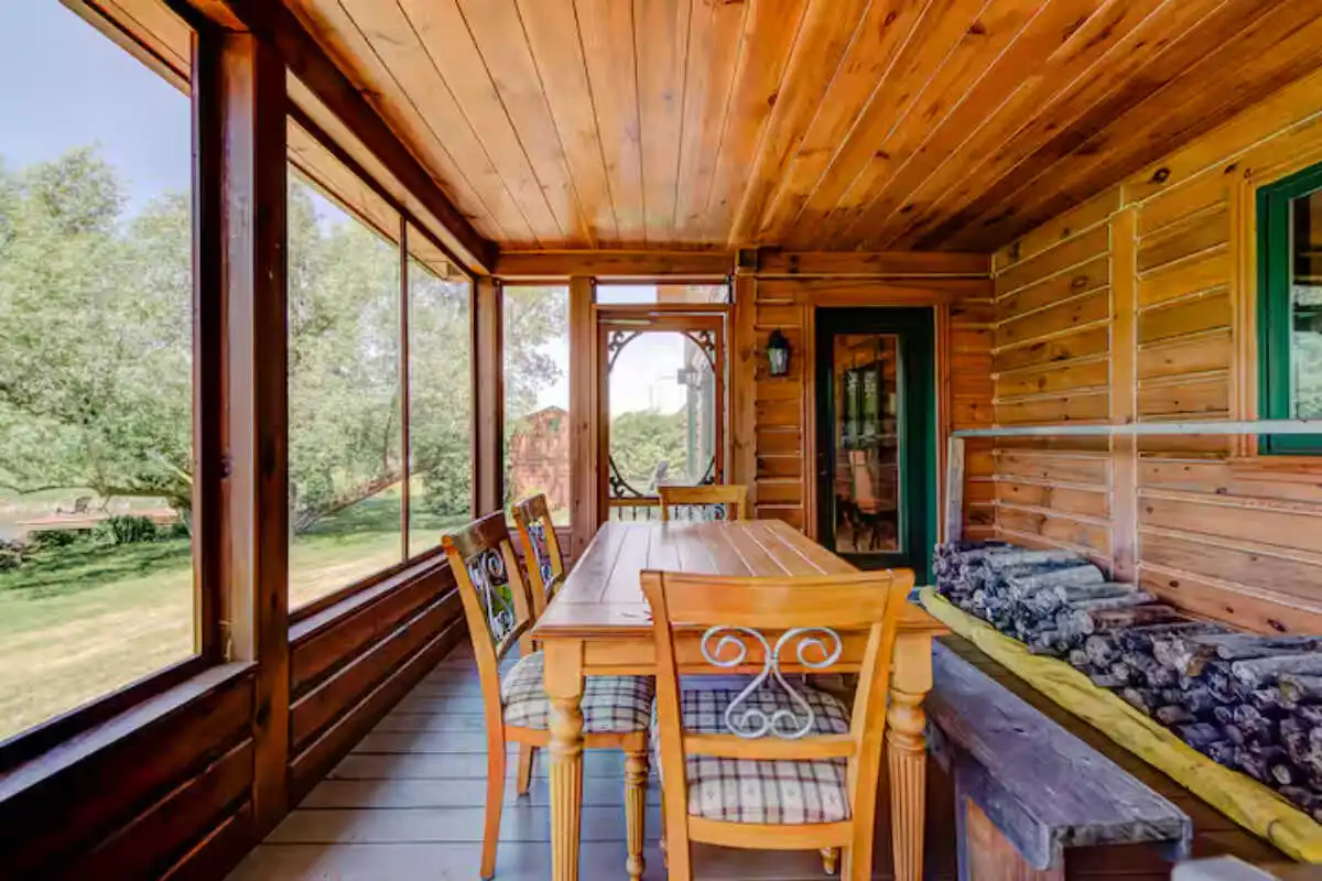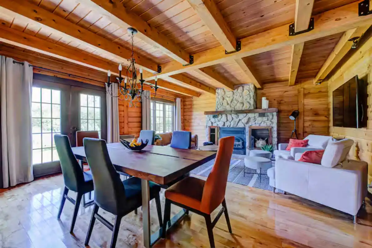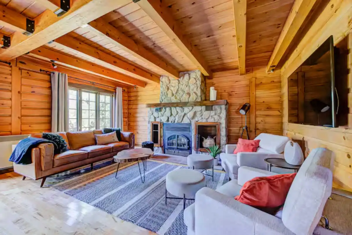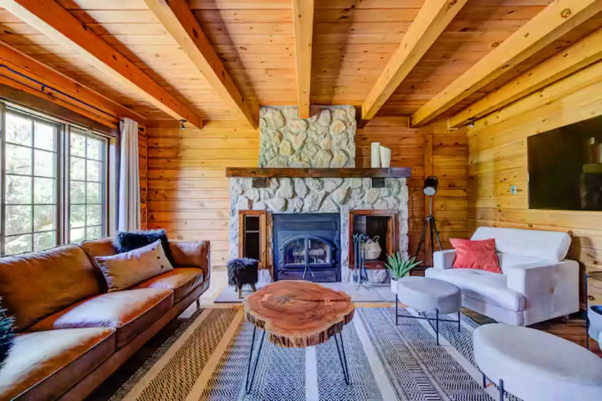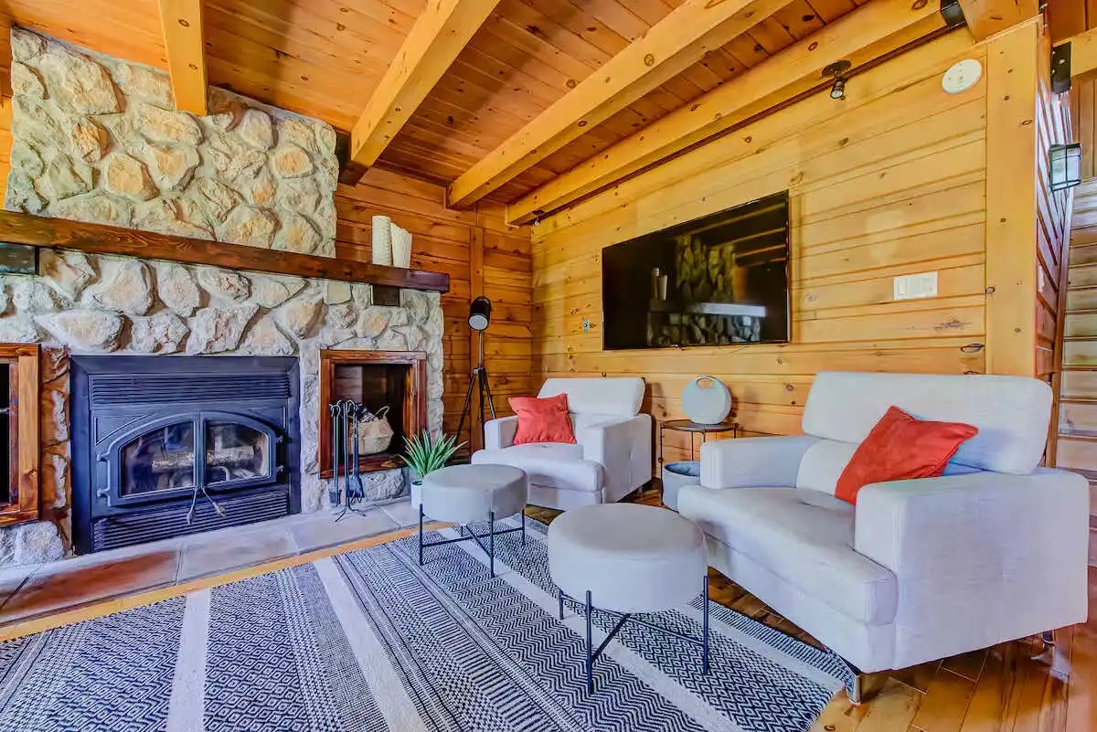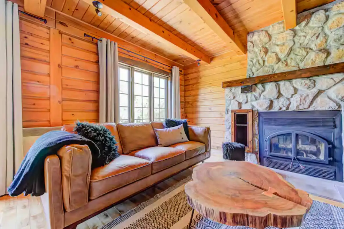 The living room, with its wood-burning fireplace and cozy atmosphere, is the perfect place to relax after a busy day.