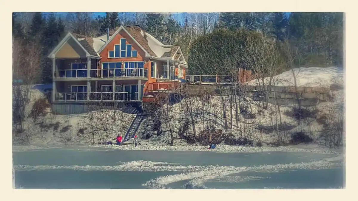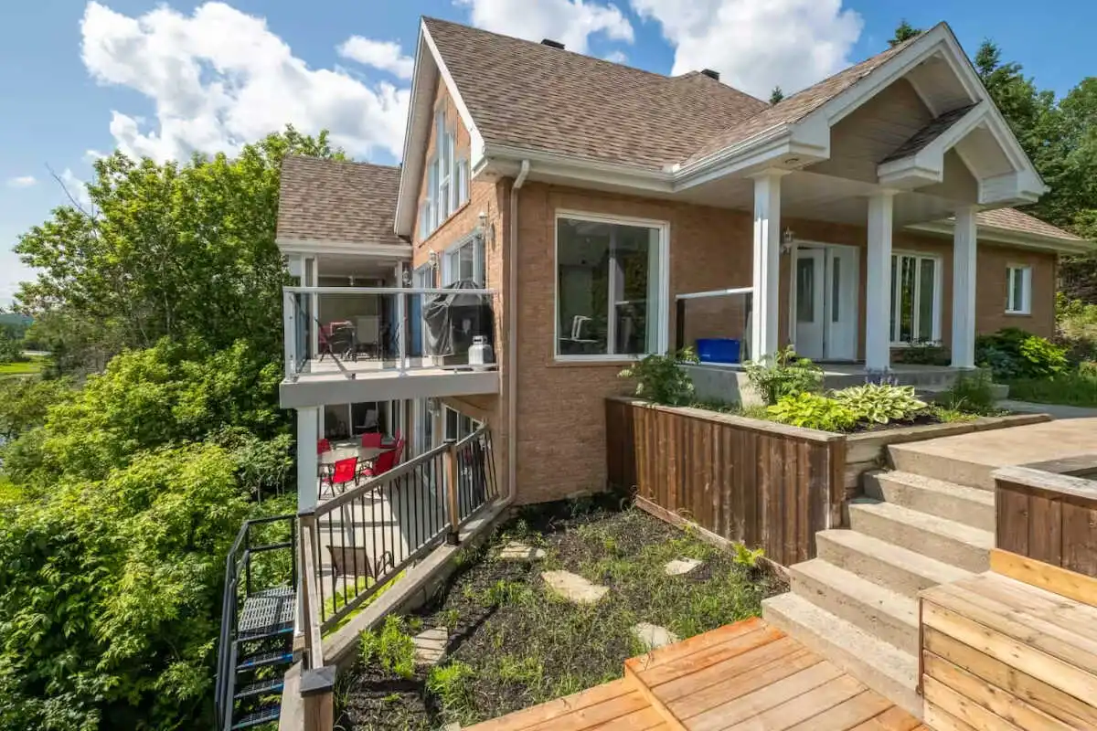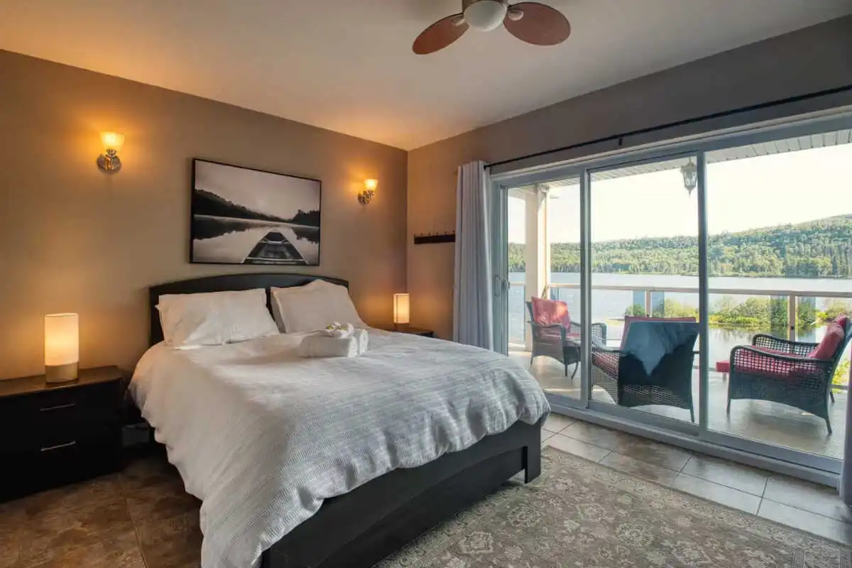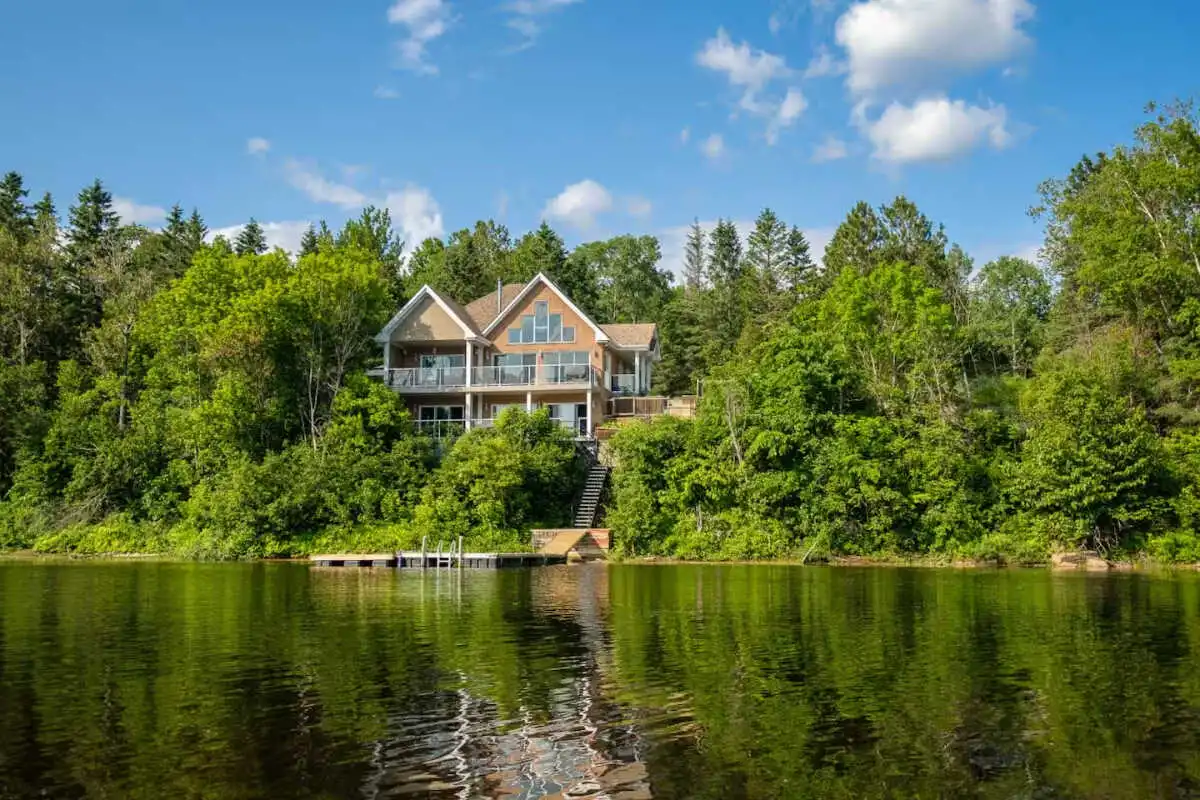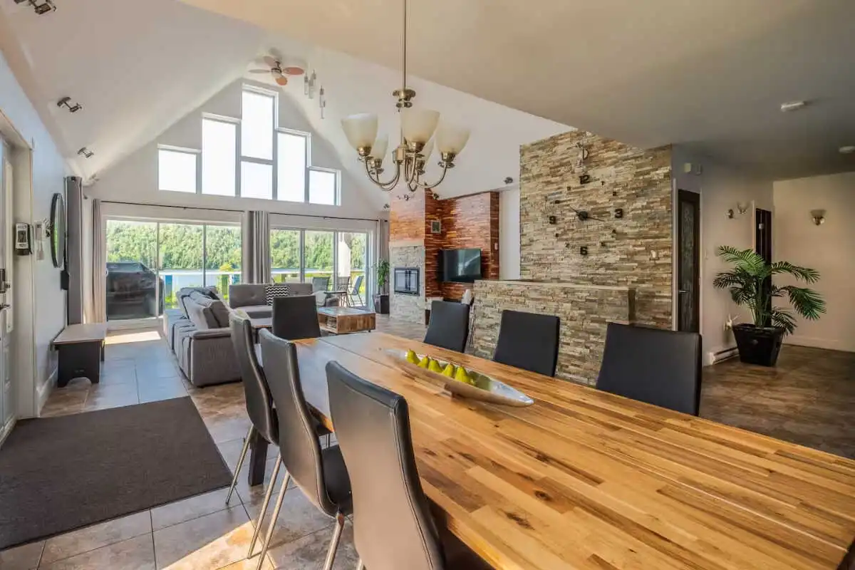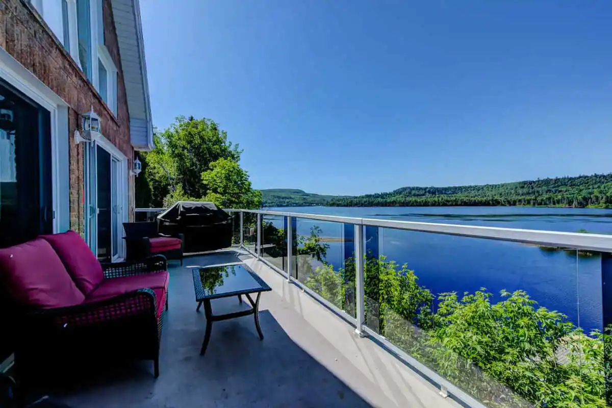 For added privacy, the master bedroom is adjacent to its private bathroom. Admire the outdoor space and splendid river views from the wooden patio (with outdoor fireplace), the dock or one of the large stacked glass balconies. Or warm up by the indoor fireplace in the generous cathedral-ceilinged main living room. Feel like cooking? A fondue stove and 4-season BBQ are also available to awaken the cook in you. Board games, a pool table and Wi-Fi internet access are available to keep young and old busy.