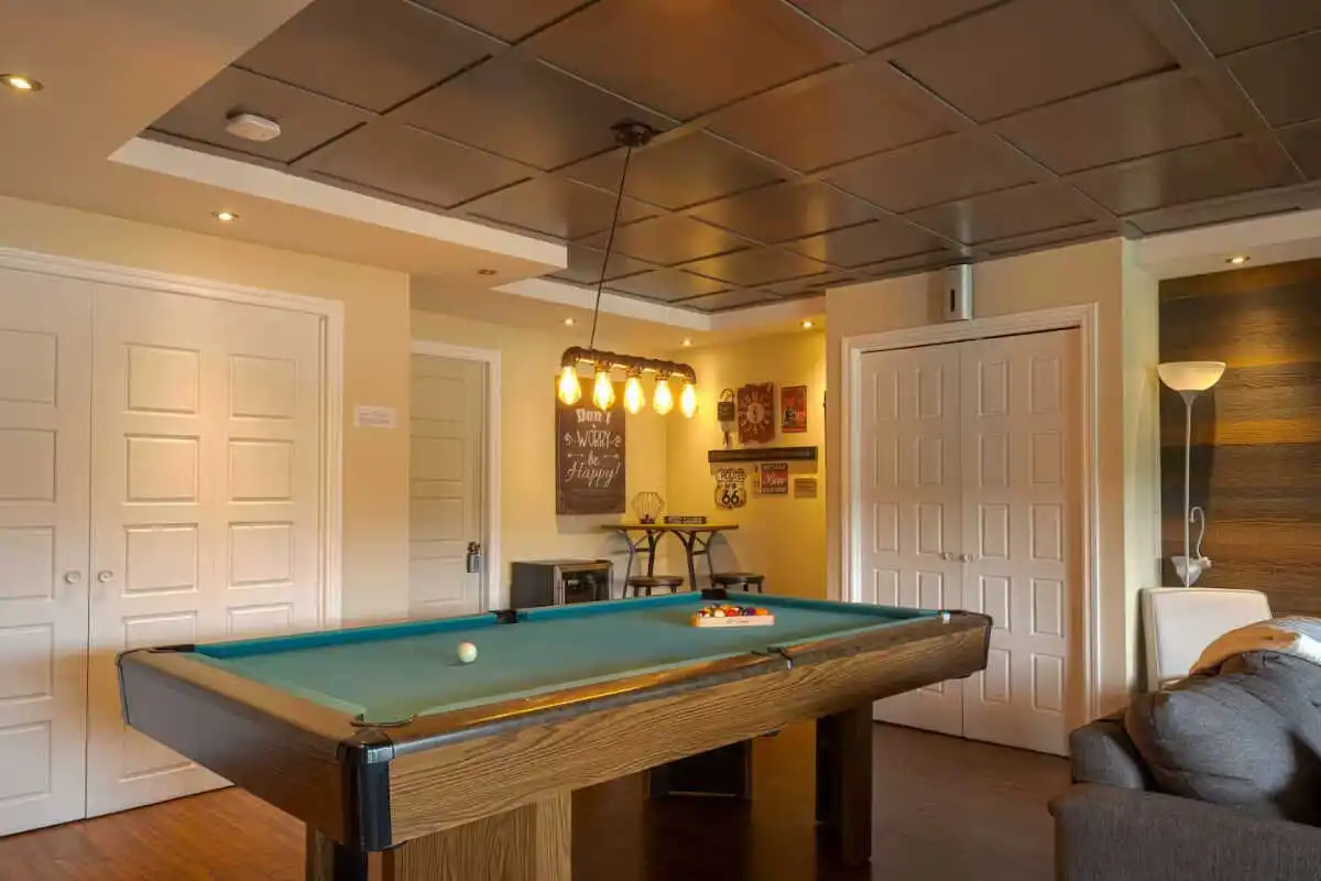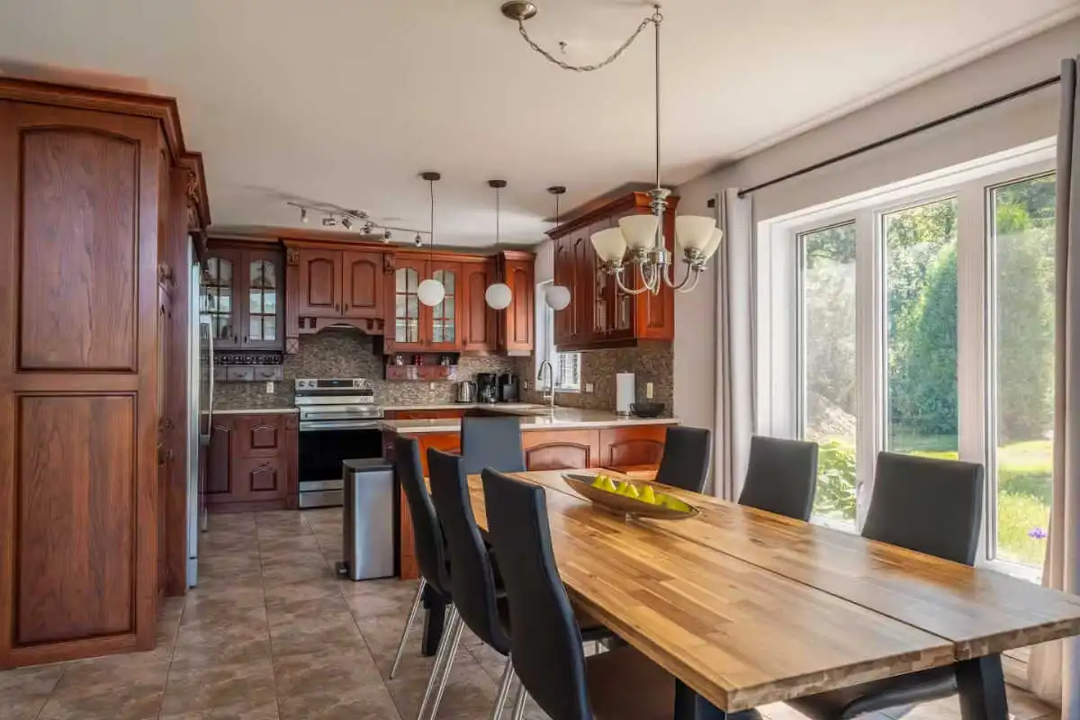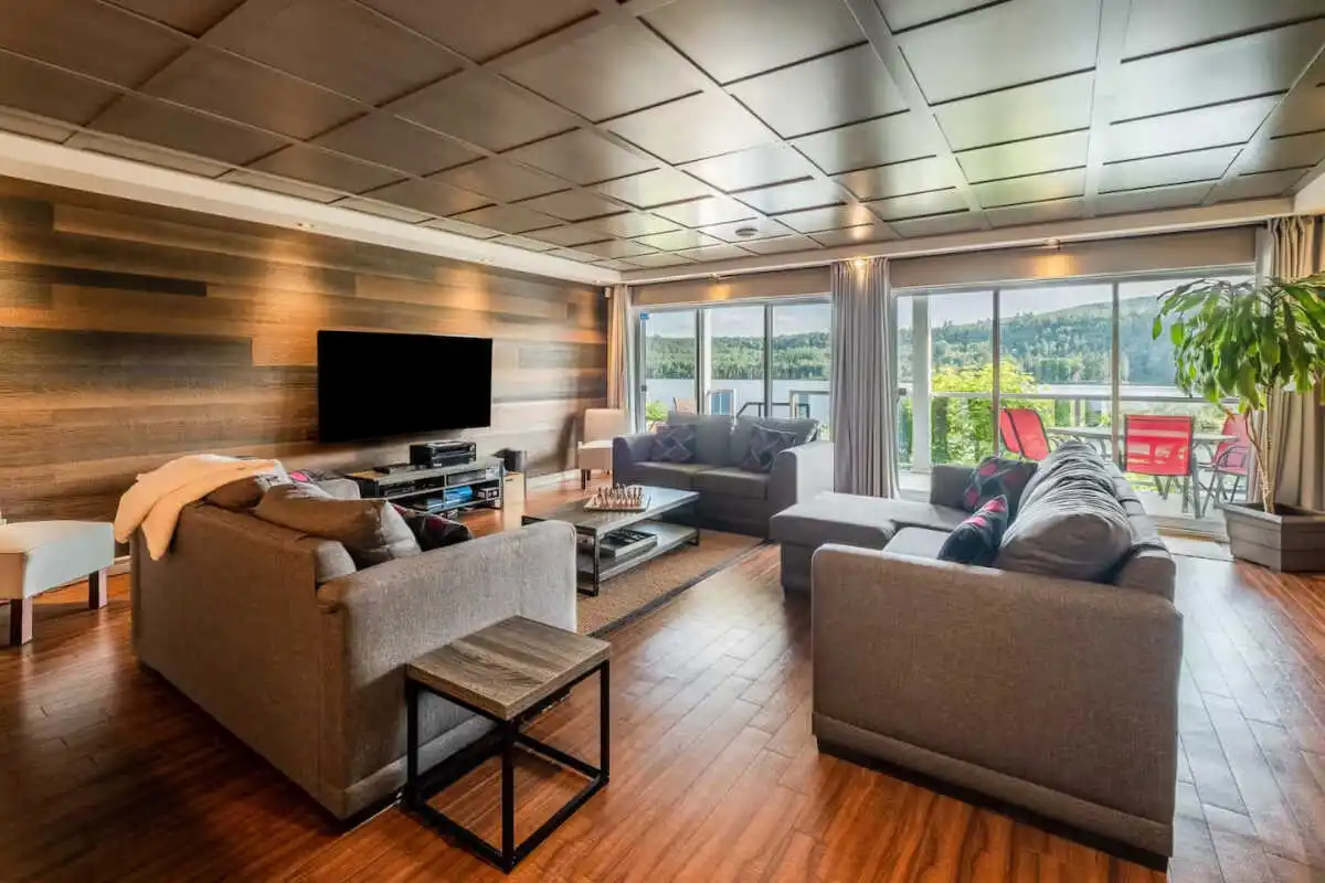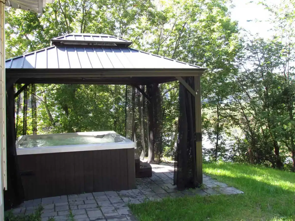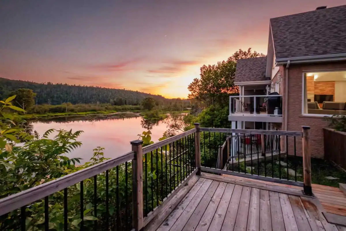 For added privacy, the master bedroom is adjacent to its private bathroom. Admire the outdoor space and splendid river views from the wooden patio (with outdoor fireplace), the dock or one of the large stacked glass balconies. Or warm up by the indoor fireplace in the generous cathedral-ceilinged main living room. Feel like cooking? A fondue stove and 4-season BBQ are also available to awaken the cook in you. Board games, a pool table and Wi-Fi internet access are available to keep young and old busy.